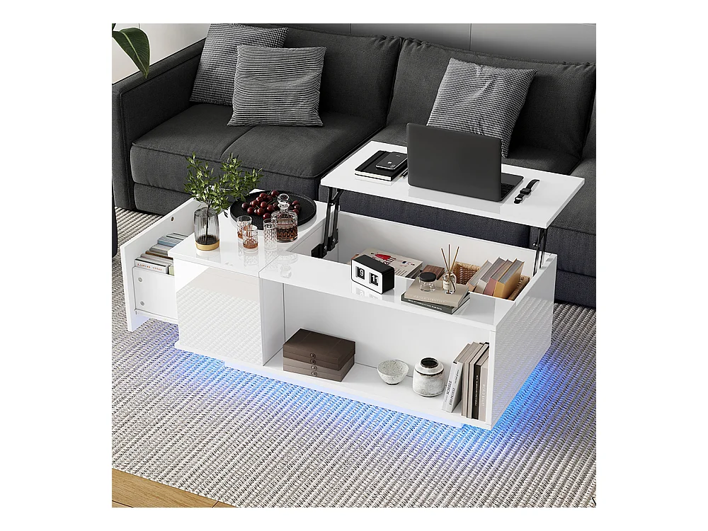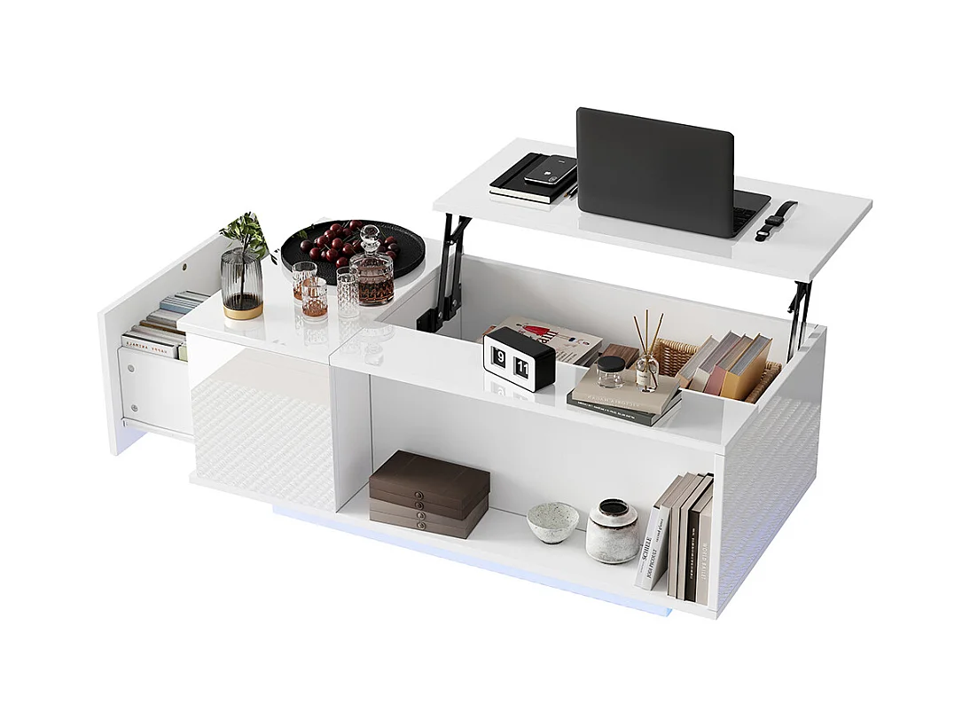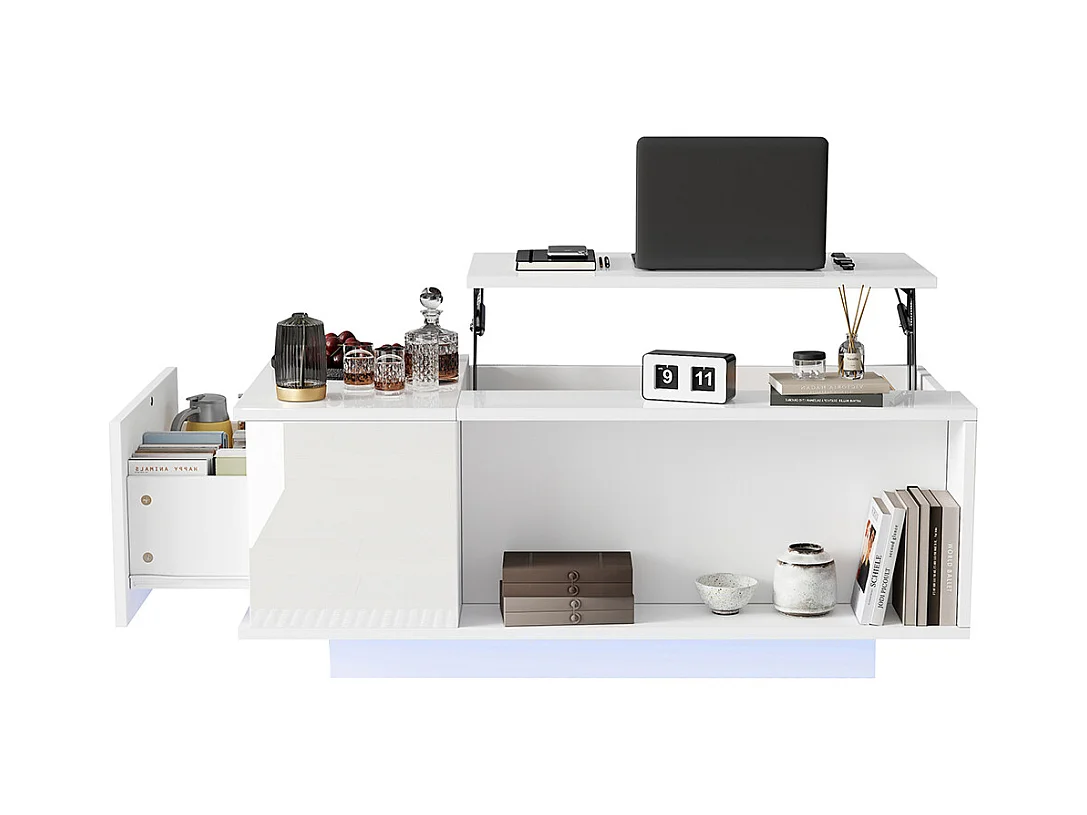Table basse relevable avec rangement intelligent et LED, suface laqué blanc