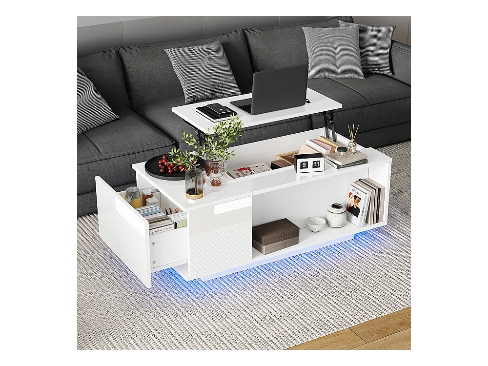 Table basse relevable LED réglable hauteur à 46.5 cm rangement caché tablette brillante salon blanc