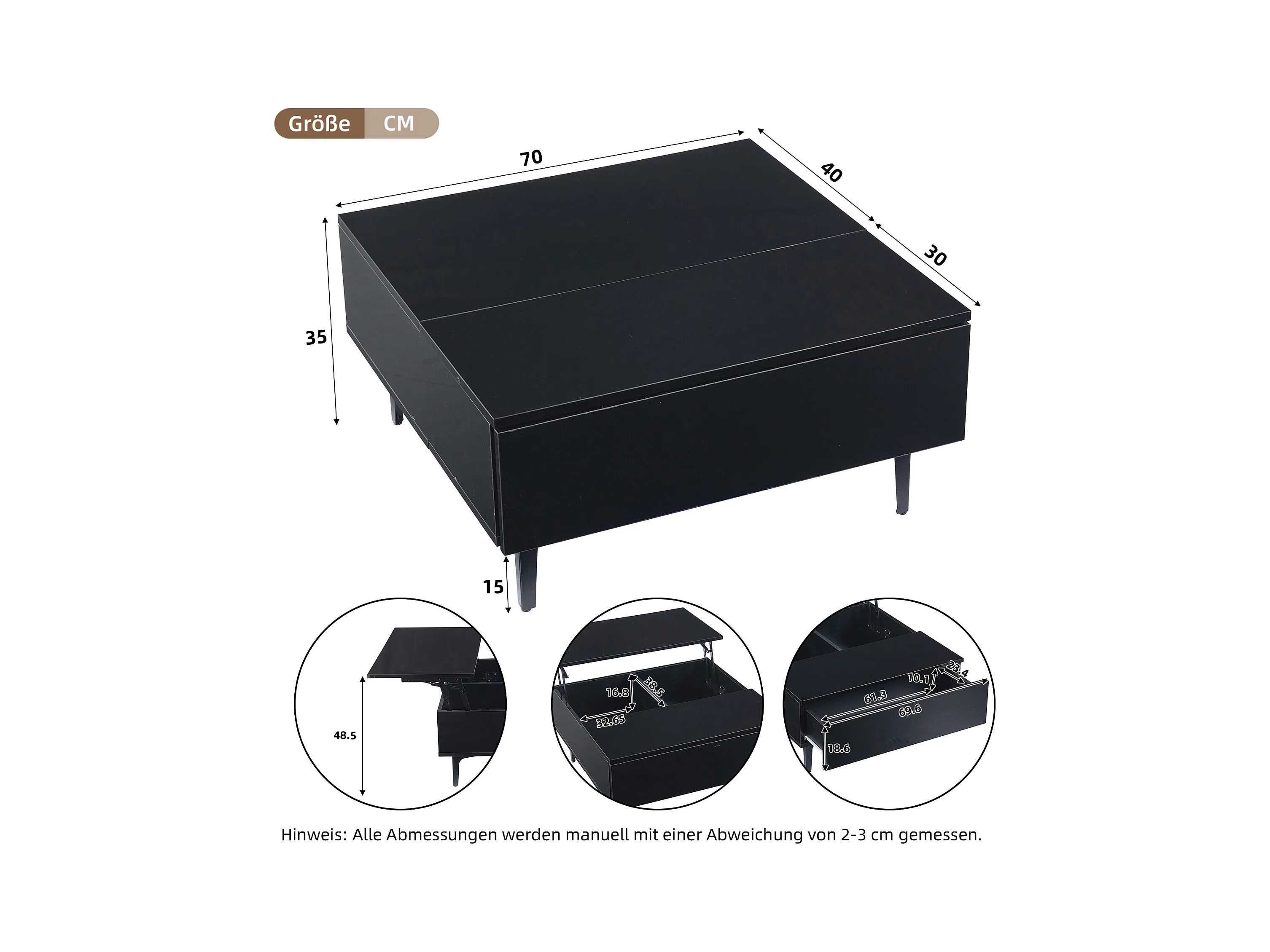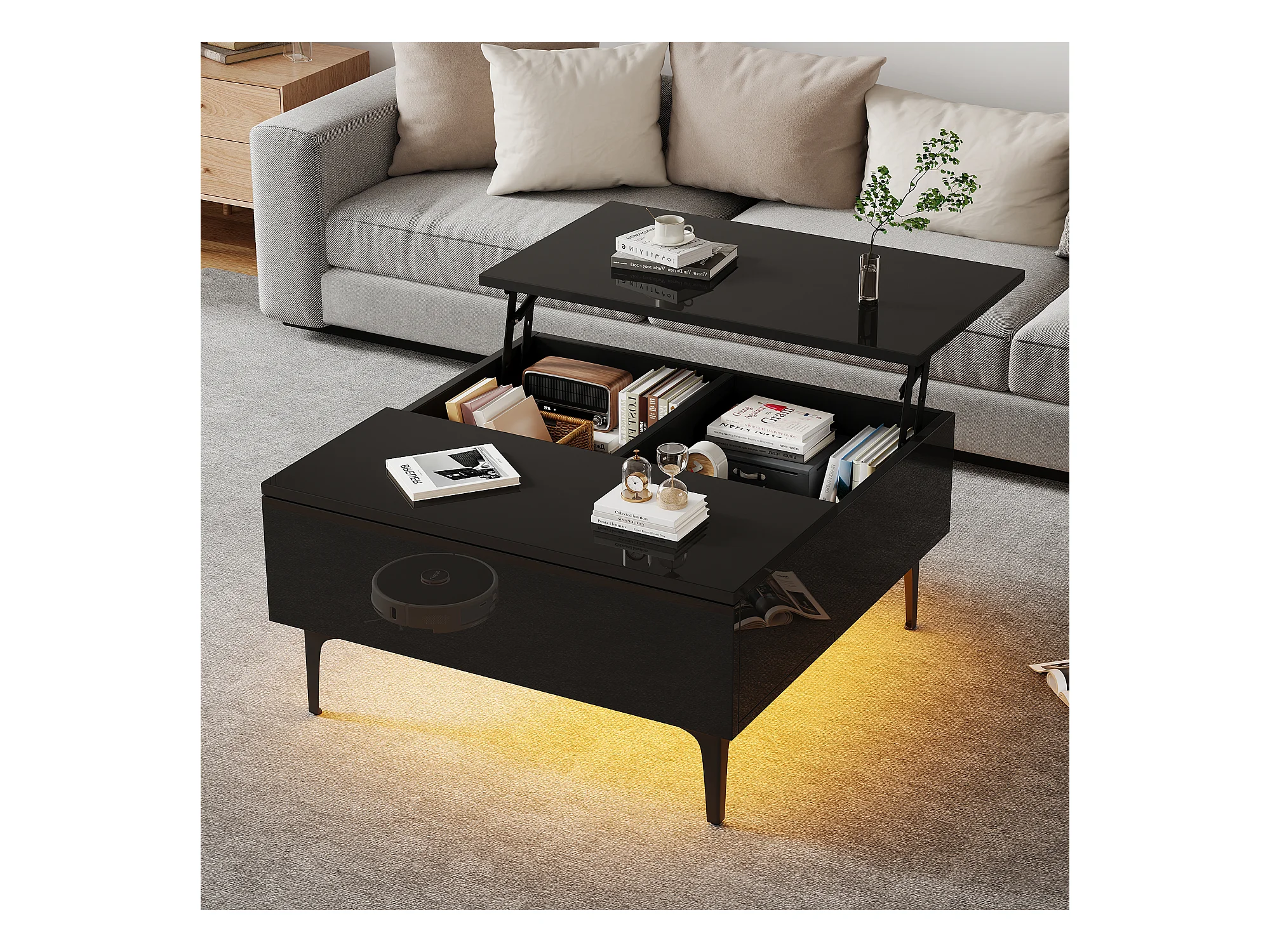 Table basse réglable - 70 x 70 x 35 cm - avec 1 tirors + étagères cachés + Leds - MDF - noir