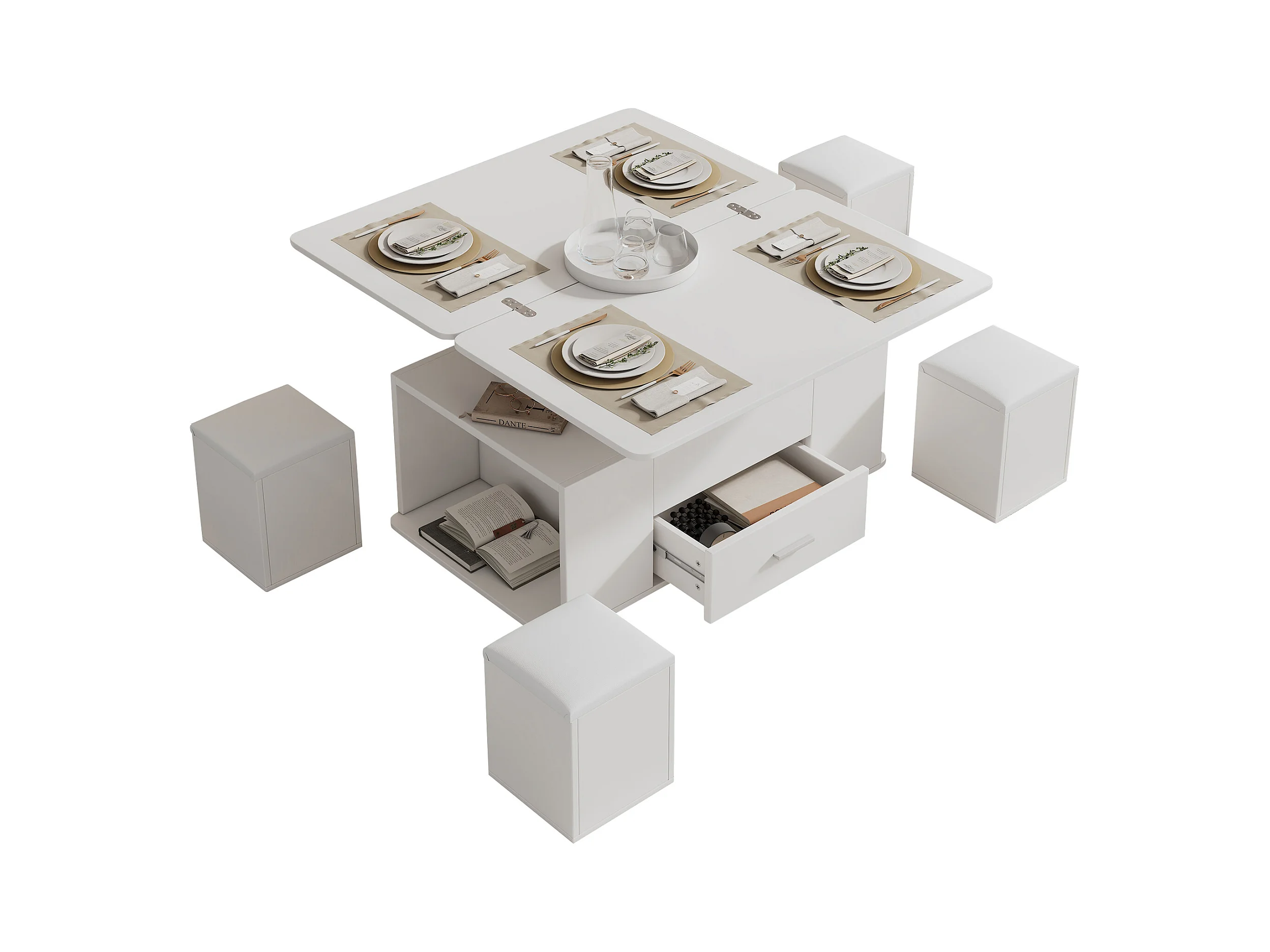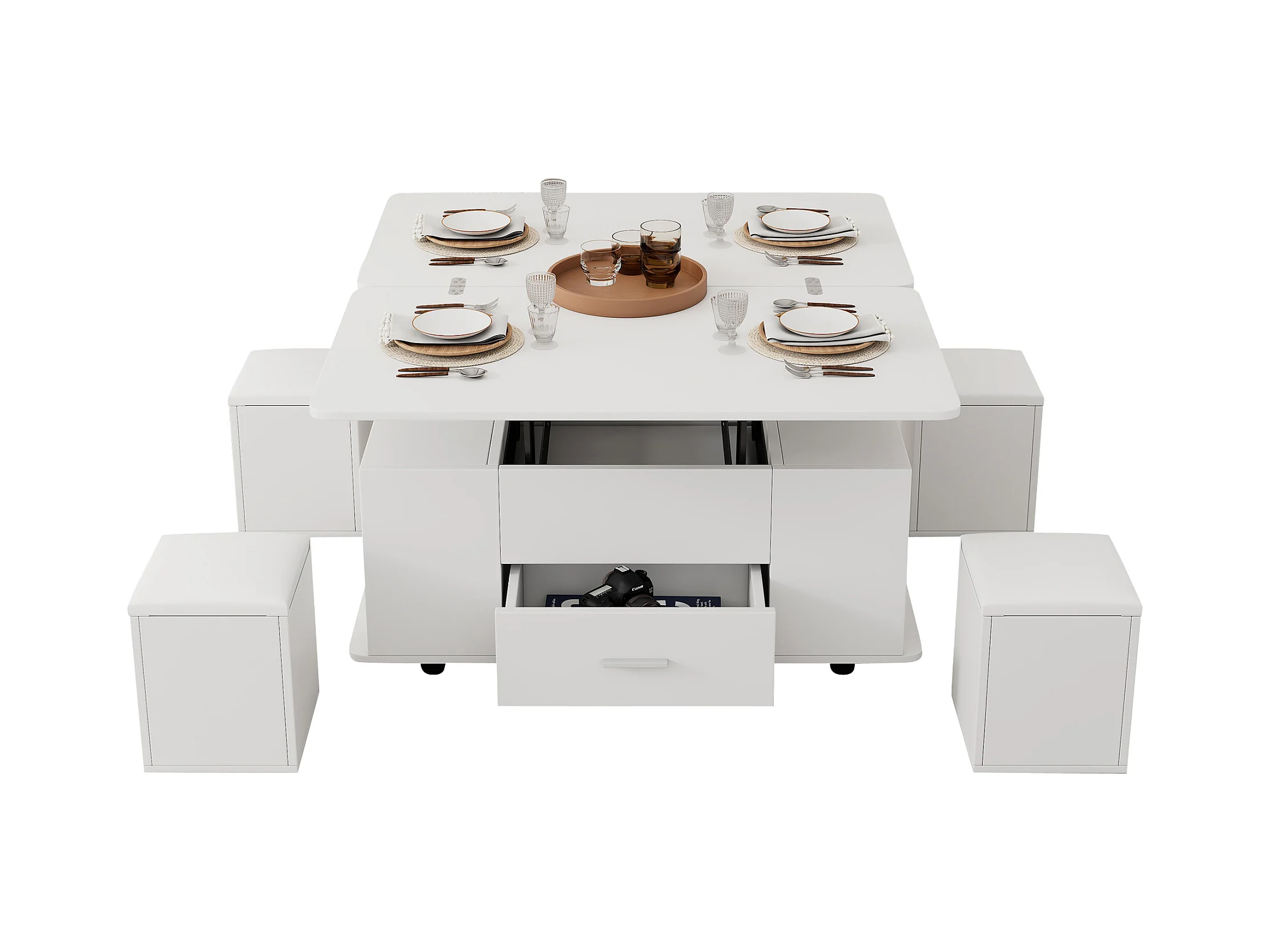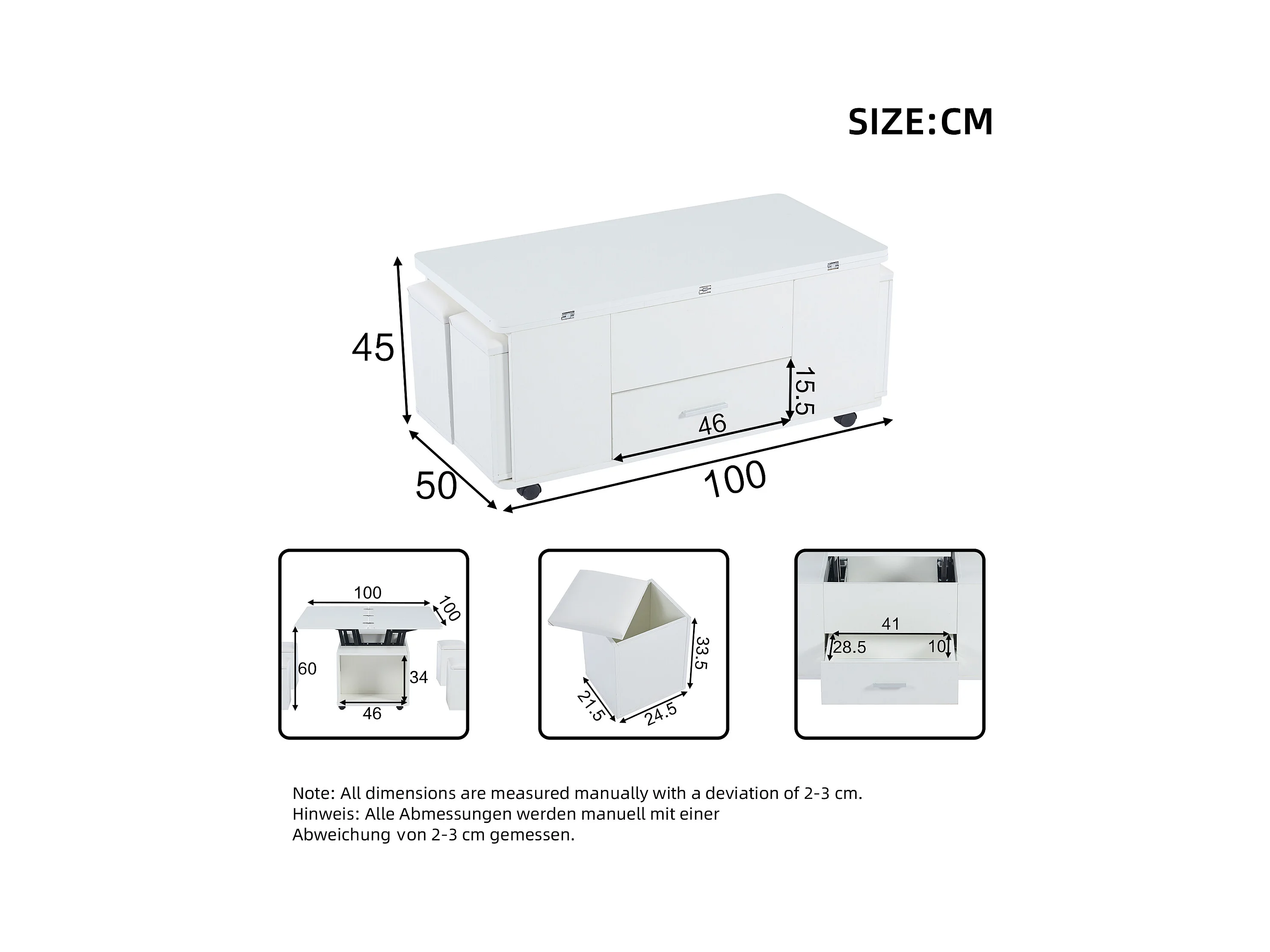 Table basse réglable en hauteur 100x50x45cm - multifonction 4 en 1 - avec 1 tiroir - avec 4 tabourets - blanc