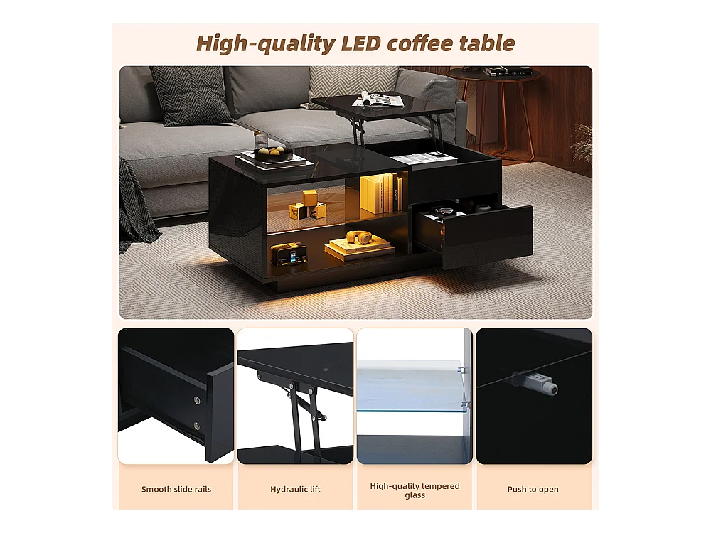 Table basse avec éclairage LED et espace de rangement moderne noire brillante caché table d'appoint avec élévation hydraulique