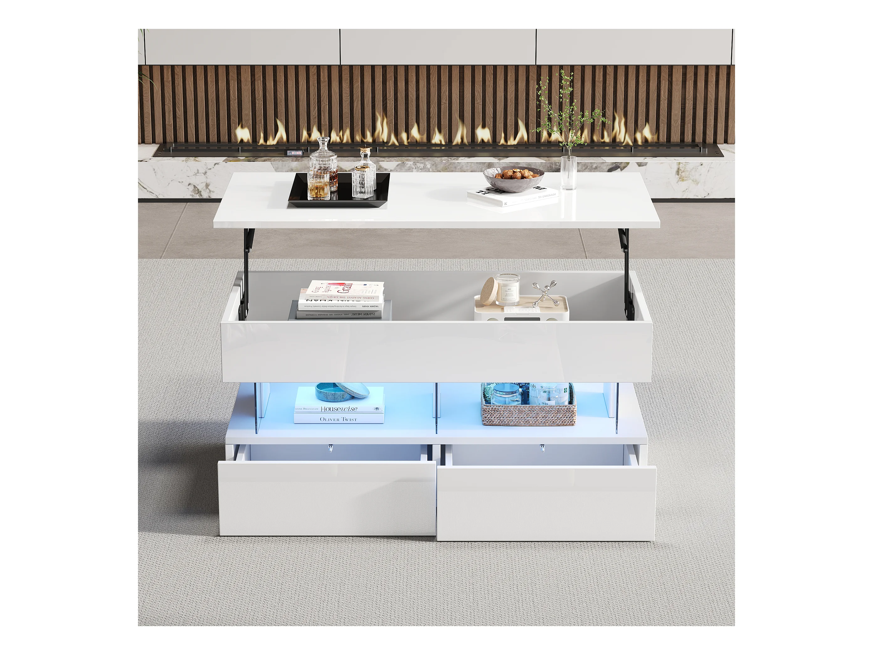 Table basse relevable - 120 x 50 x 46 cm - rangement dissimulé + Leds + 2 tiroirs - MDF + verre trempé - blanc