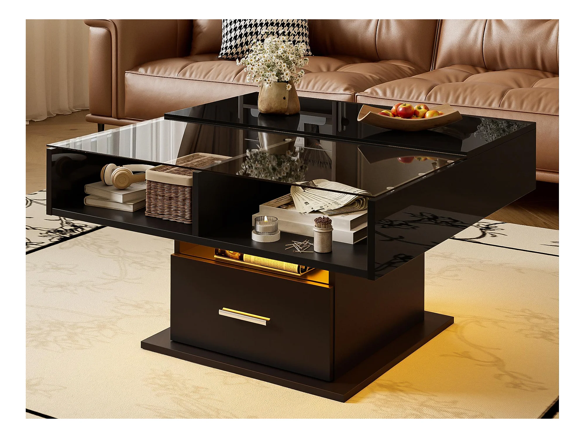 Table basse relevable 78x78x45.5cm - avec éclairage LED - 1 tiroir - étagères ouvertes - noir