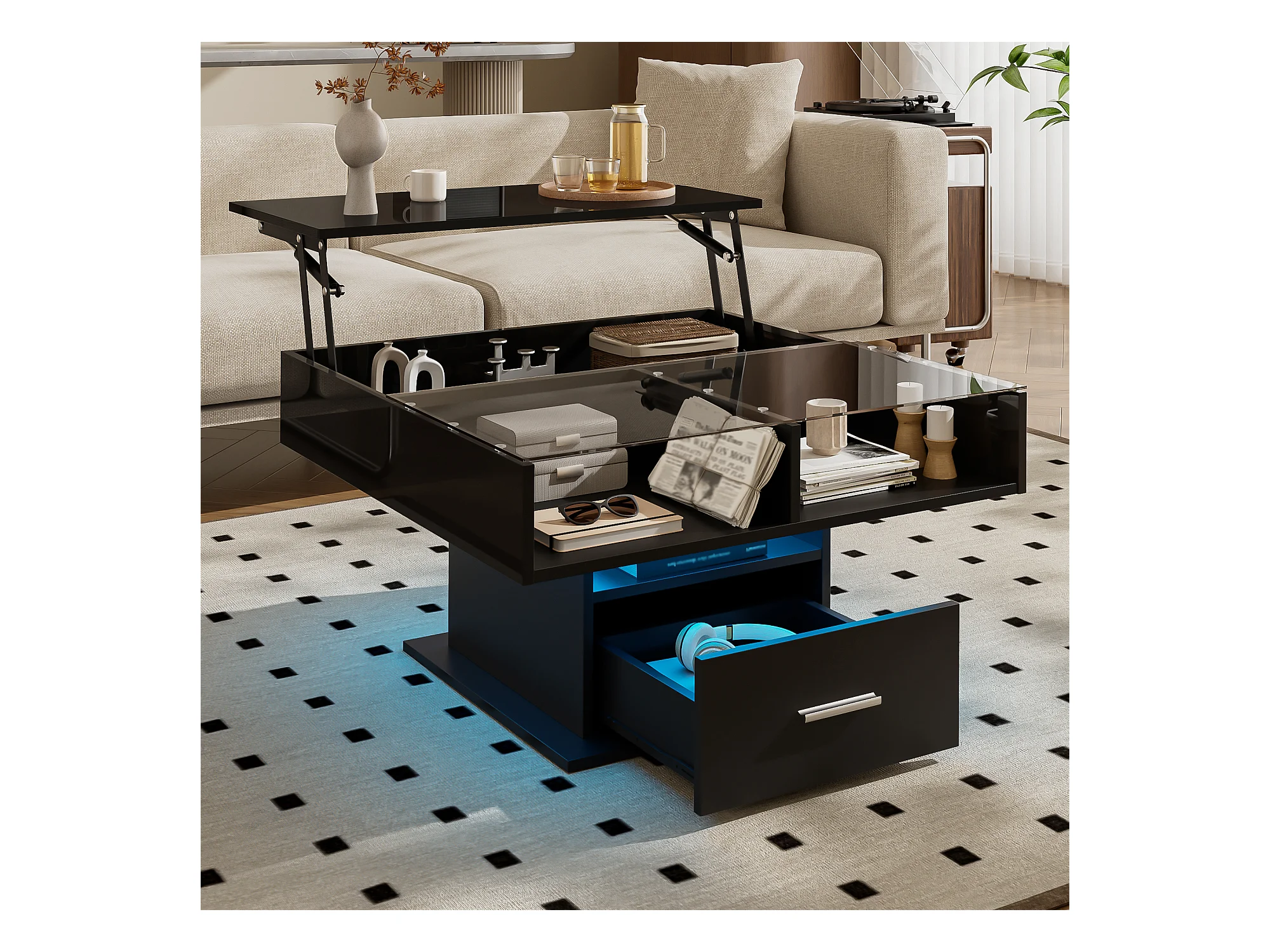 Table basse relevable 80x77x40 cm - Design haute brillance - Avec éclairage LED - Rangement semi-ouvert - Noir