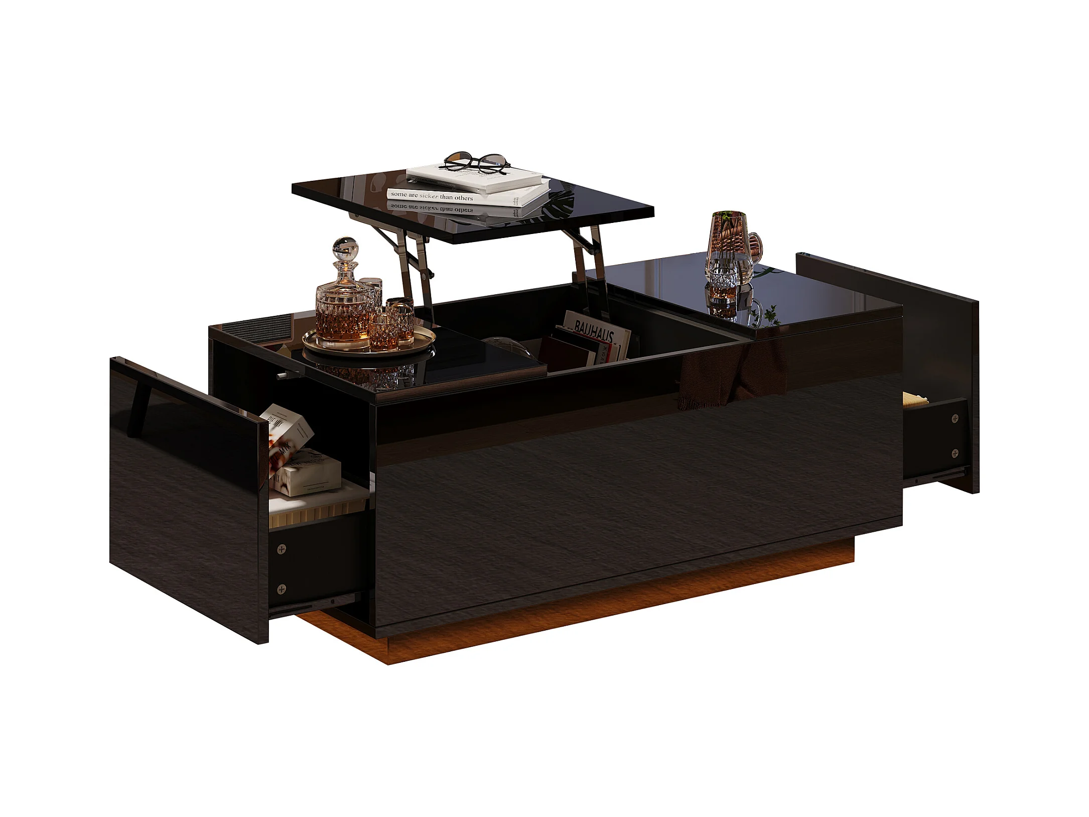 Table basse relevable - 90 x 55 x 41 cm - brillante moderne avec Leds + 4 tiroirs - aggloméré - noir