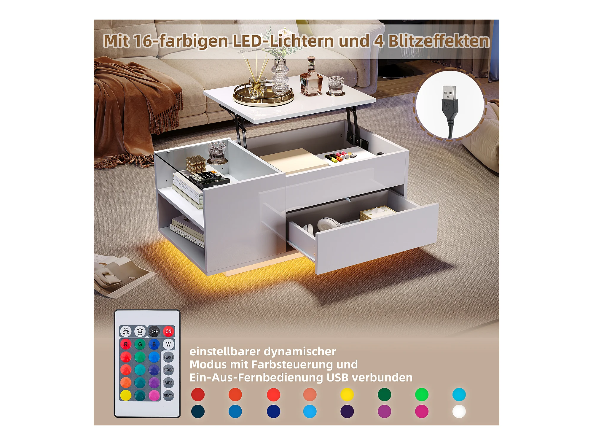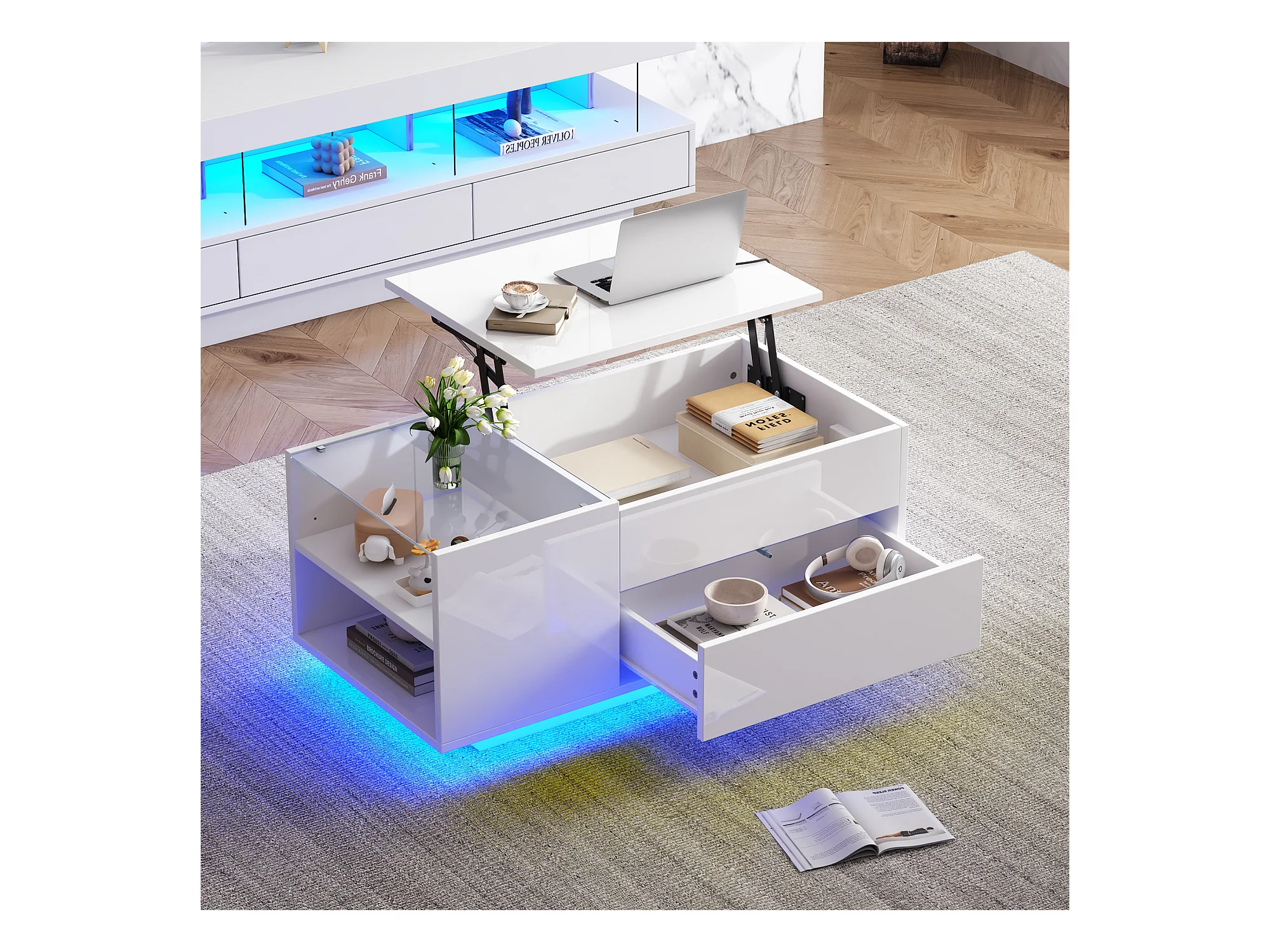 Table basse relevable - 95 x 48 x 42 cm - avec rangement dissimulé + Leds + 1 tiroir - aggloméré - blanc