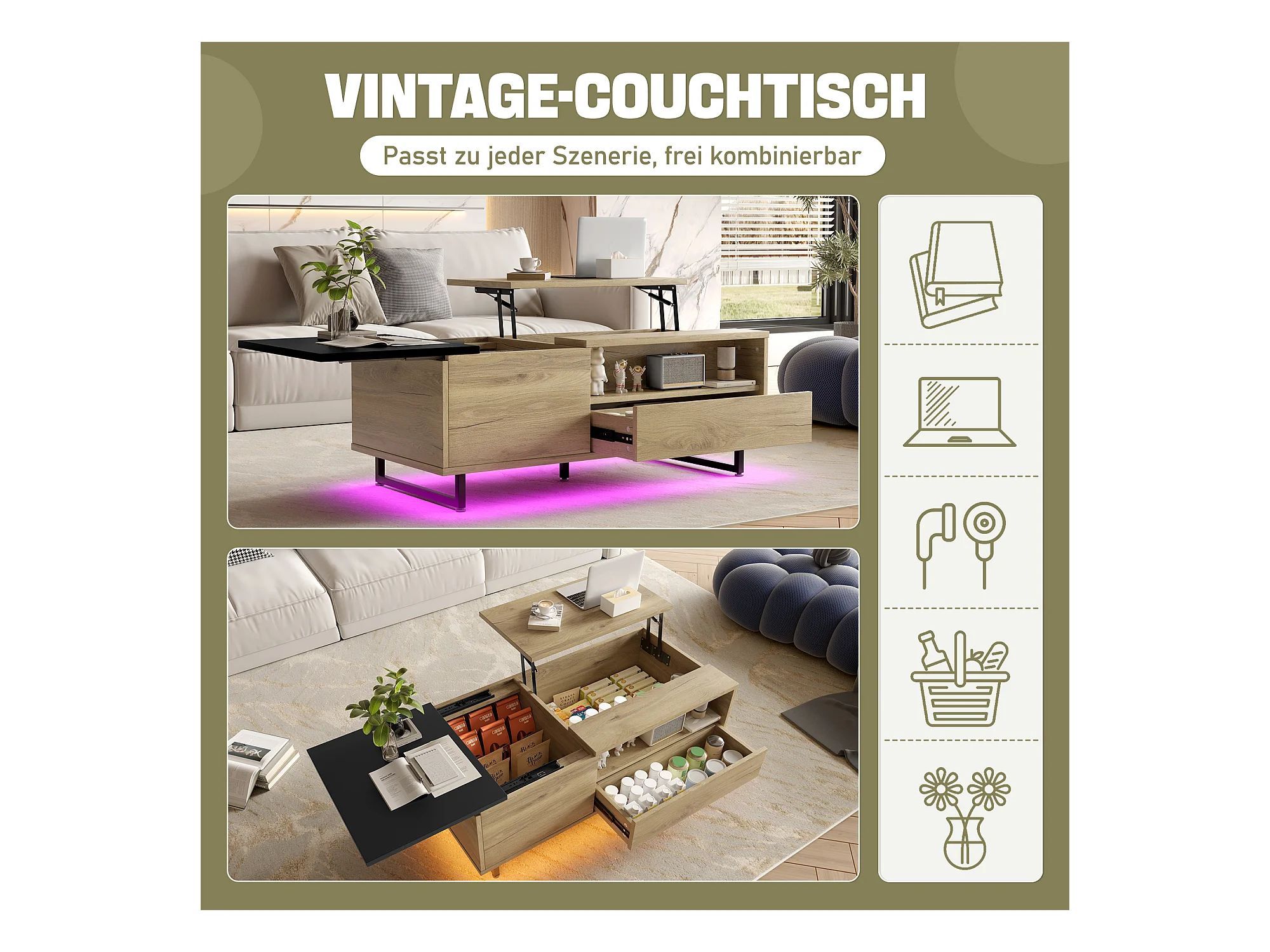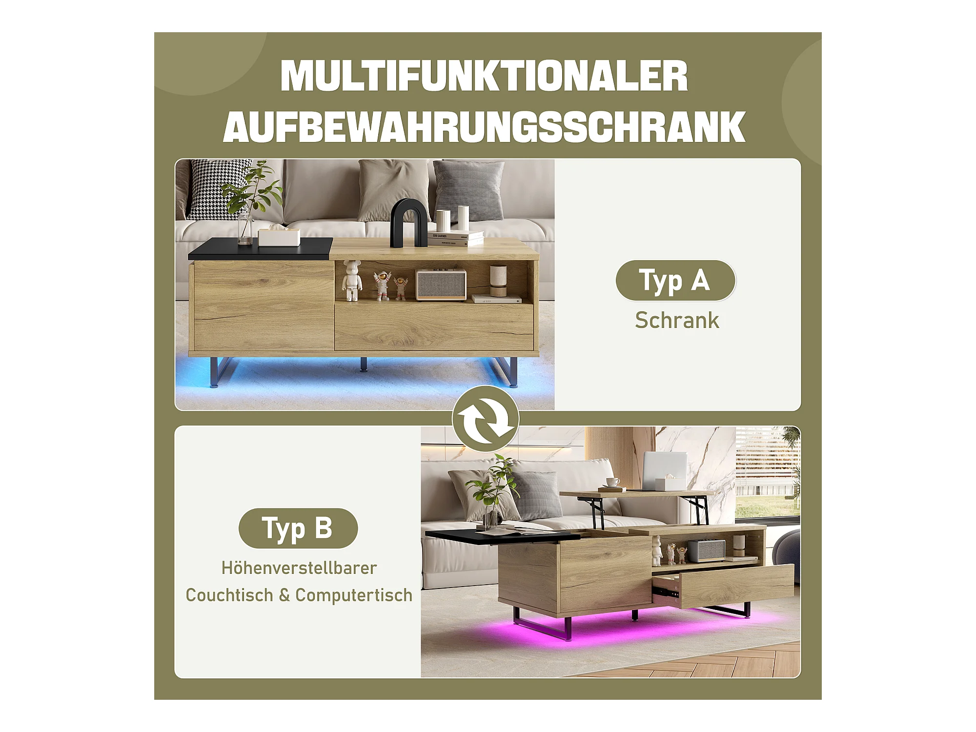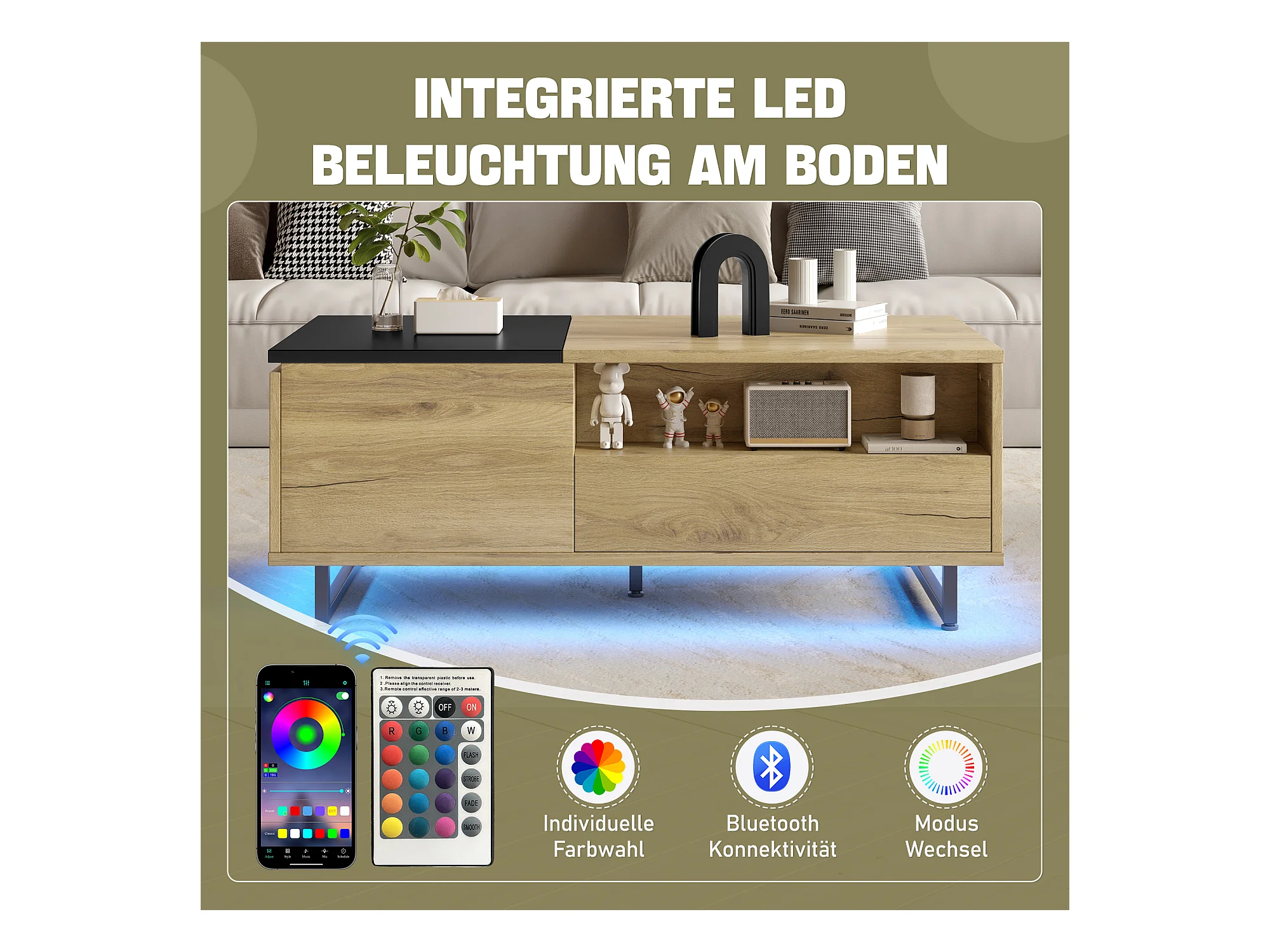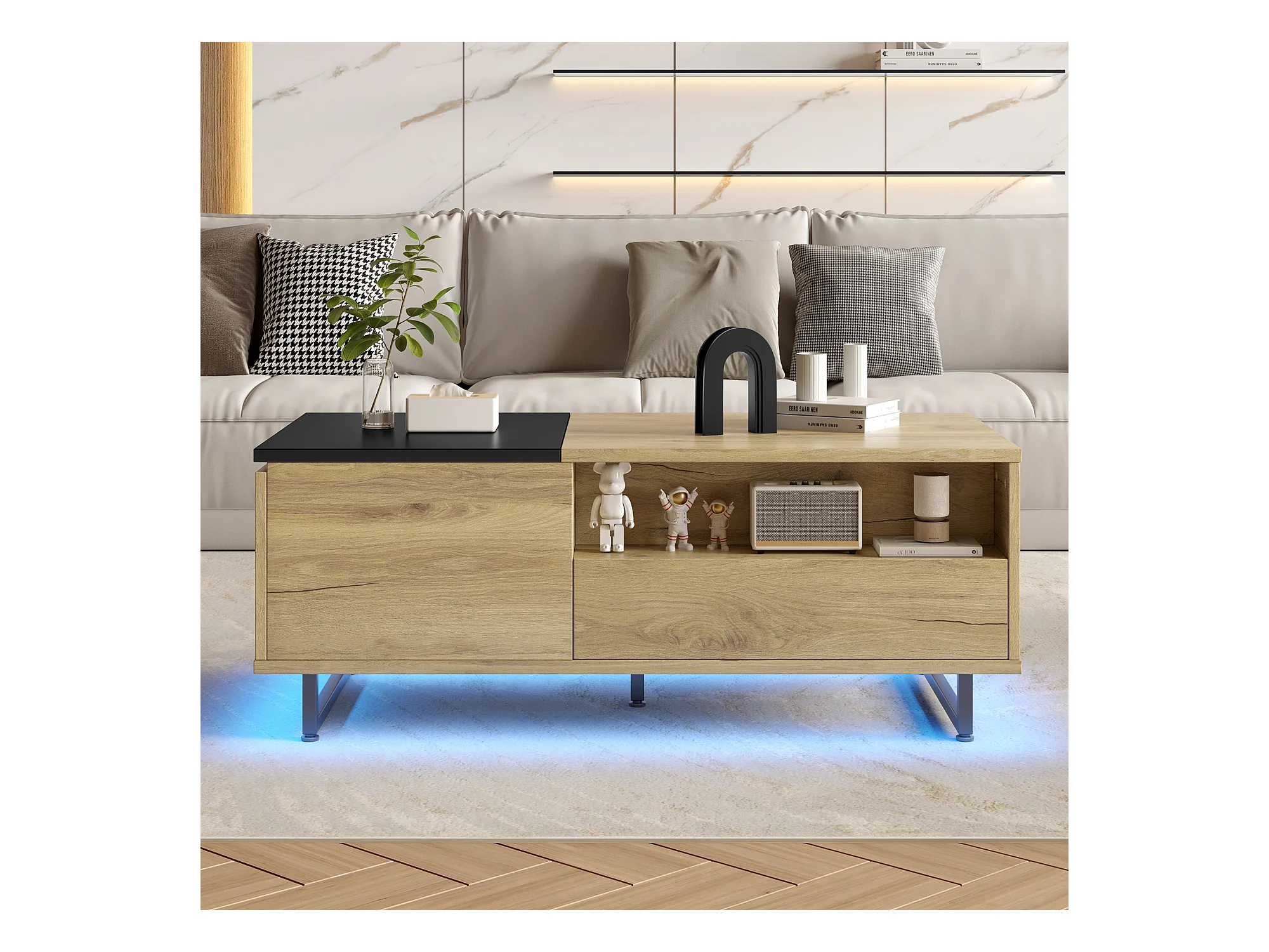 Table basse relevable avec Leds - 103.5 x 50 x 27.5 cm - avec 1 tiroir + compartiments - bois - naturel
