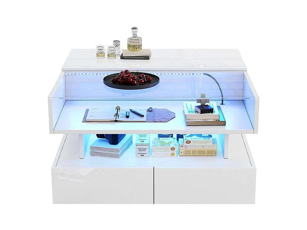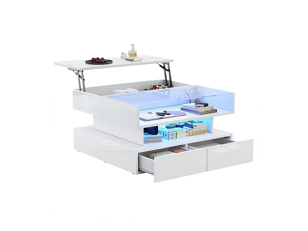 Table basse relevable blanche avec 2 tiroirs, éclairage LED et rangement, plateau en verre semi-trempé