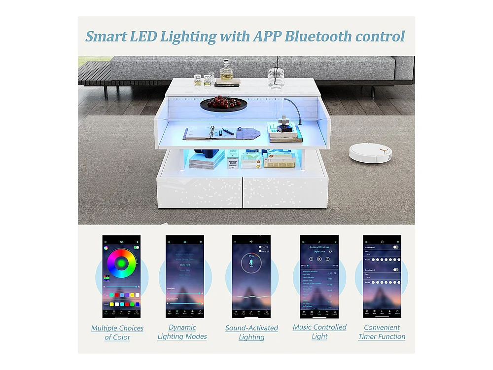 Table basse relevable multifonction brillante avec LED, hauteur réglable et rangement flexible, design moderne salon et bureau
