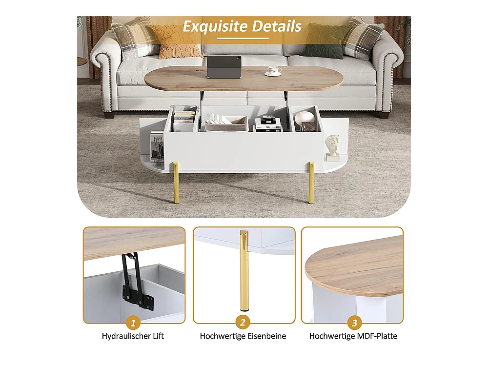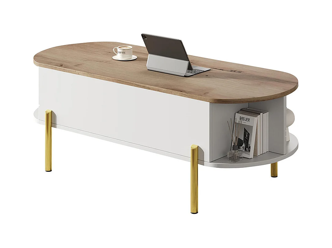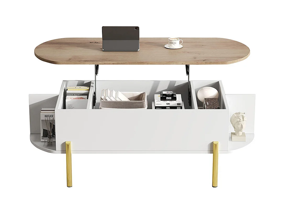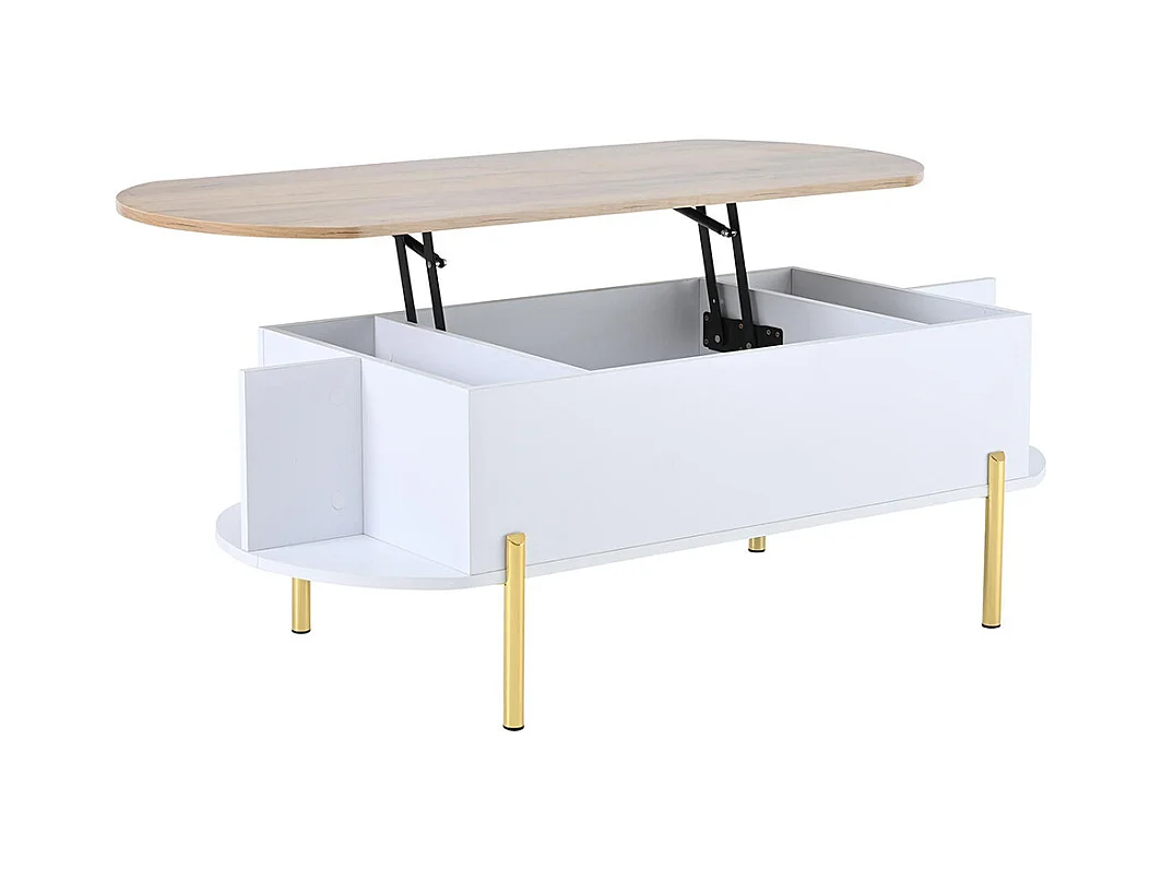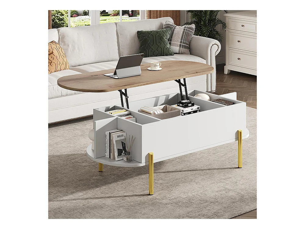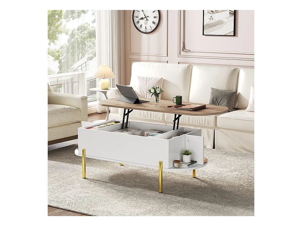 Table basse relevable plateau réglable rangement caché 7 surfaces bois blanc salon