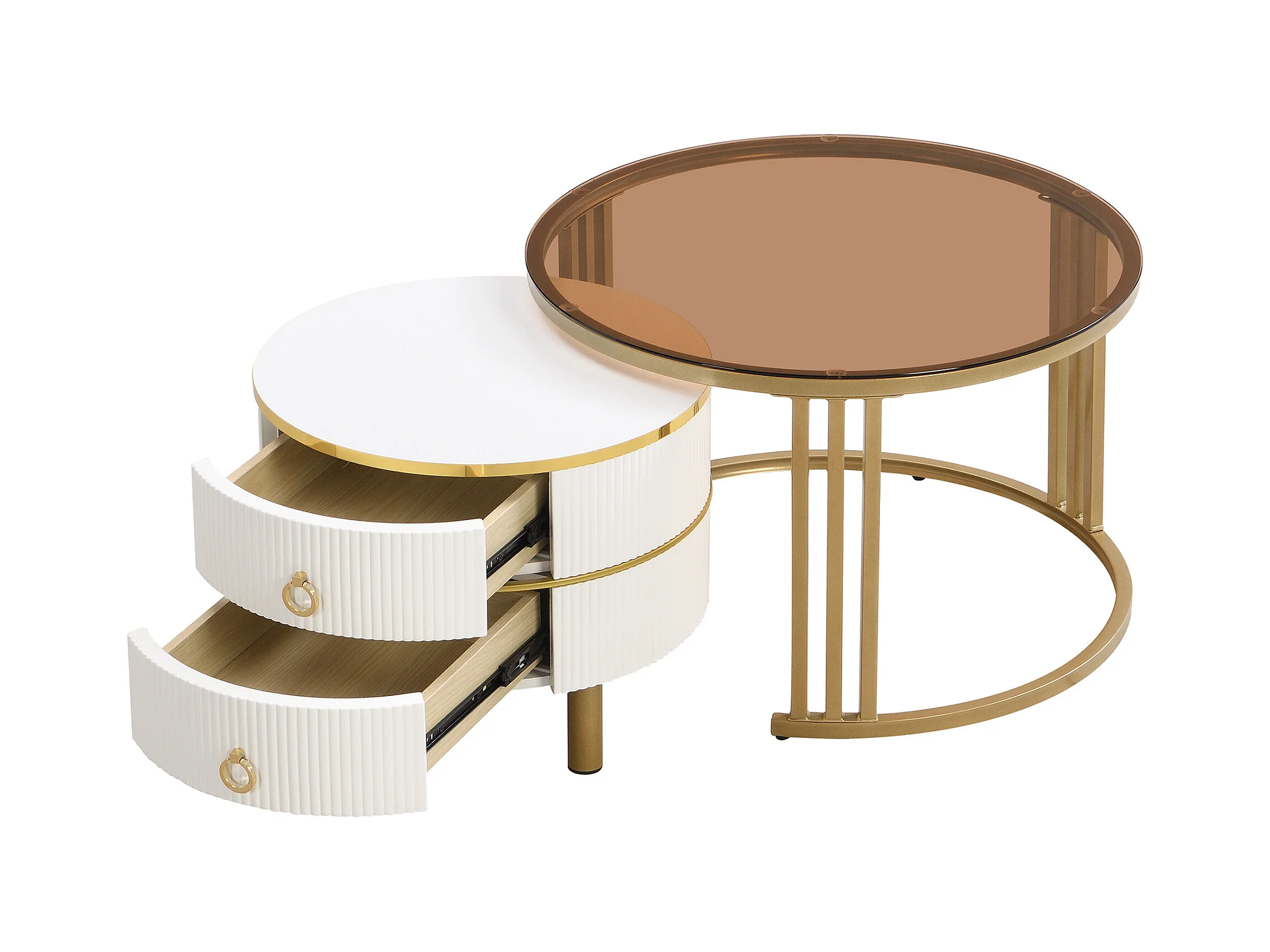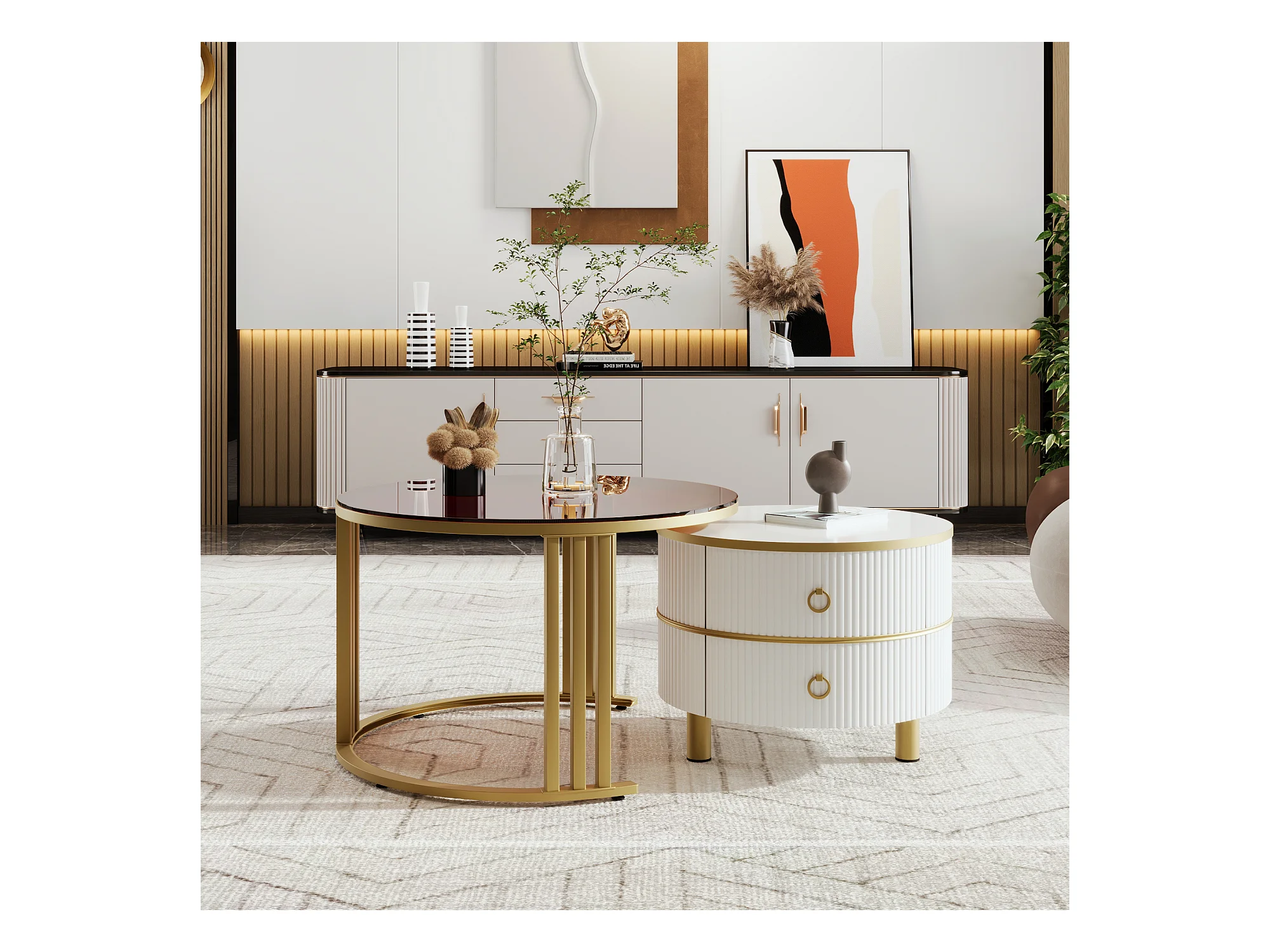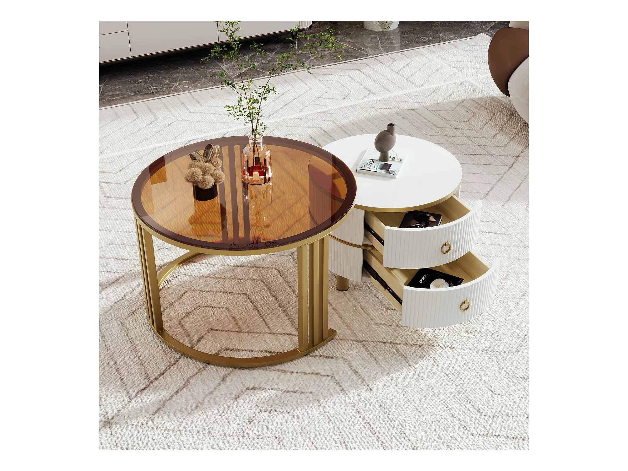 Lot de 2 tables basses - Table basse ronde avec plateau blanc et plateau marron - 2 tiroirs