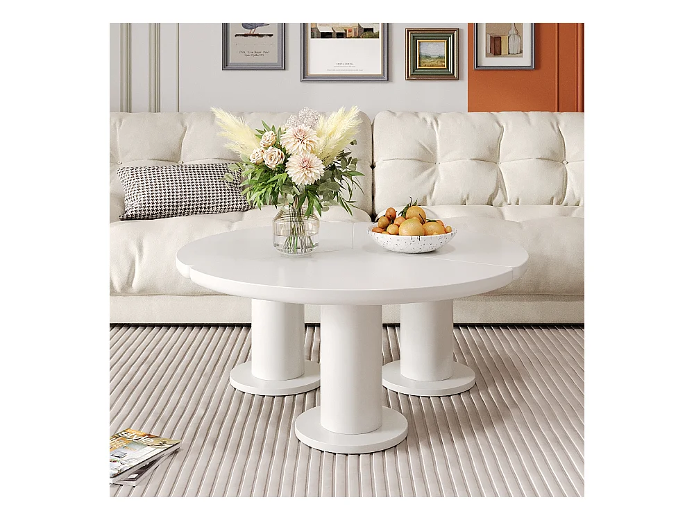 Table basse ronde, diamètre 100 cm, hauteur 40 cm, plateau en MDF laqué et pieds en PVC
