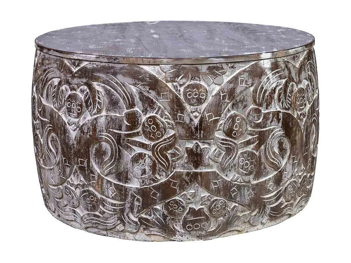 Table basse ronde en bois sculpté finition artisanale marron 76x76x45
