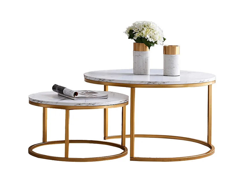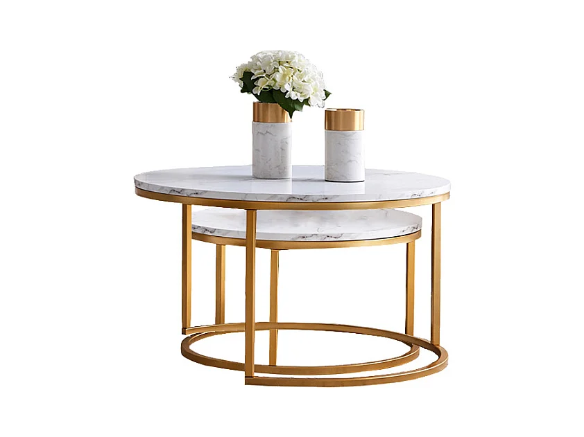 Lot de 2 tables basses gigognes modernes, structure en métal doré, plateau en marbre - 80 cm
