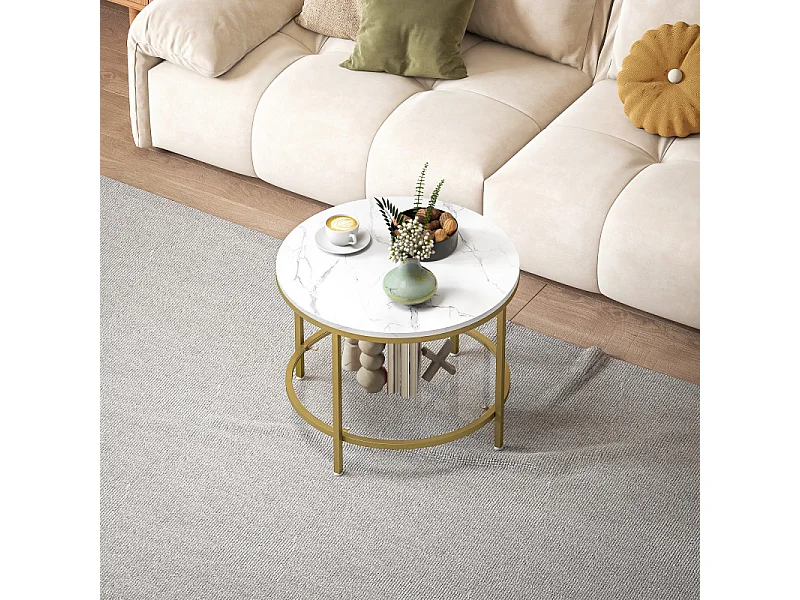 Table basse ronde étagère verre AURELIA effet marbre blanc et or