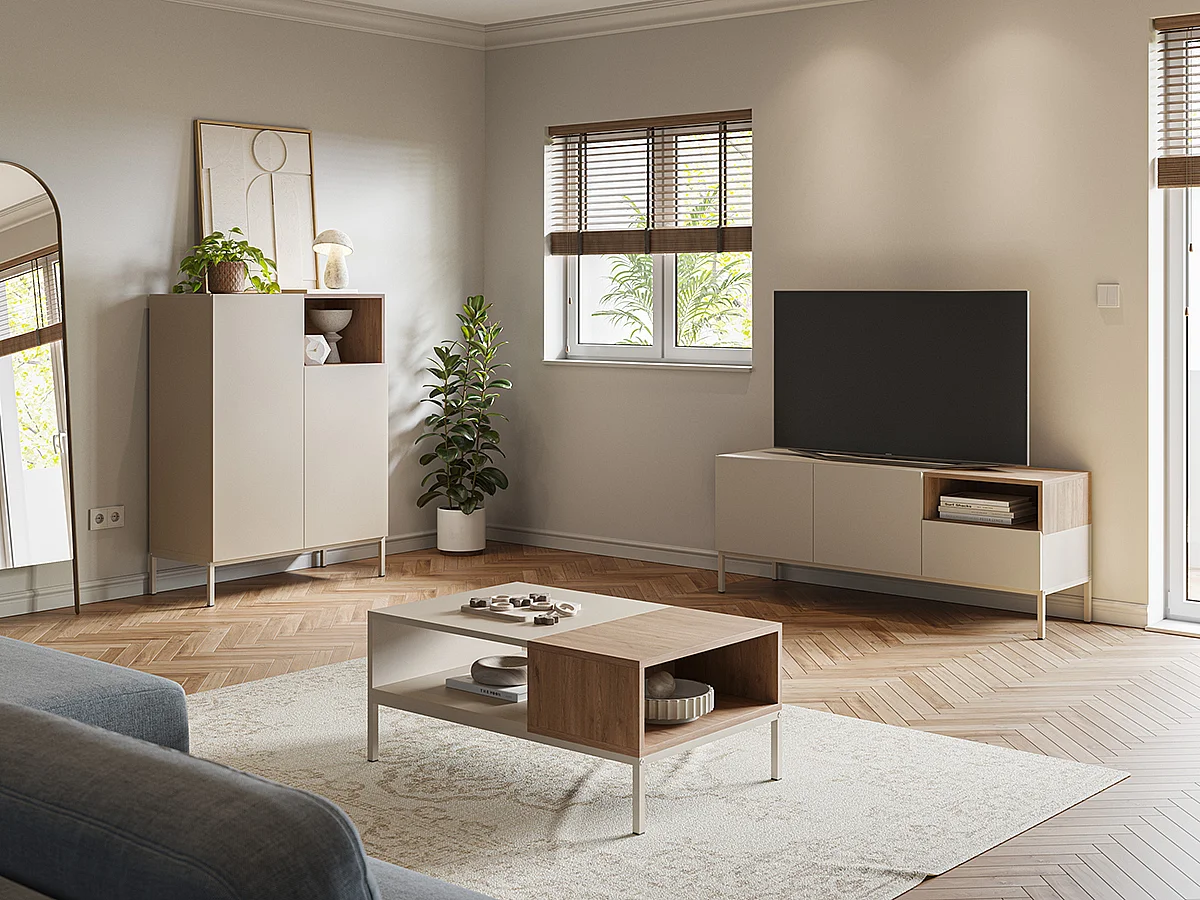 Table basse, table de salon aspect bois coloris naturel, pieds en métal coloris blanc - Longueur 90 x Profondeur 56 x Hauteur 40 cm