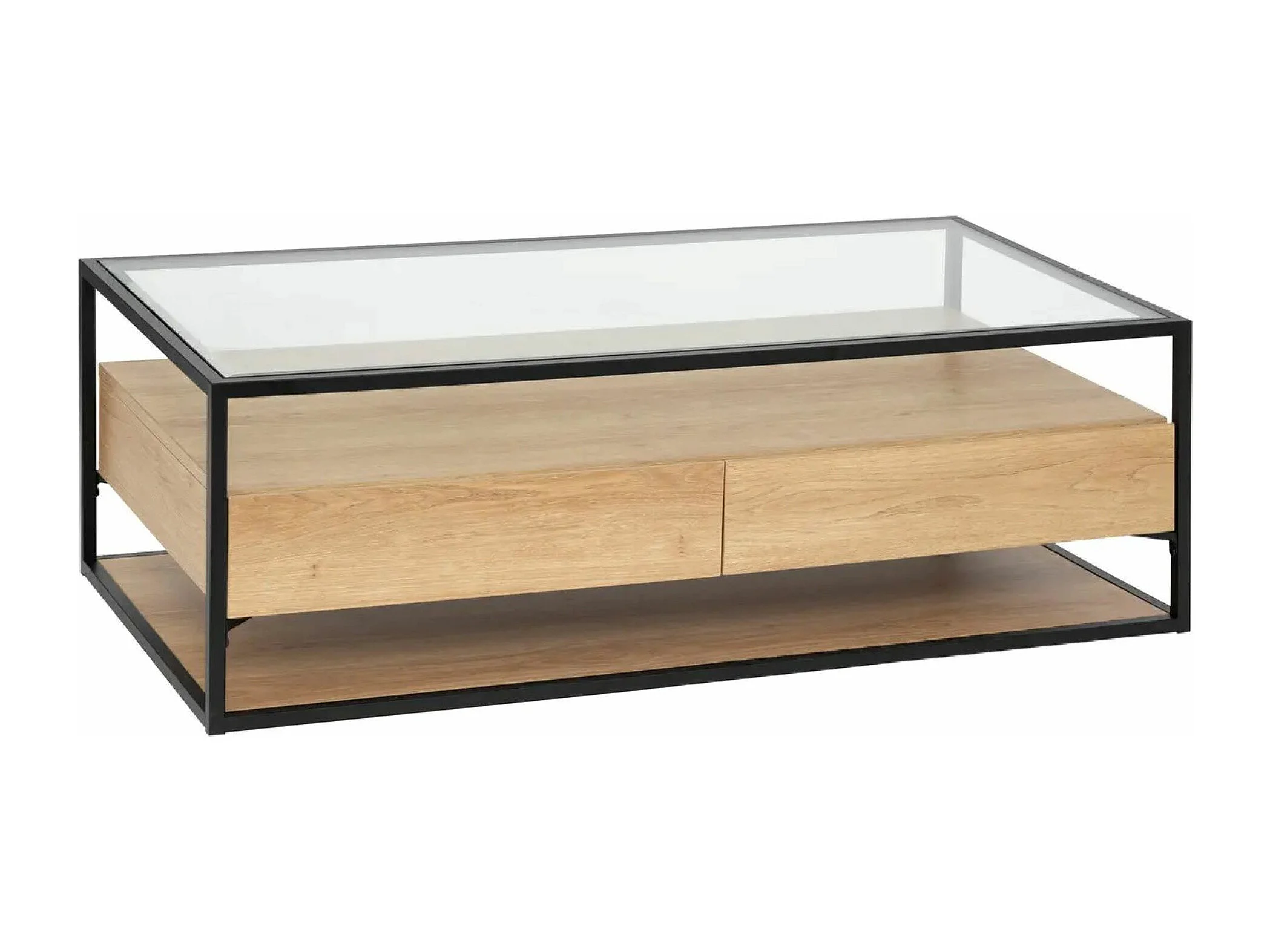 Table basse, table de salon avec 2 tiroirs en bois coloris naturel et verre trempé
