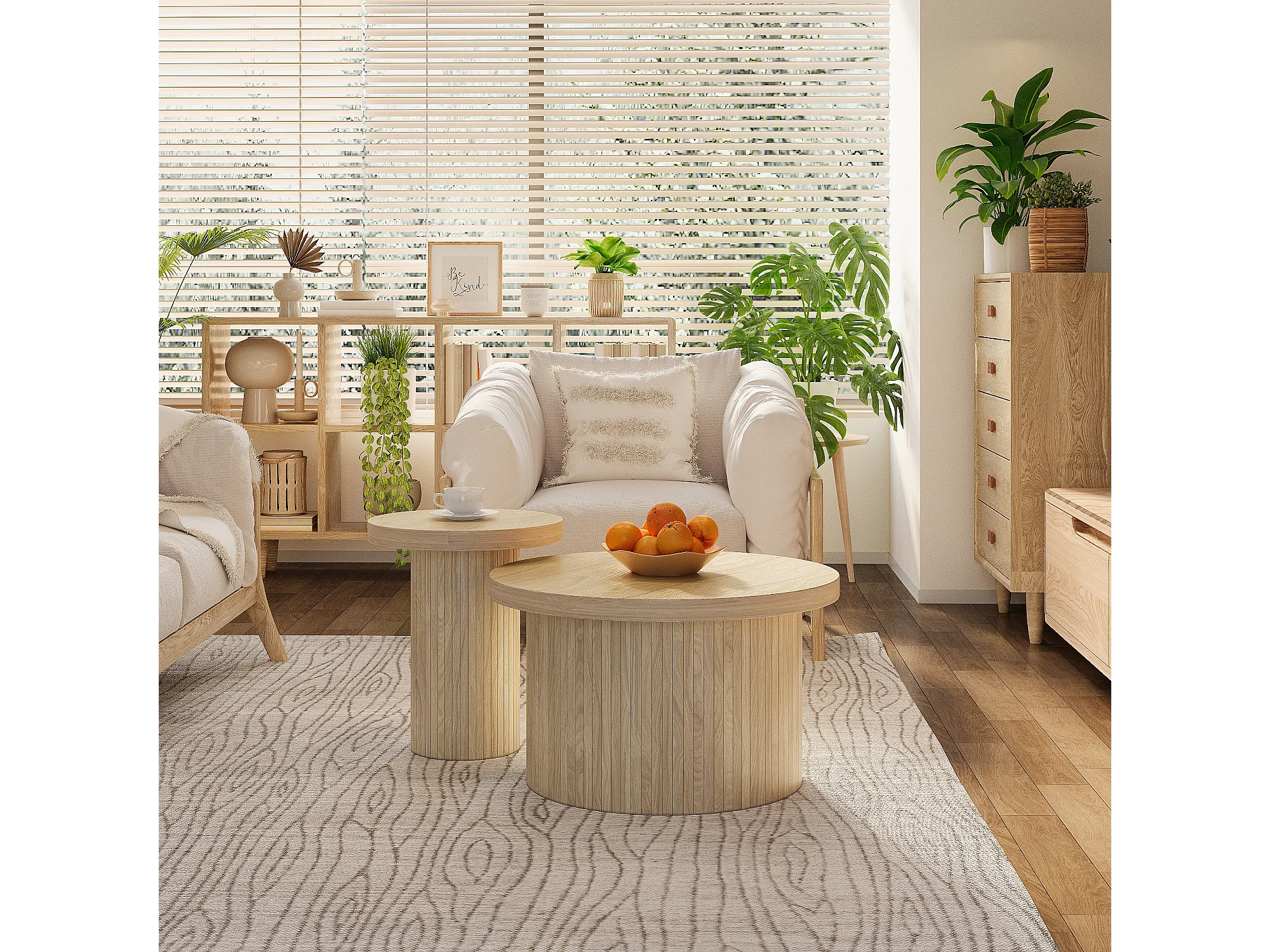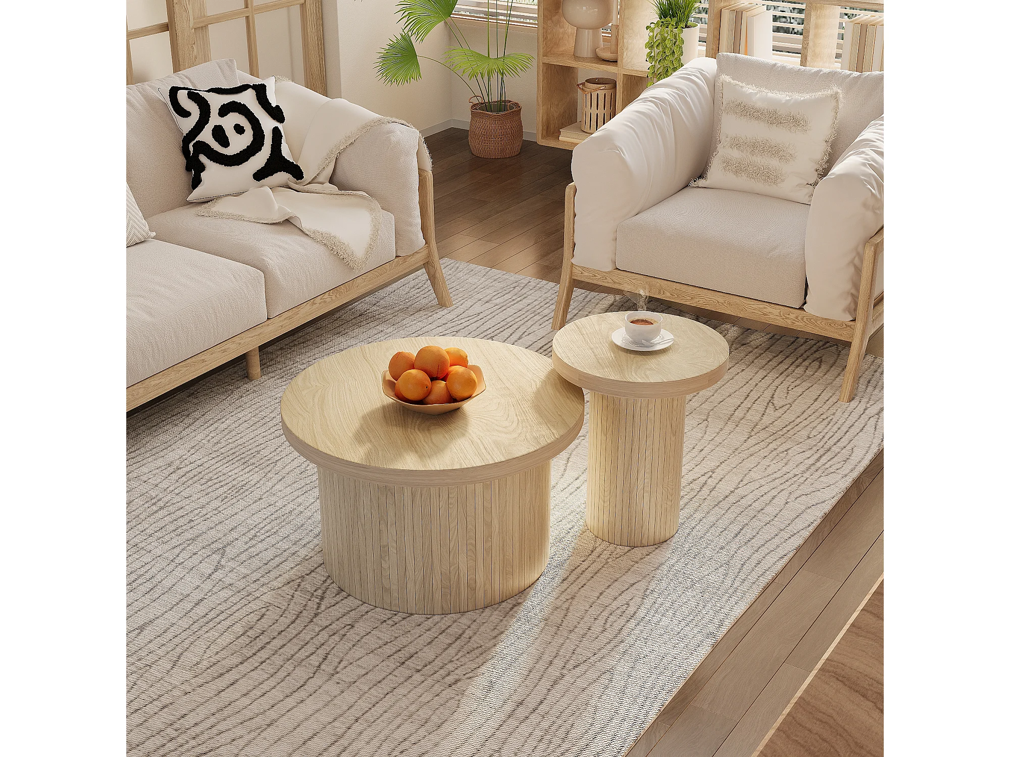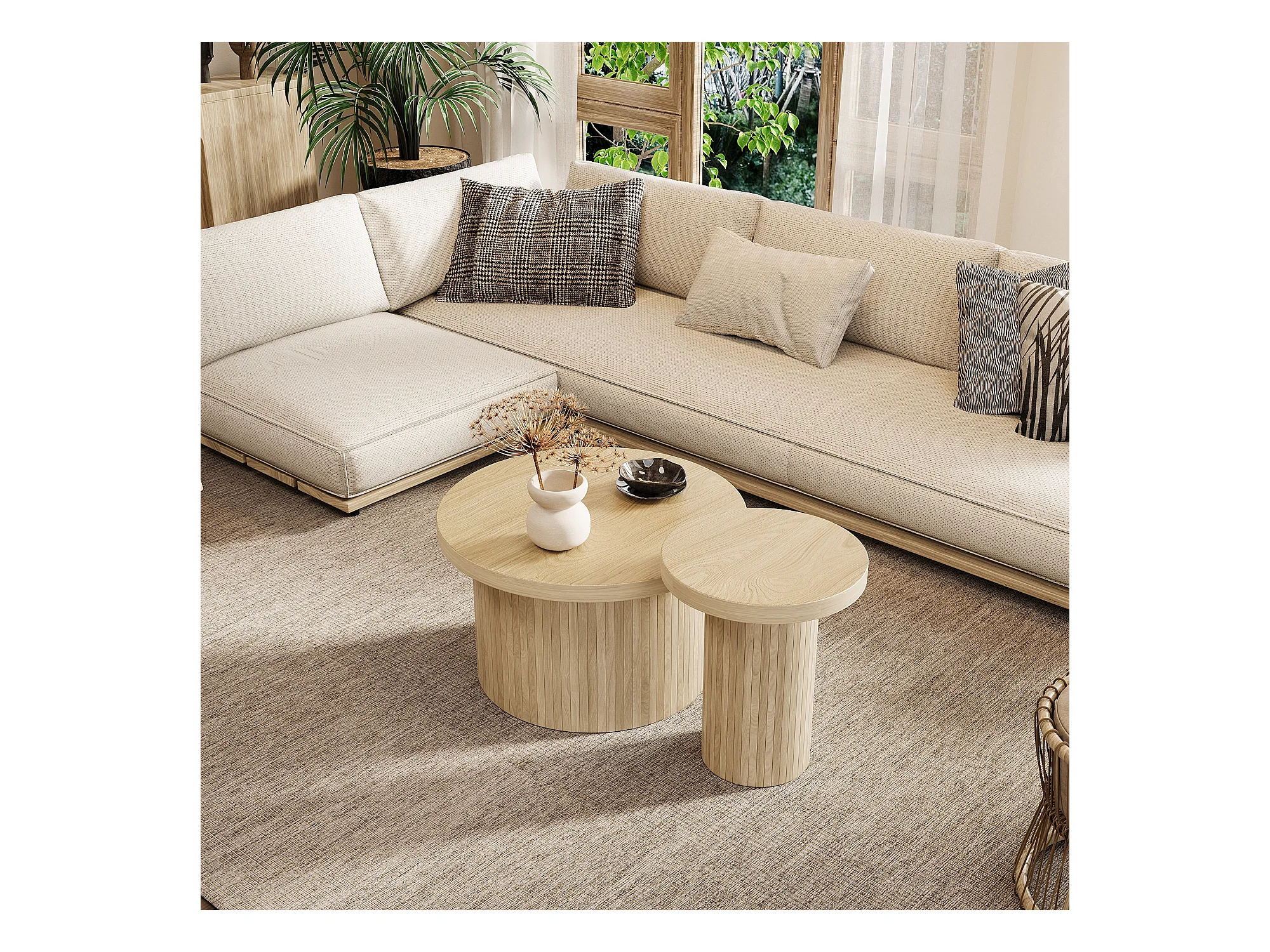 Table basse, table ronde double, table d'appoint avec lattes en bois naturel, table de salon multifonctionnelle
