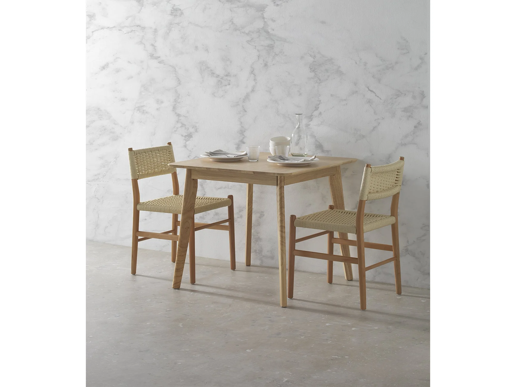 Table carrée 80x80 pieds en hévéa et plateau plaqué en chêne