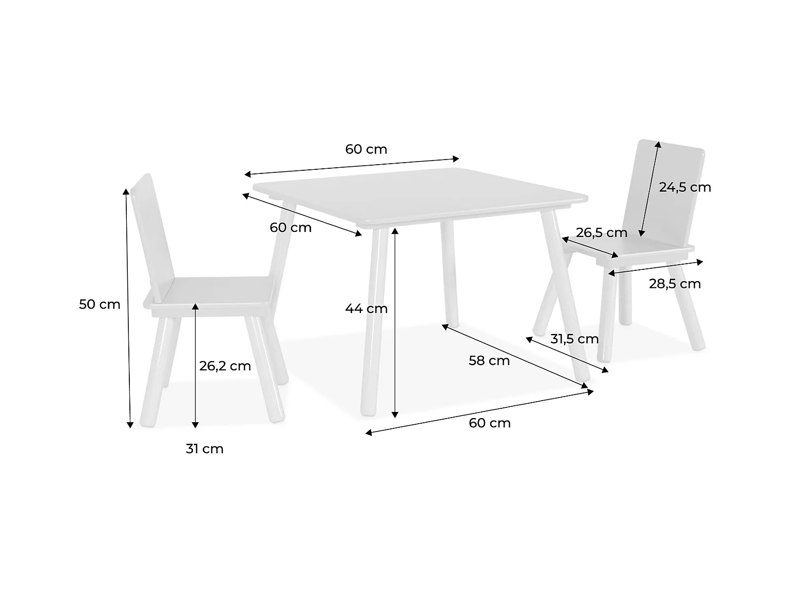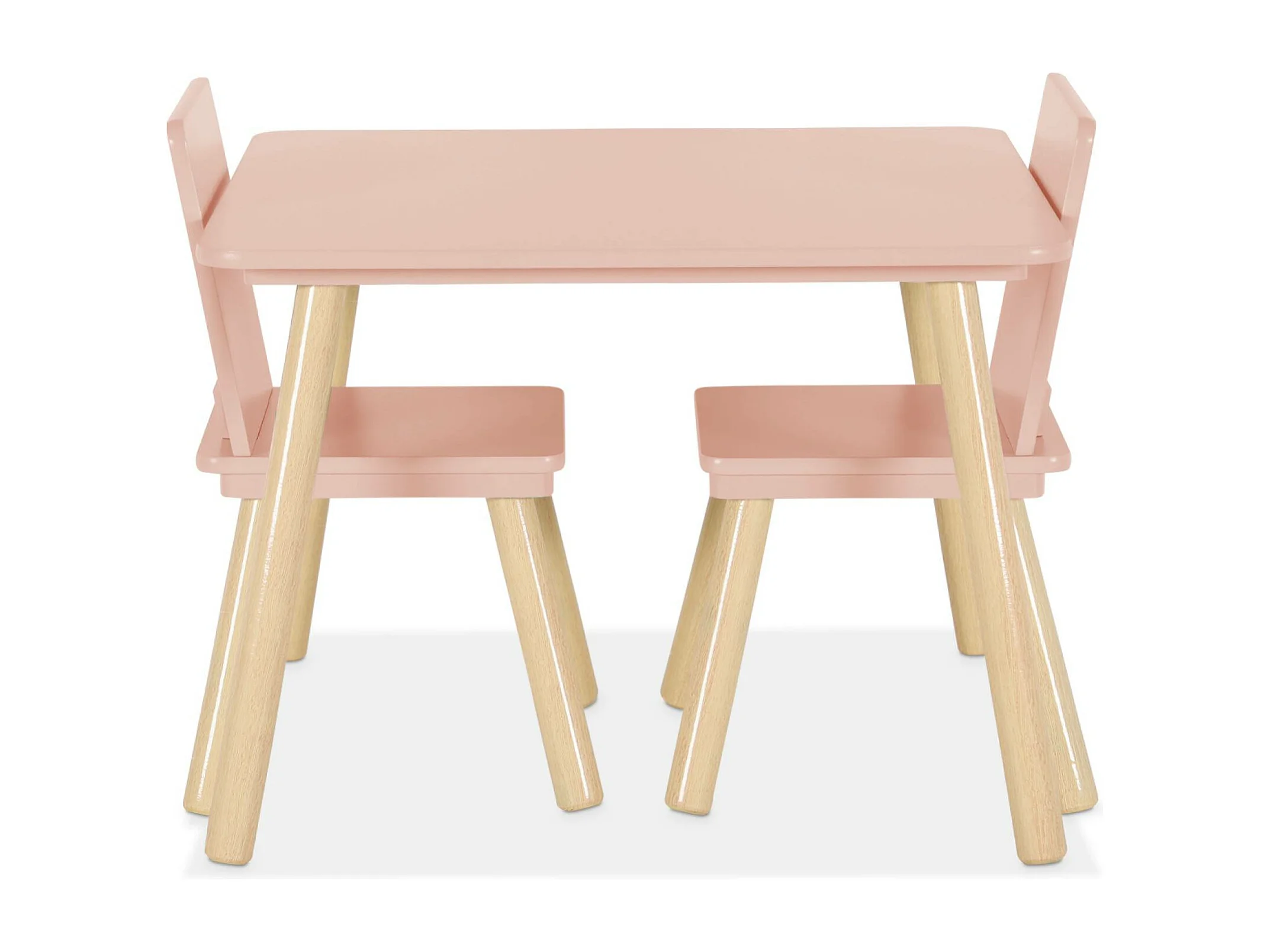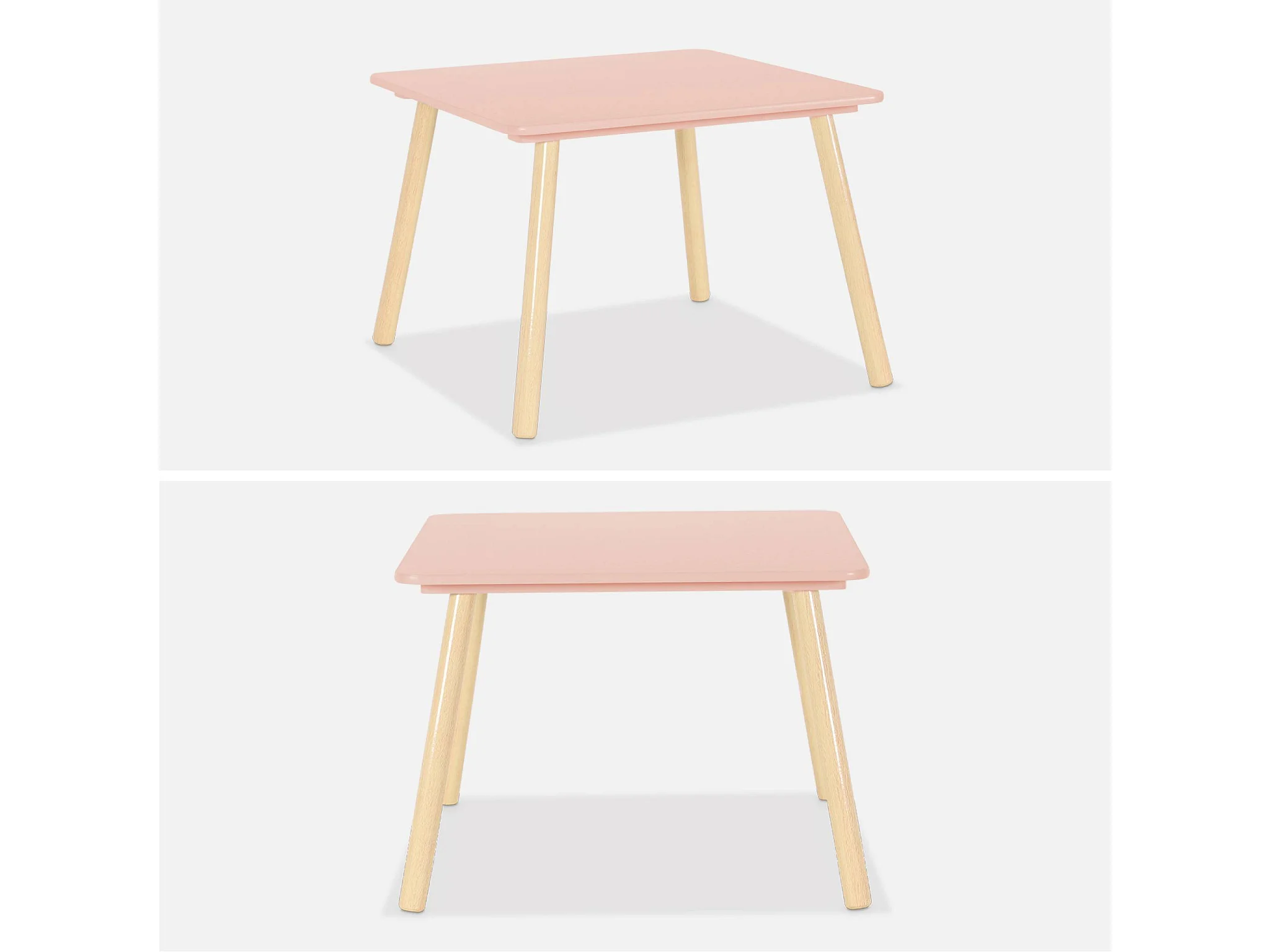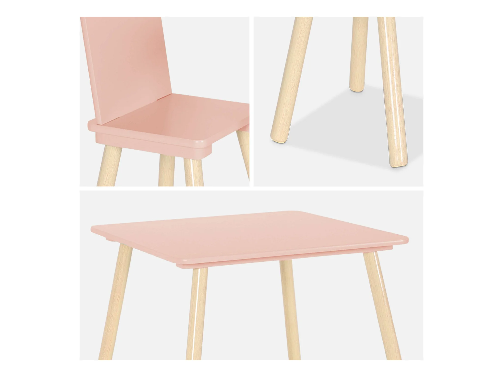 Table carrée enfant avec 2 chaises. pieds en pin. rose