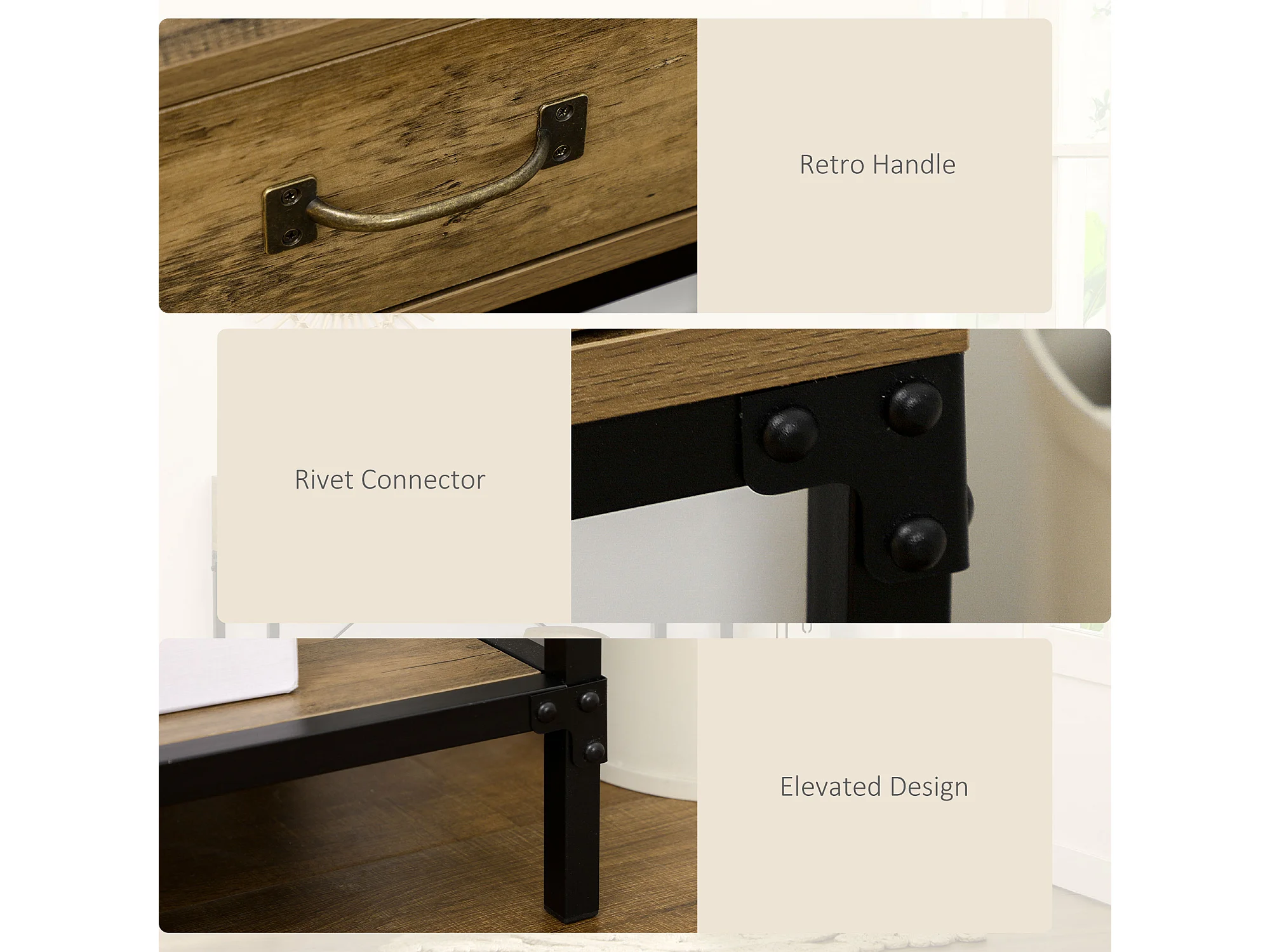 Table console avec 2 tiroirs, étagère inférieure, métal et bois, vintage, noir et brun (100x35x76.5 cm)