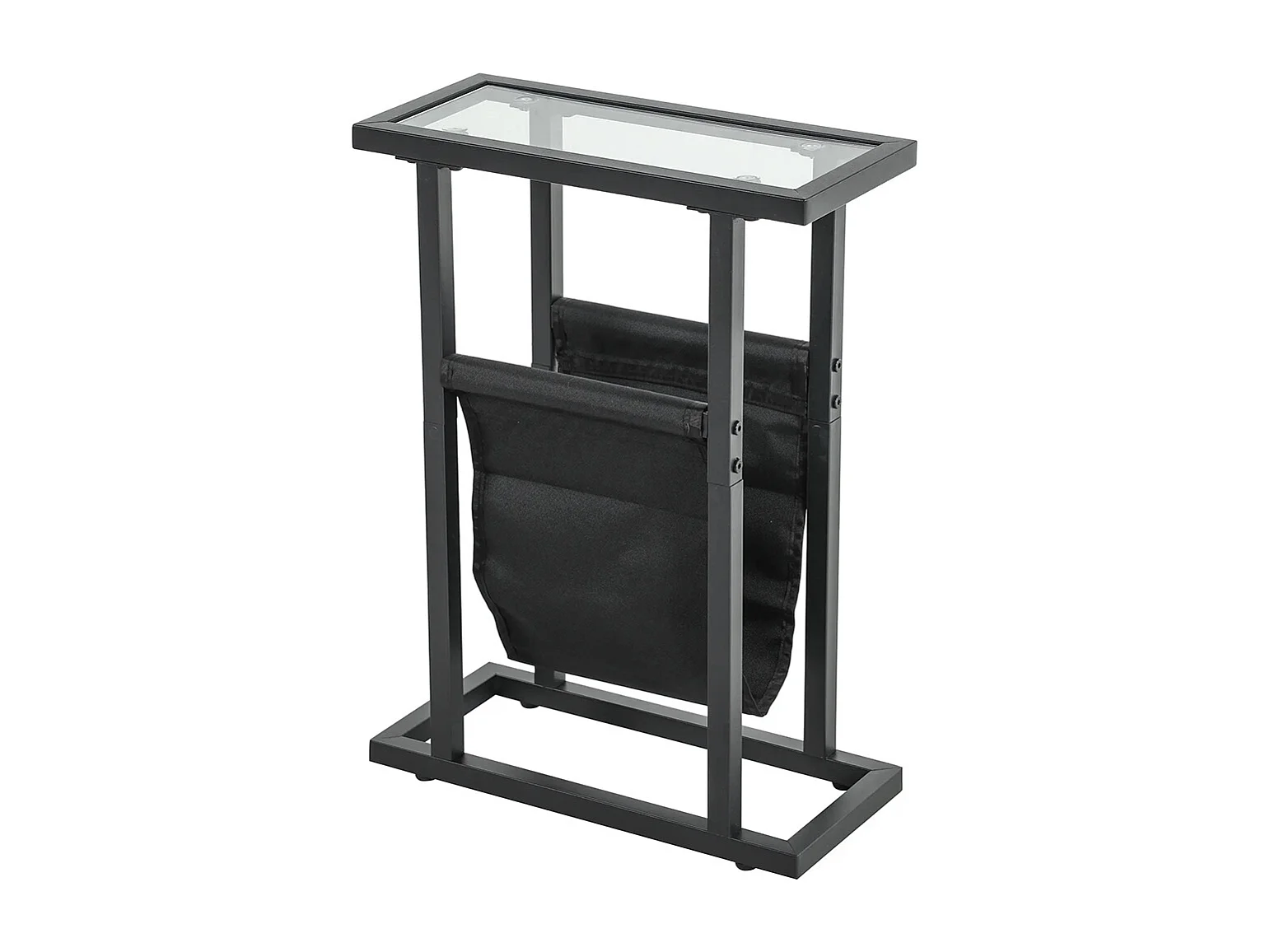 Table d'appoint étroite bout de canapé en métal avec porte-revues et plateau en verre trempé noir