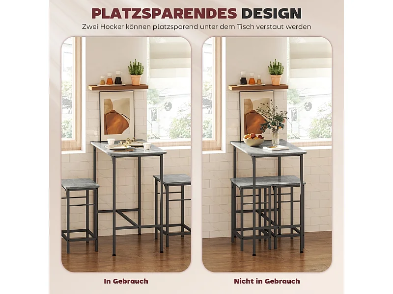 Table de bar avec chaises, set 3 pièces, métal, gris, avec repose-pieds antidérapants (80x50x87 cm)