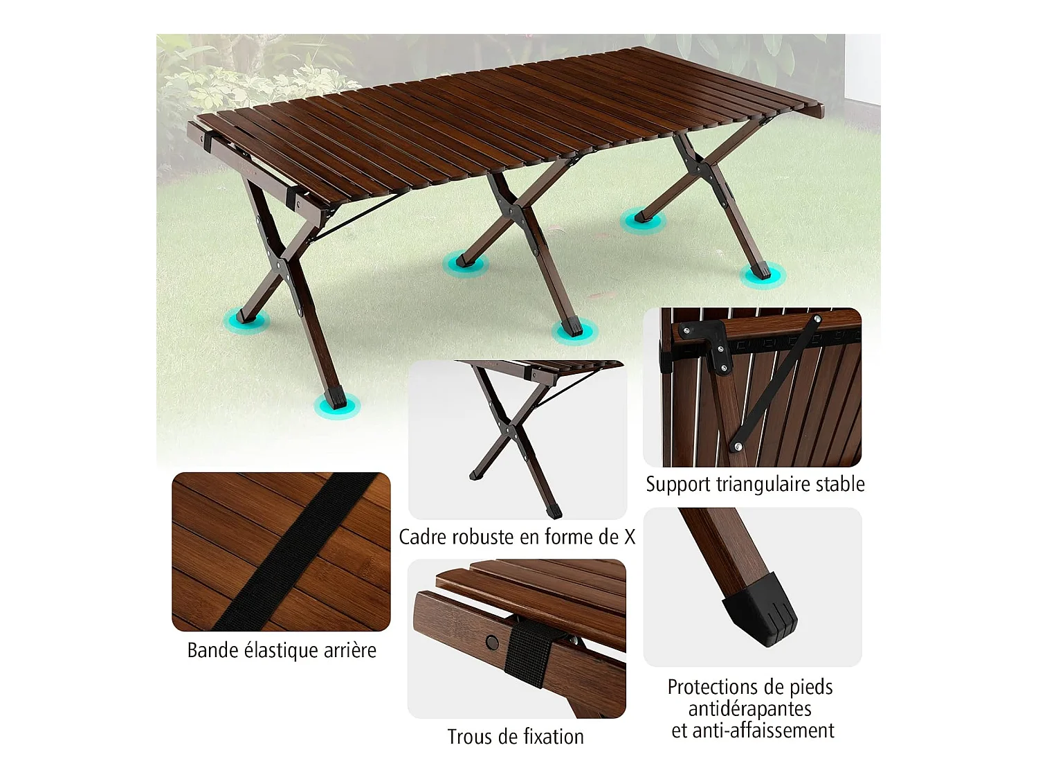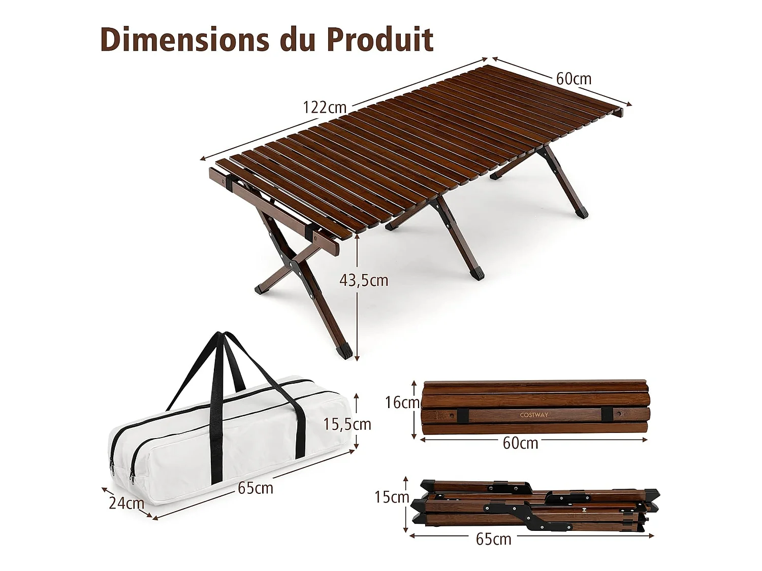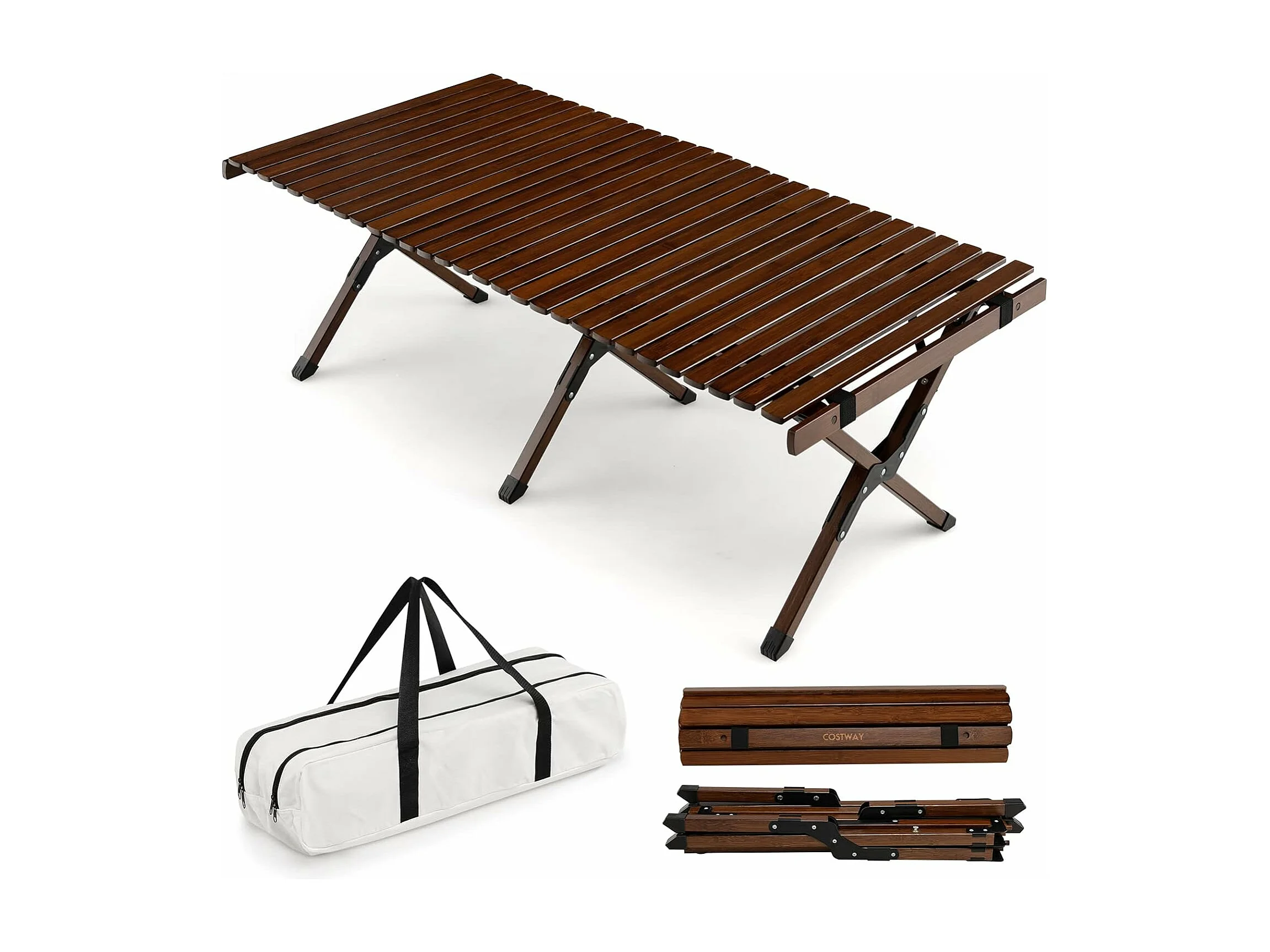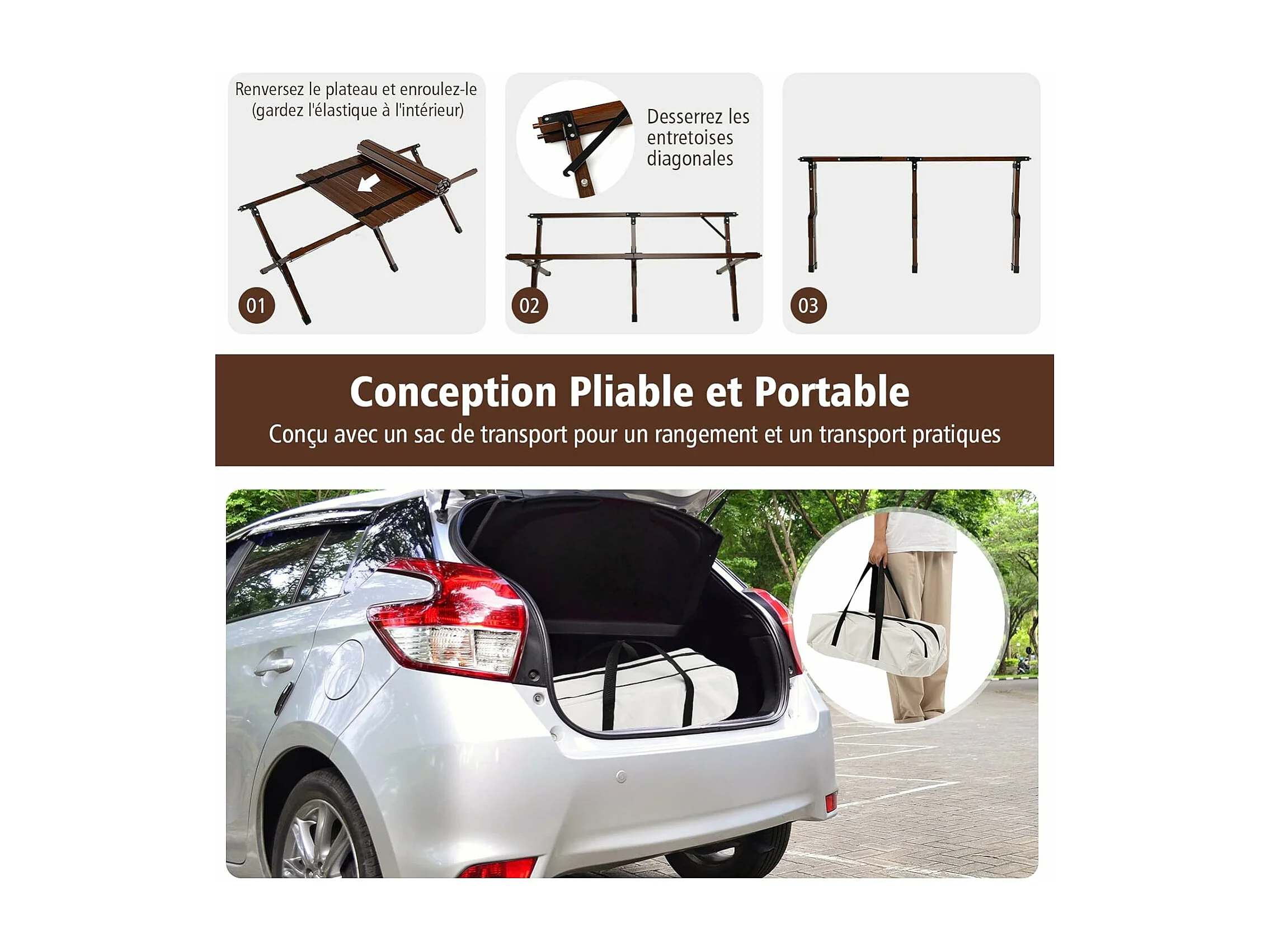 Table de Camping Pliante en Bambou à Latte Enroulable, Table Pliante Extérieure Charge Max 50kg avec Sac de Transport pour Barbecue Pique-Nique Randonnée Voyage, 122x60x43,5cm, Café