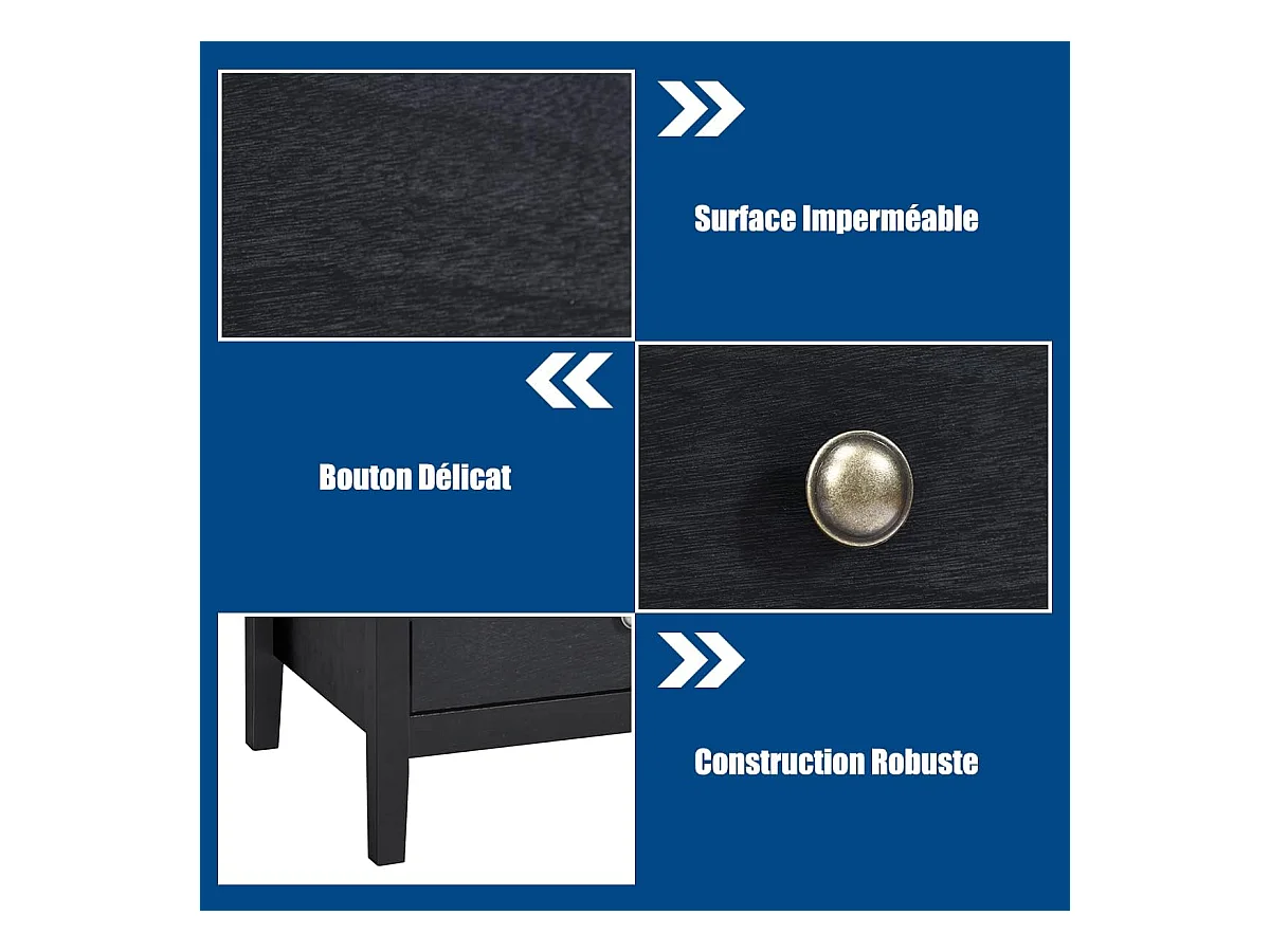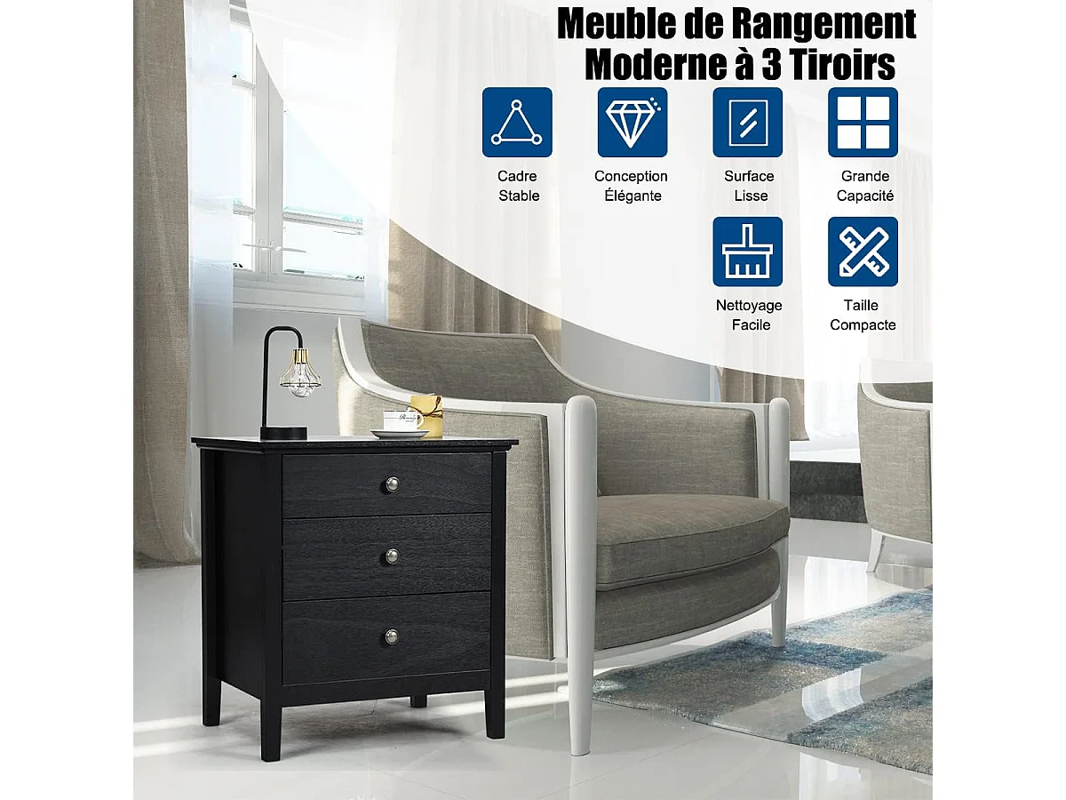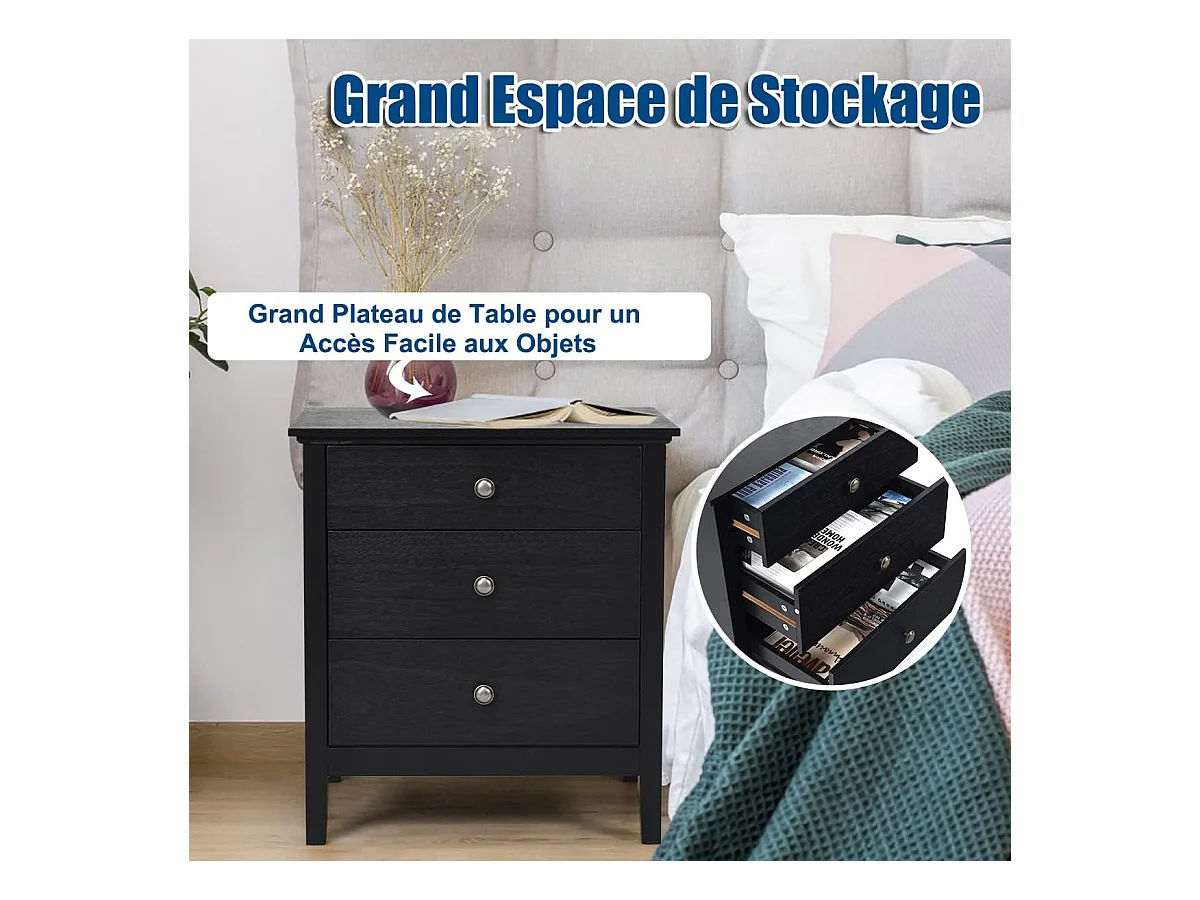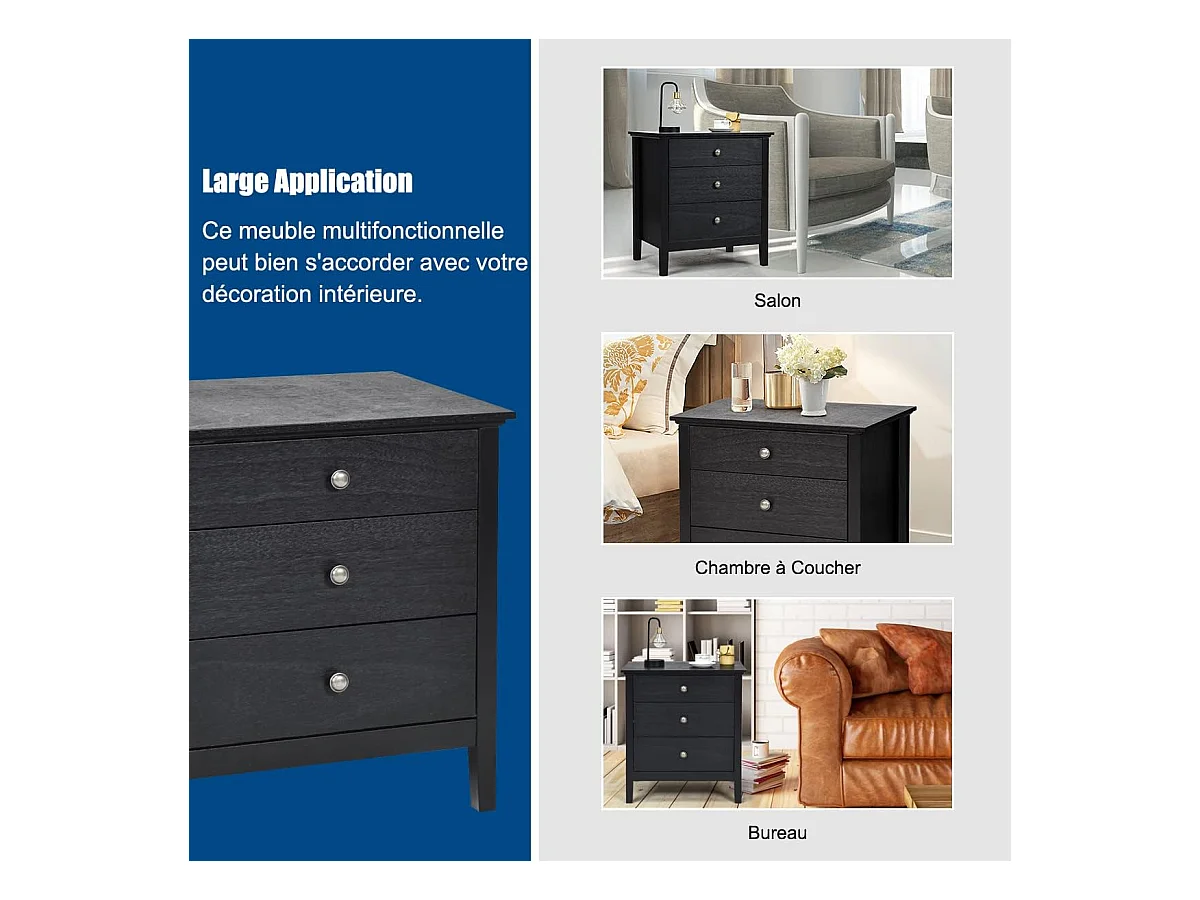 Table de chevet table de nuit noir en bois avec 3 tiroirs 35 x 38 x 67 cm