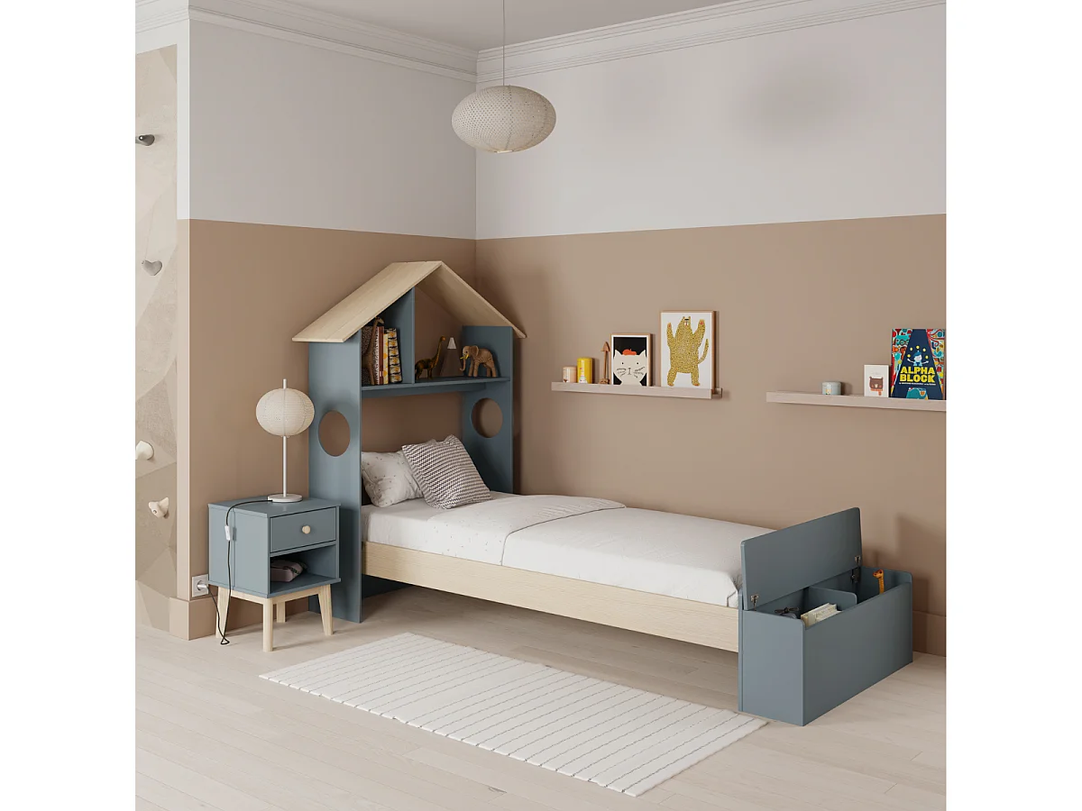 Chevet table de nuit enfant style nordique - tiroir, niche, plateau - aspect bois vert