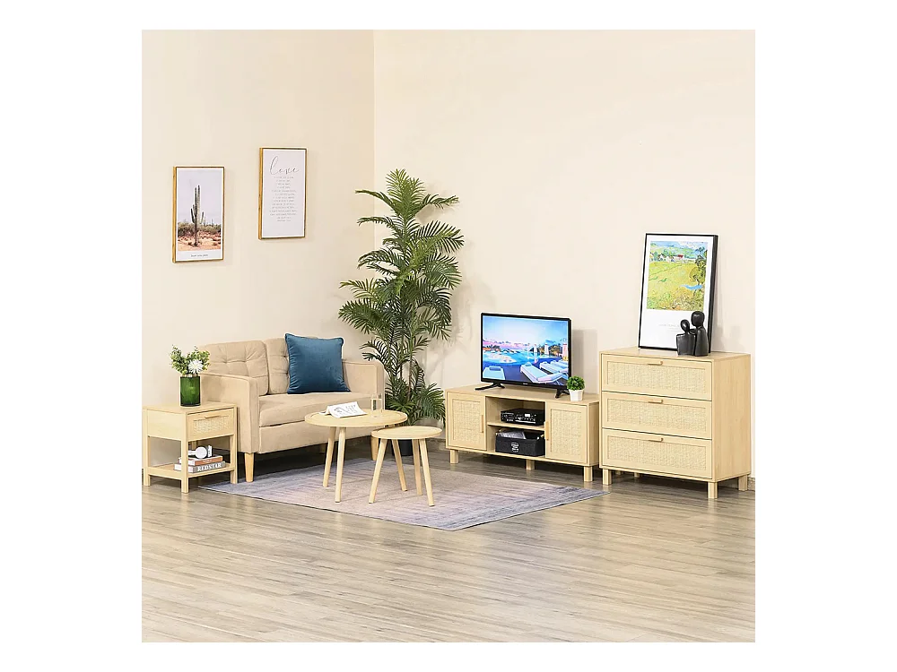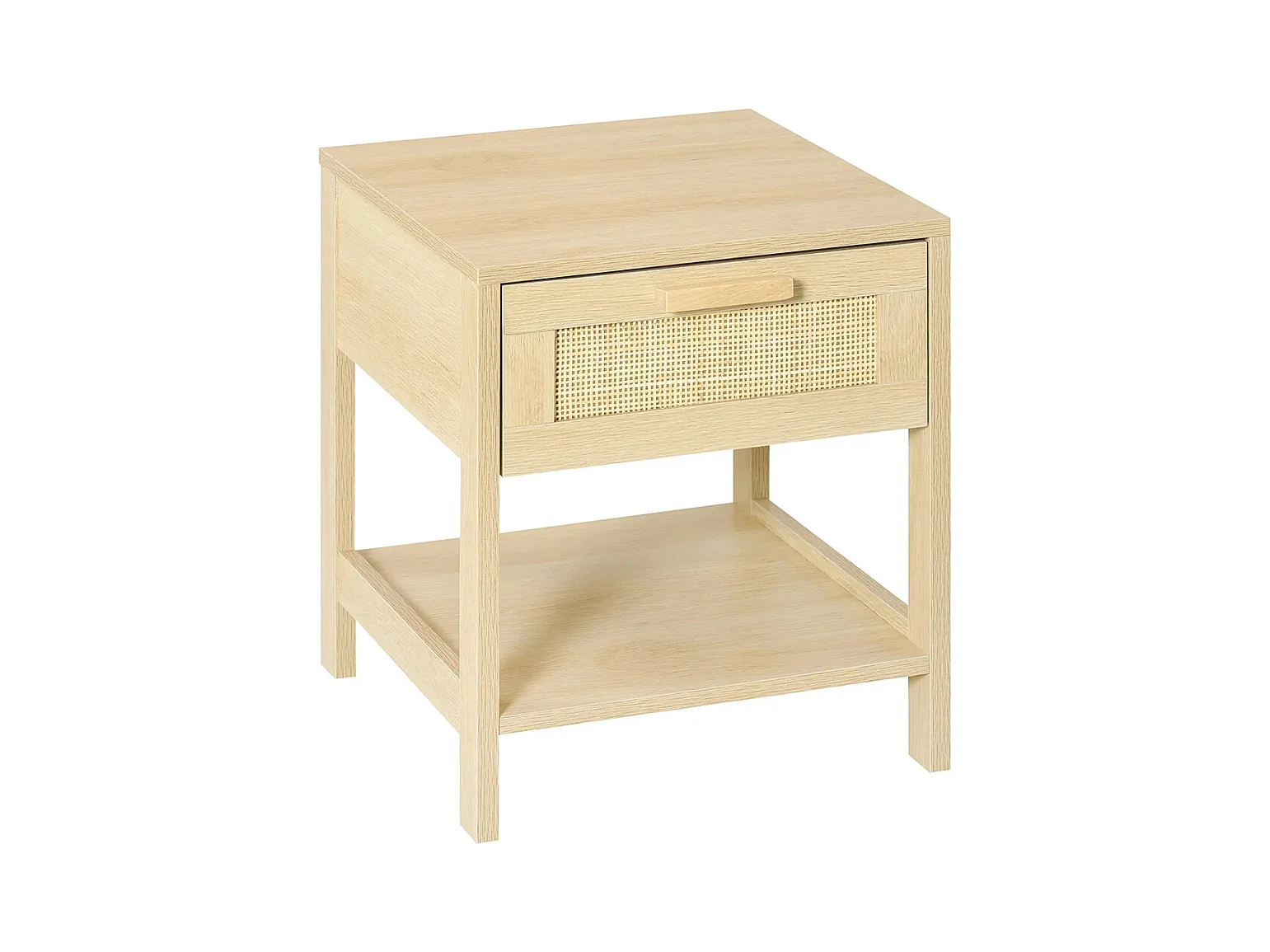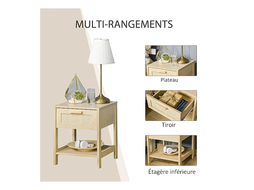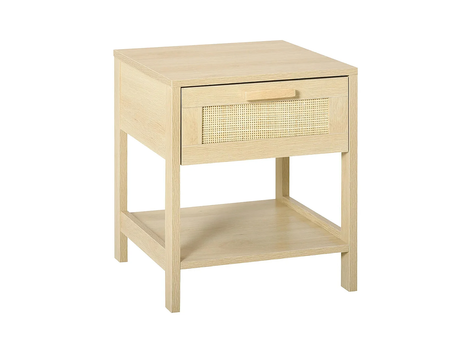 Table de chevet avec tiroirs et étagères, en rotin tressé, dimensions : 40 L x 40 l x 48 H cm, aspect bois clair naturel.