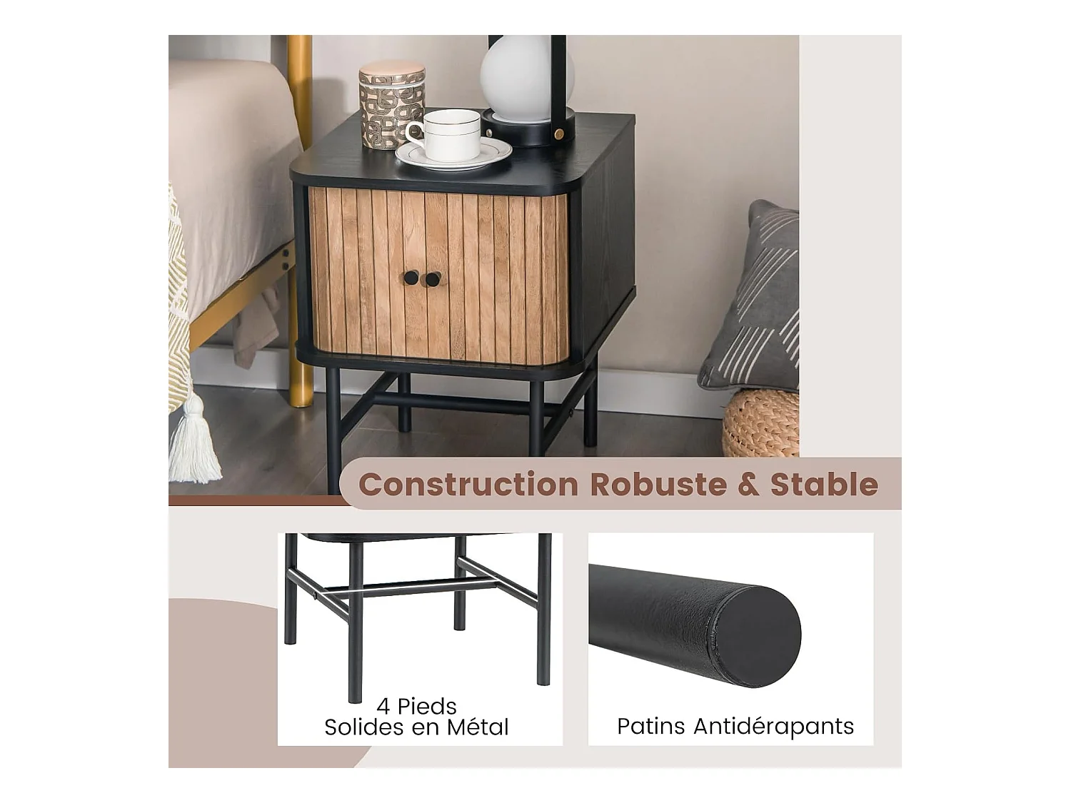 Table de Chevet, Bout de Canapé avec Portes Coulissantes, Pieds en Métal, Design Latte Milieu du Siècle, Poignée Ronde, 40 x 39 x 49 cm, Noir/Blanc (Noir)