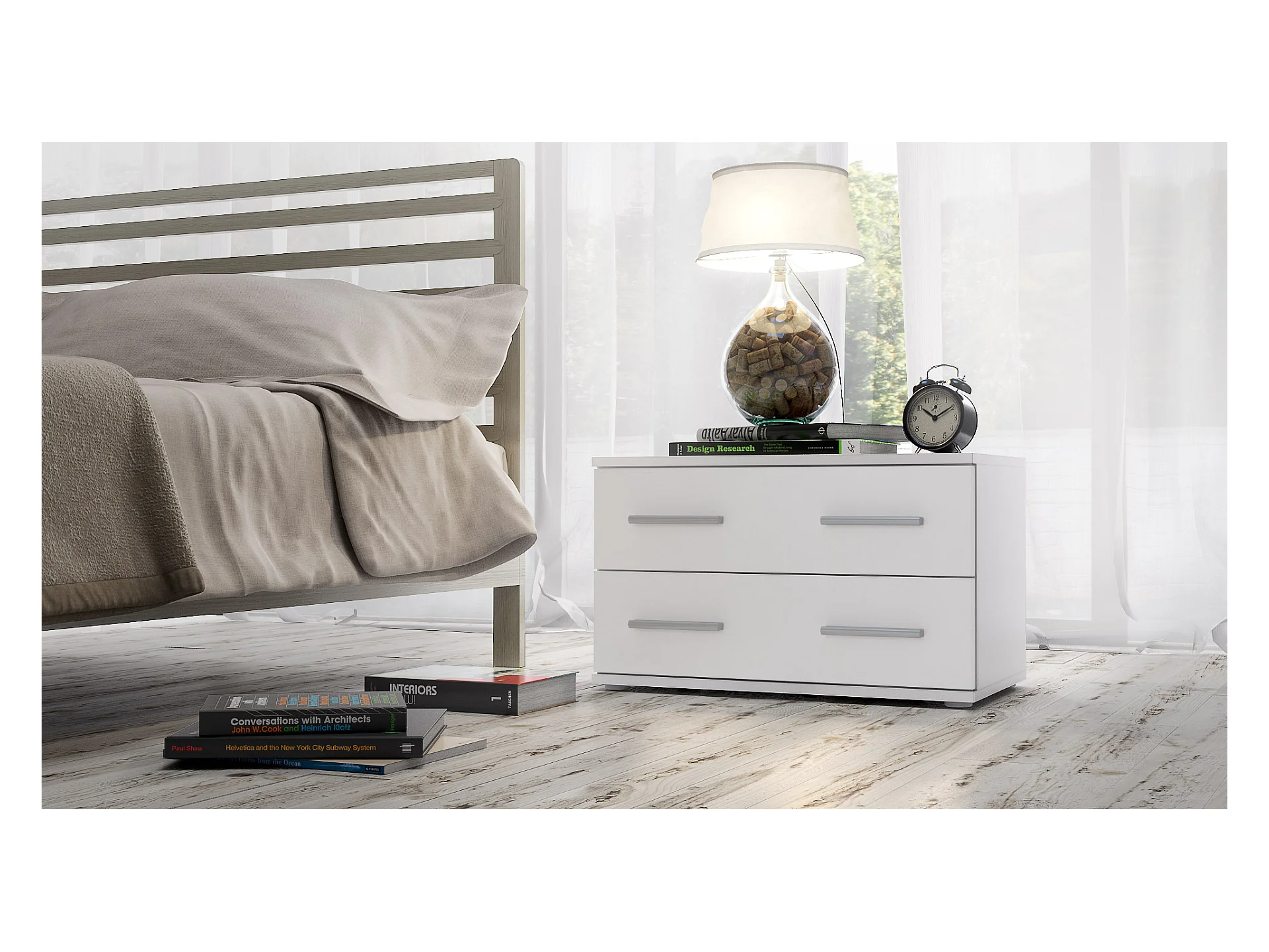 Table de chevet Queens, Table de nuit avec 2 tiroirs et 1 compartiment latéral à fixer au mur, Blanc mat/Blanc haute brillance (60 x 63 x 36 cm)