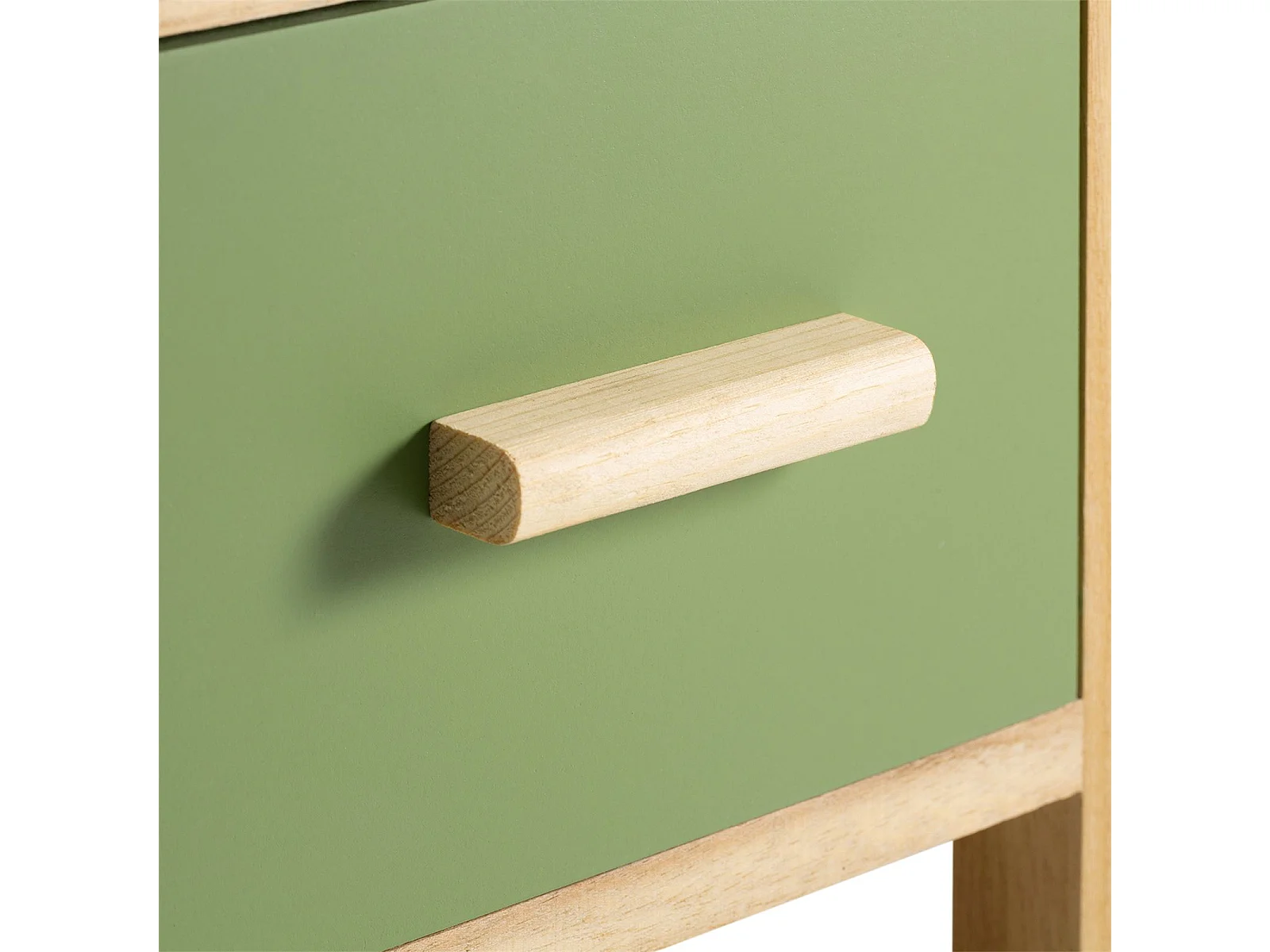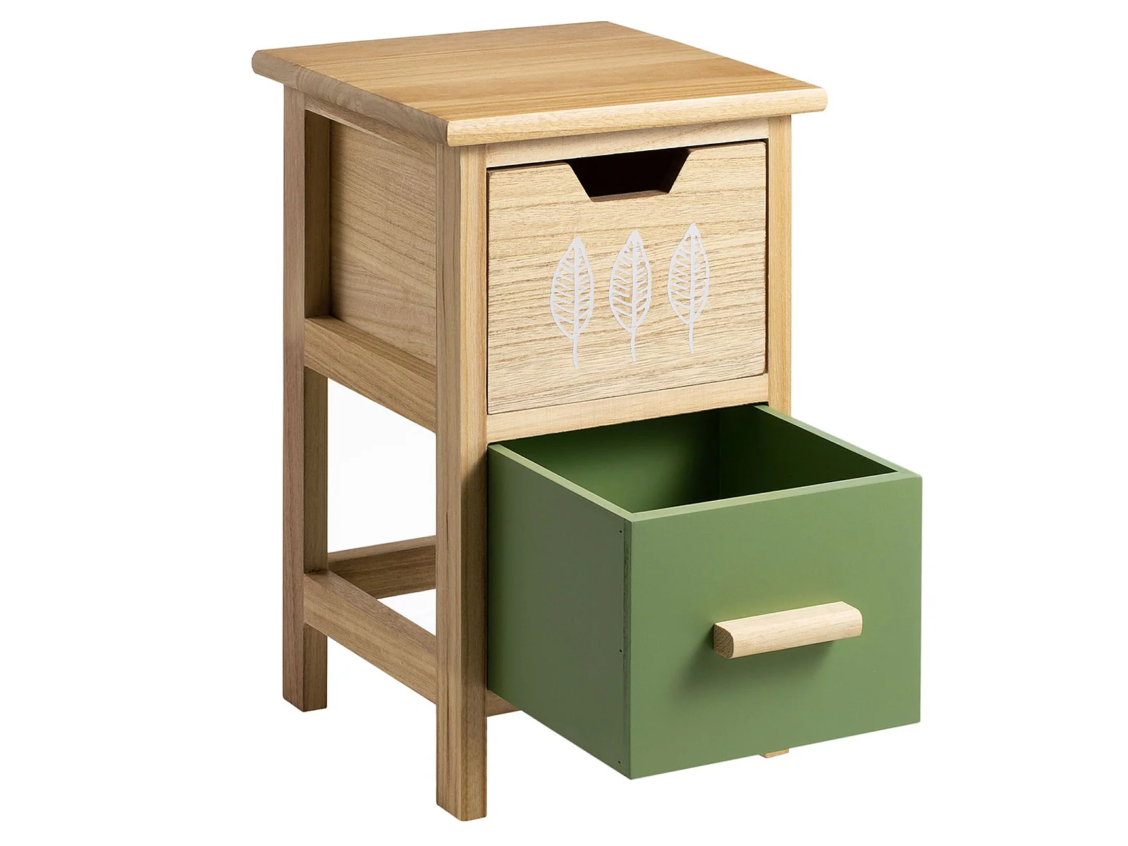 Table de chevet enfant ESTA petite commode en bois de paulownia naturel, 2 tiroirs vert et naturel aux motifs feuilles