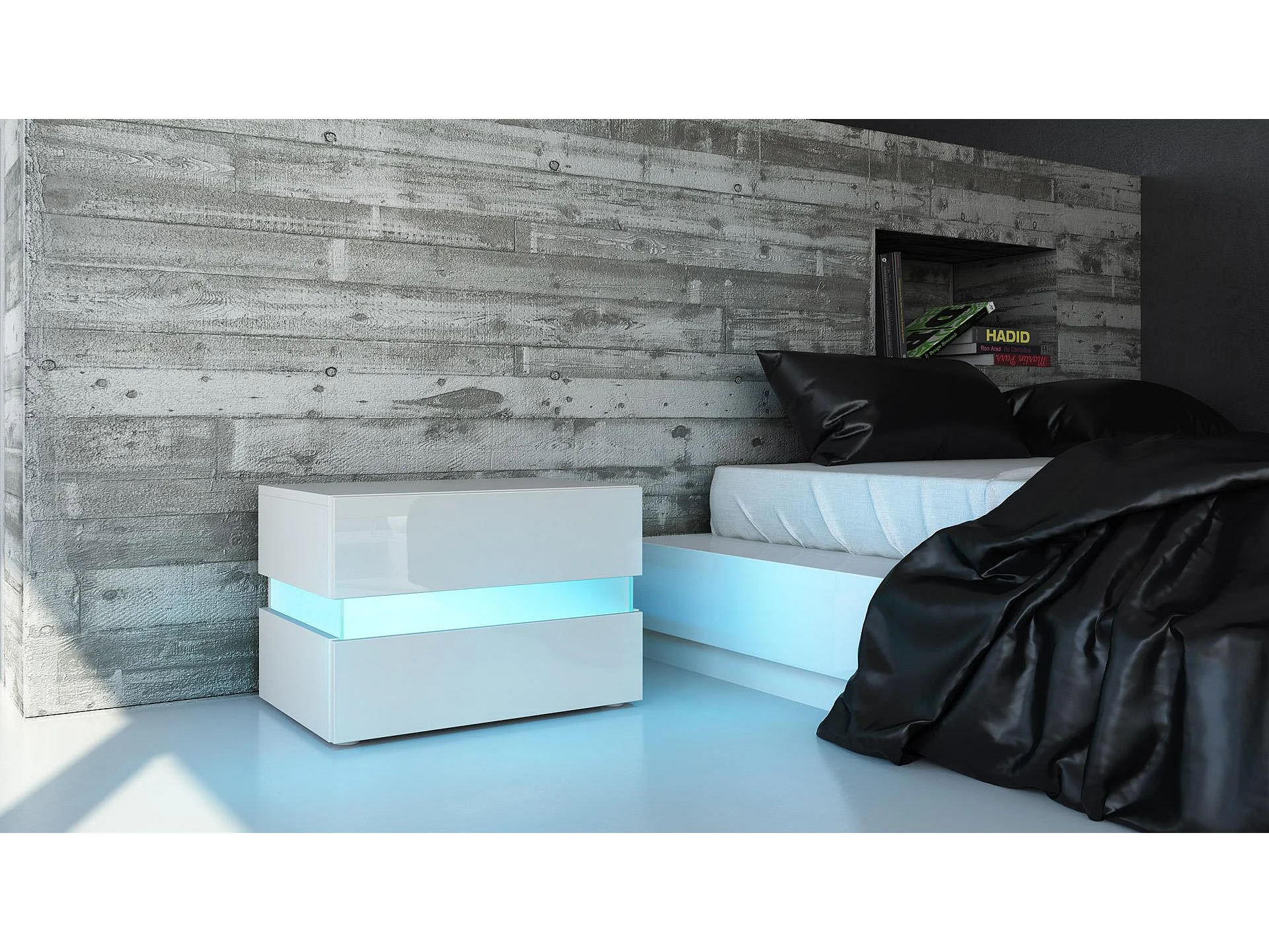 Table de chevet Flow, Table de nuit avec tiroir pour fixation murale, Blanc mat/Blanc haute brillance, éclairage LED inclus (60 x 45 x 39 cm)