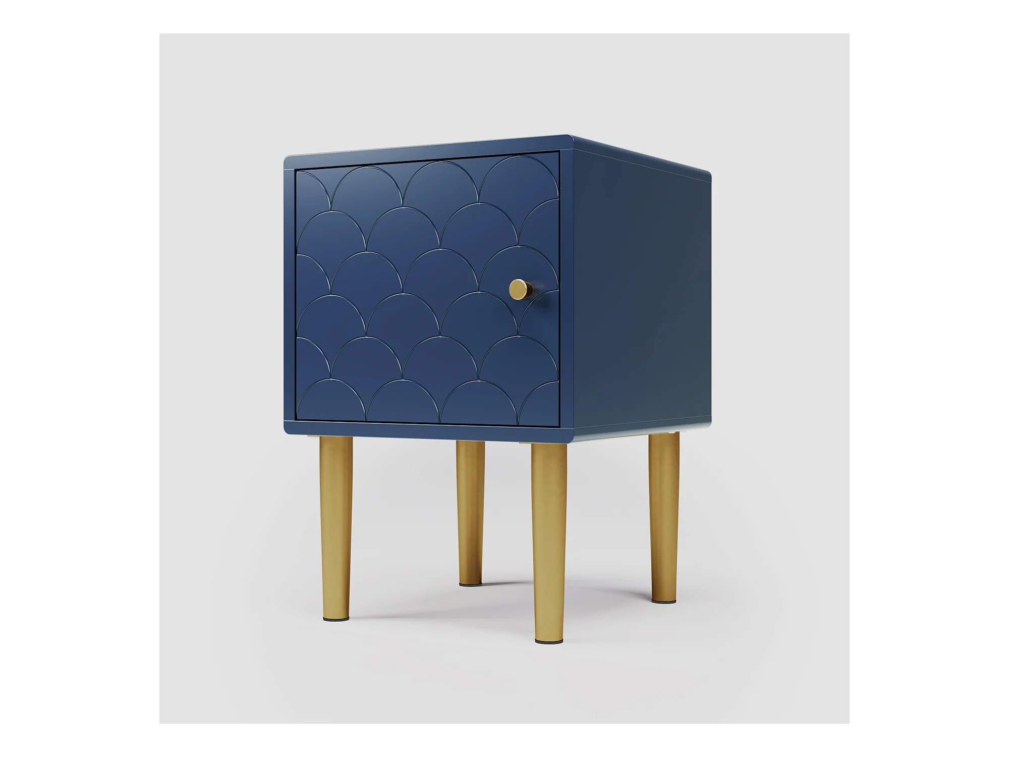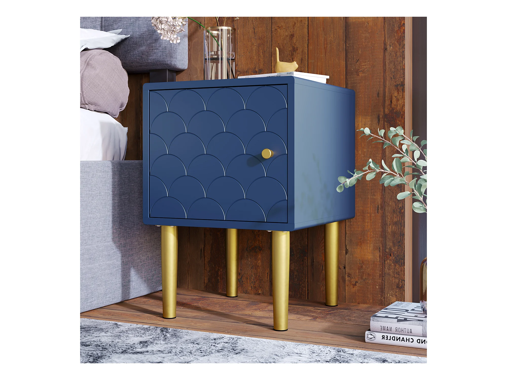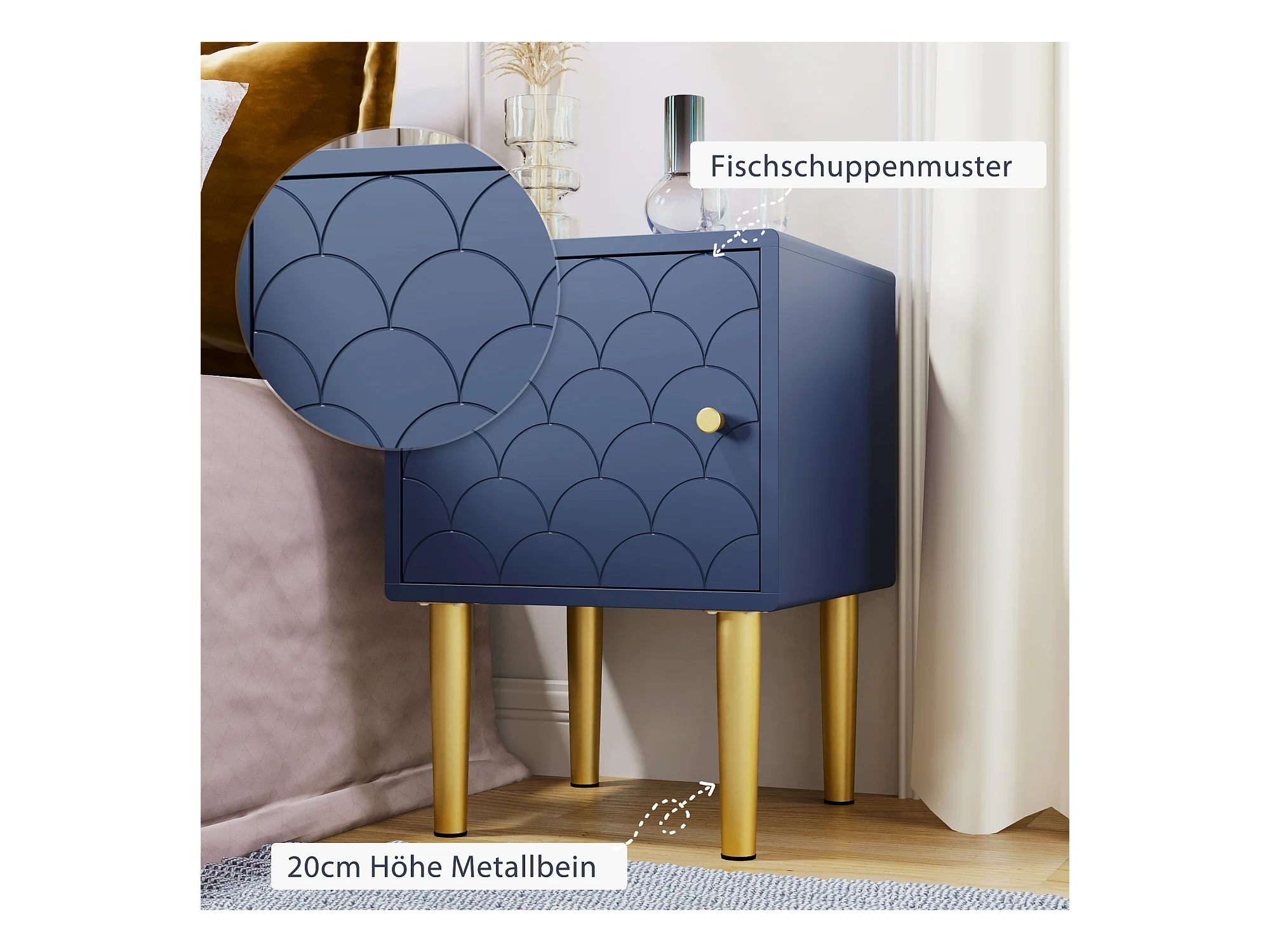 Table de chevet, lot de 2, table d'appoint, bleu marine, motif écailles de poisson, façade en rotin, pieds en métal (H50/L35/P35cm)