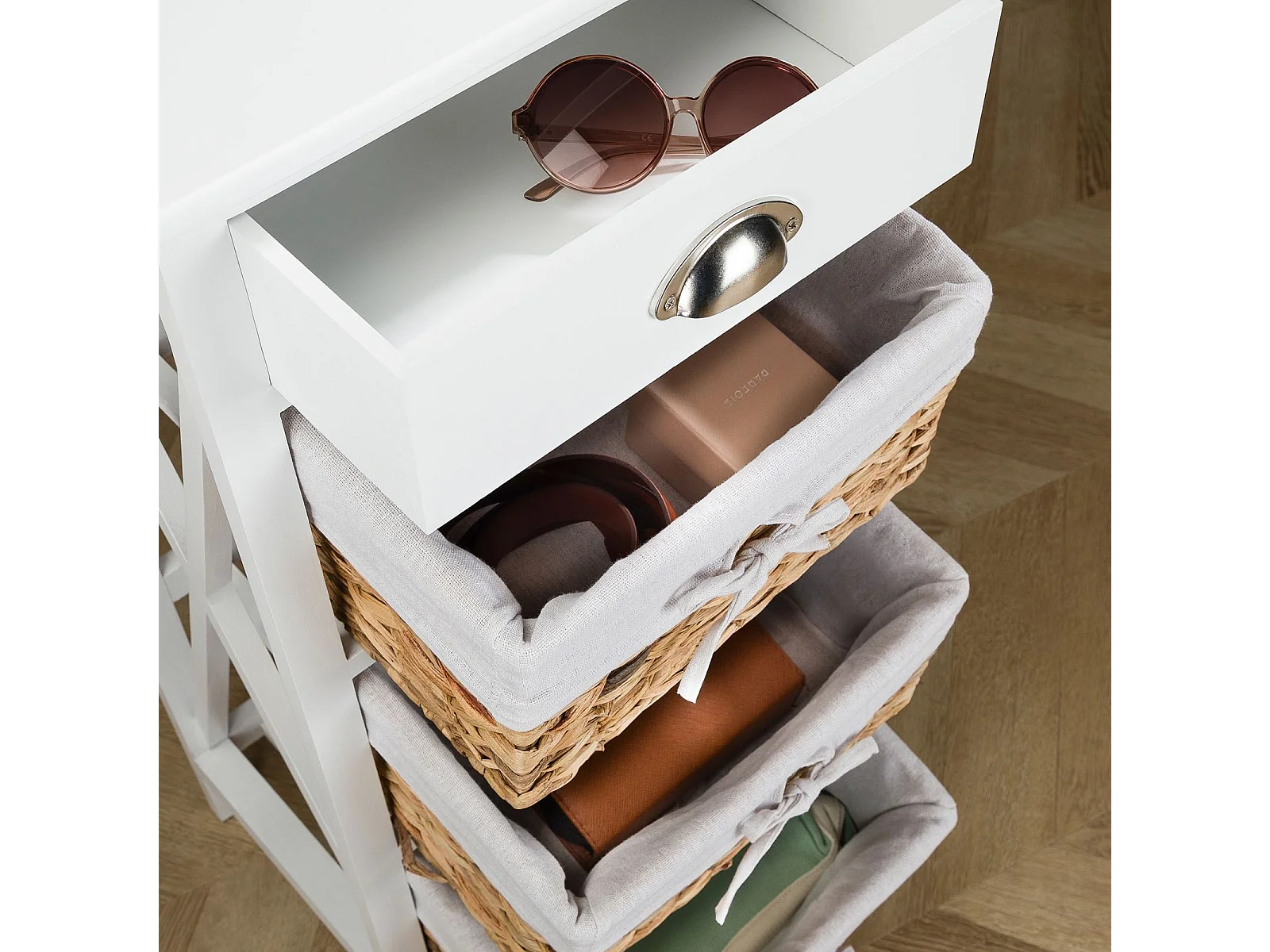 Table de chevet NUSCO table de nuit en bois lasuré blanc avec 1 tiroir et 3 paniers en fibre naturelle et insert en tissu blanc