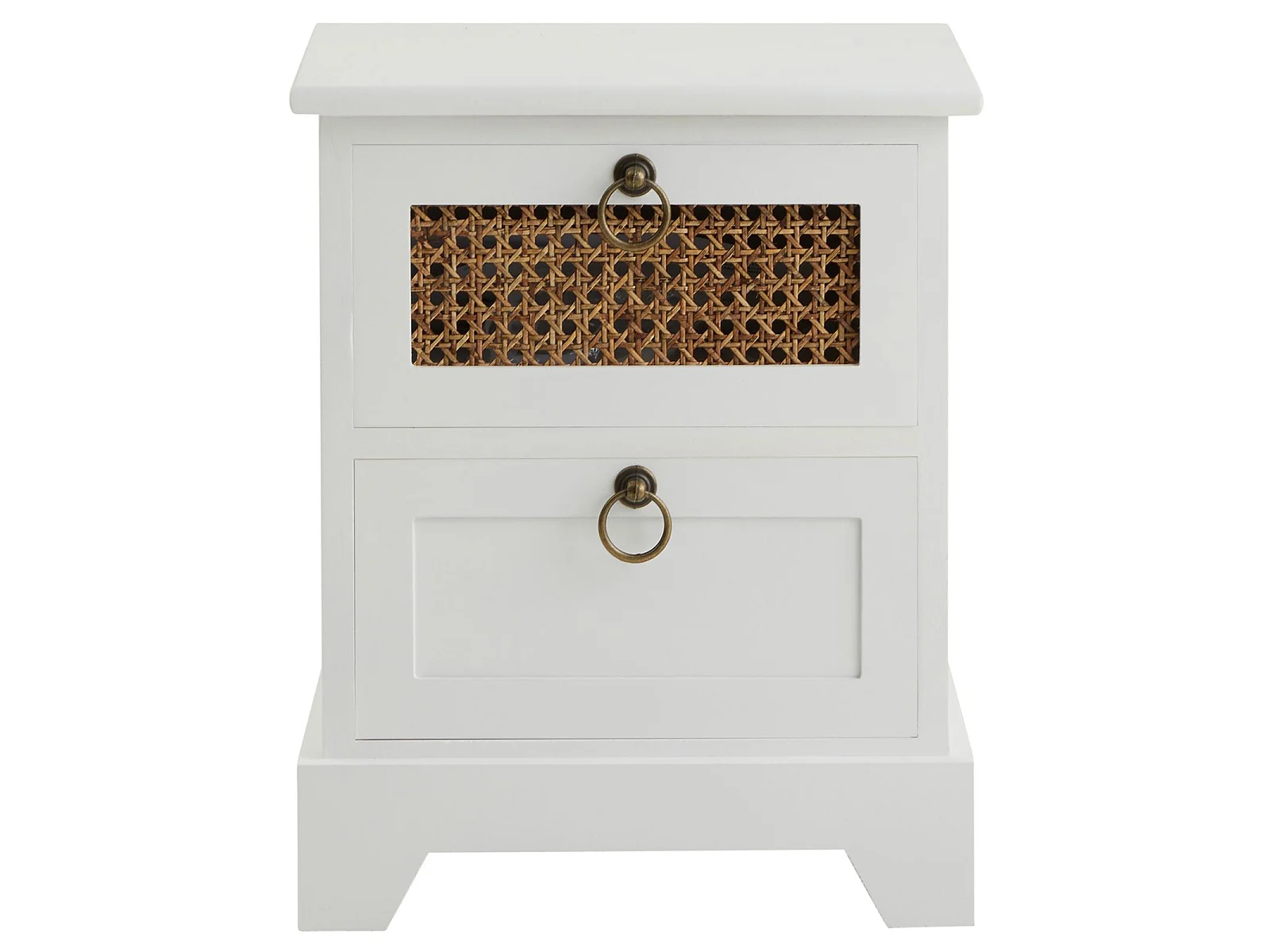 Table de chevet PADMA 2 tiroirs, table de nuit design vintage en bois lasuré blanc et rotin