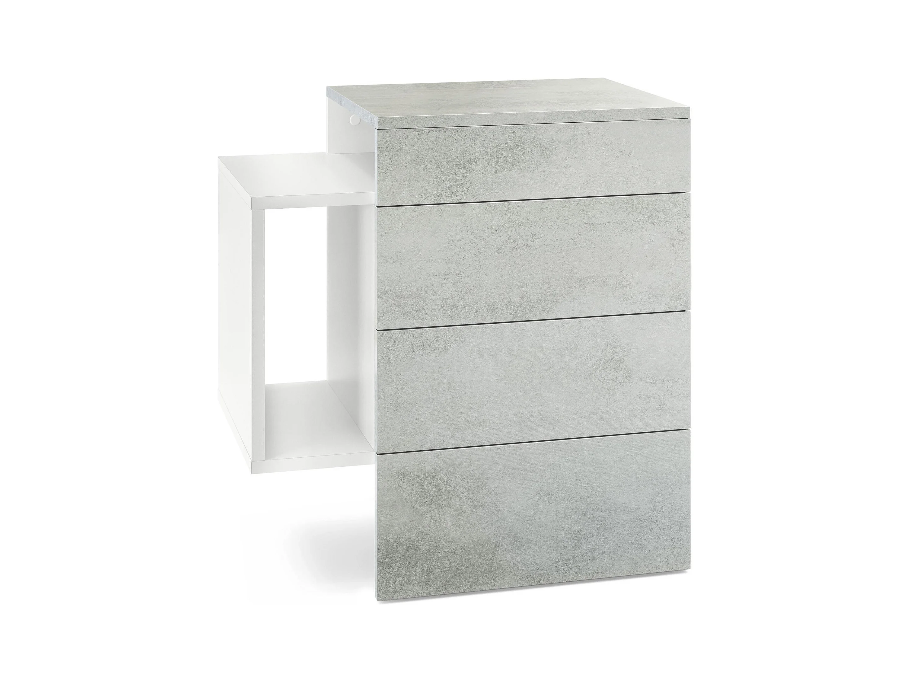 Table de chevet Queens, Table de nuit avec 2 tiroirs et 1 compartiment latéral à fixer au mur, Blanc mat/Aspect Béton Oxyde (60 x 63 x 36 cm)