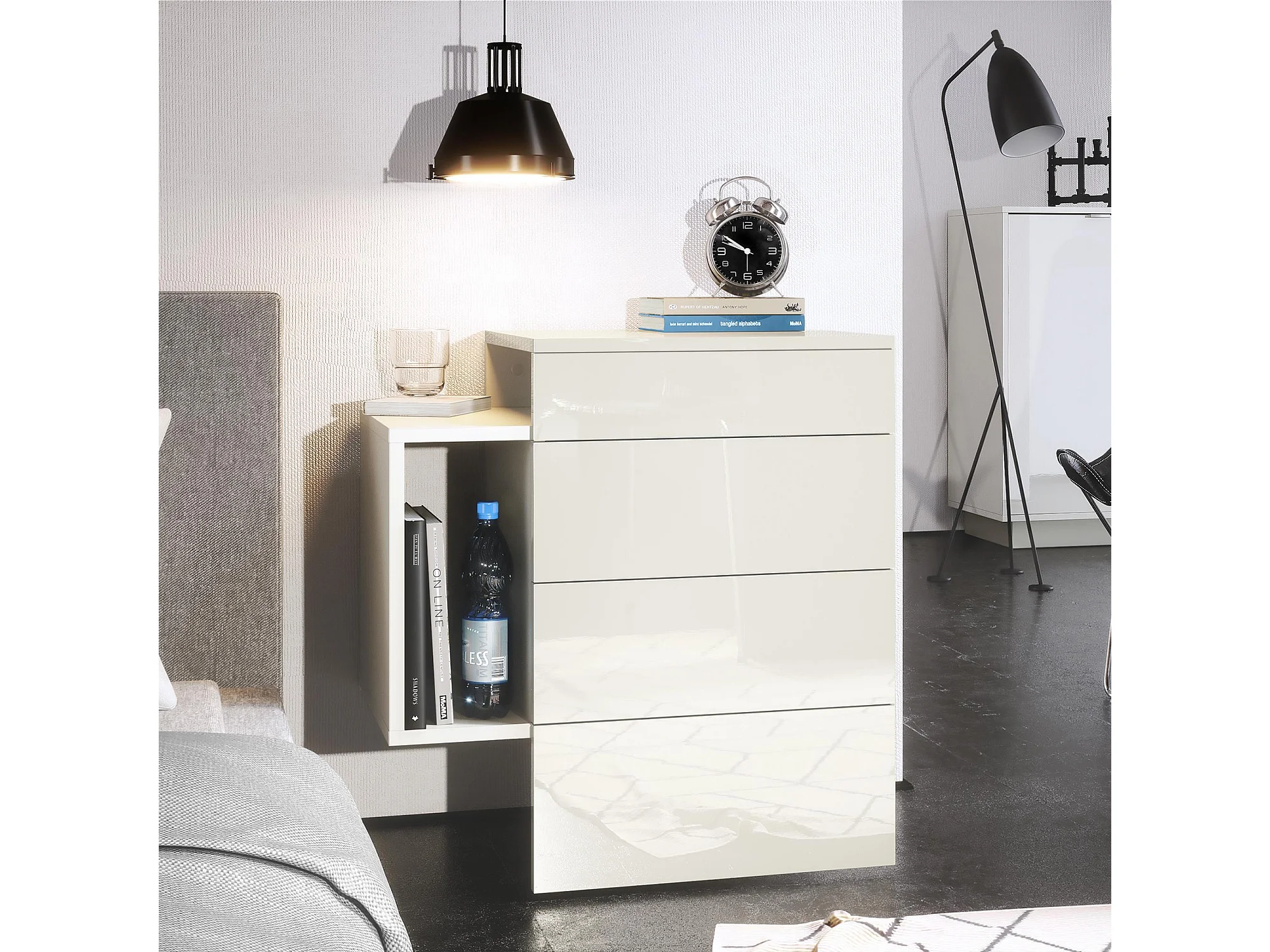 Table de chevet Queens, Table de nuit avec 2 tiroirs et 1 compartiment latéral à fixer au mur, Blanc mat/Blanc haute brillance (60 x 63 x 36 cm)