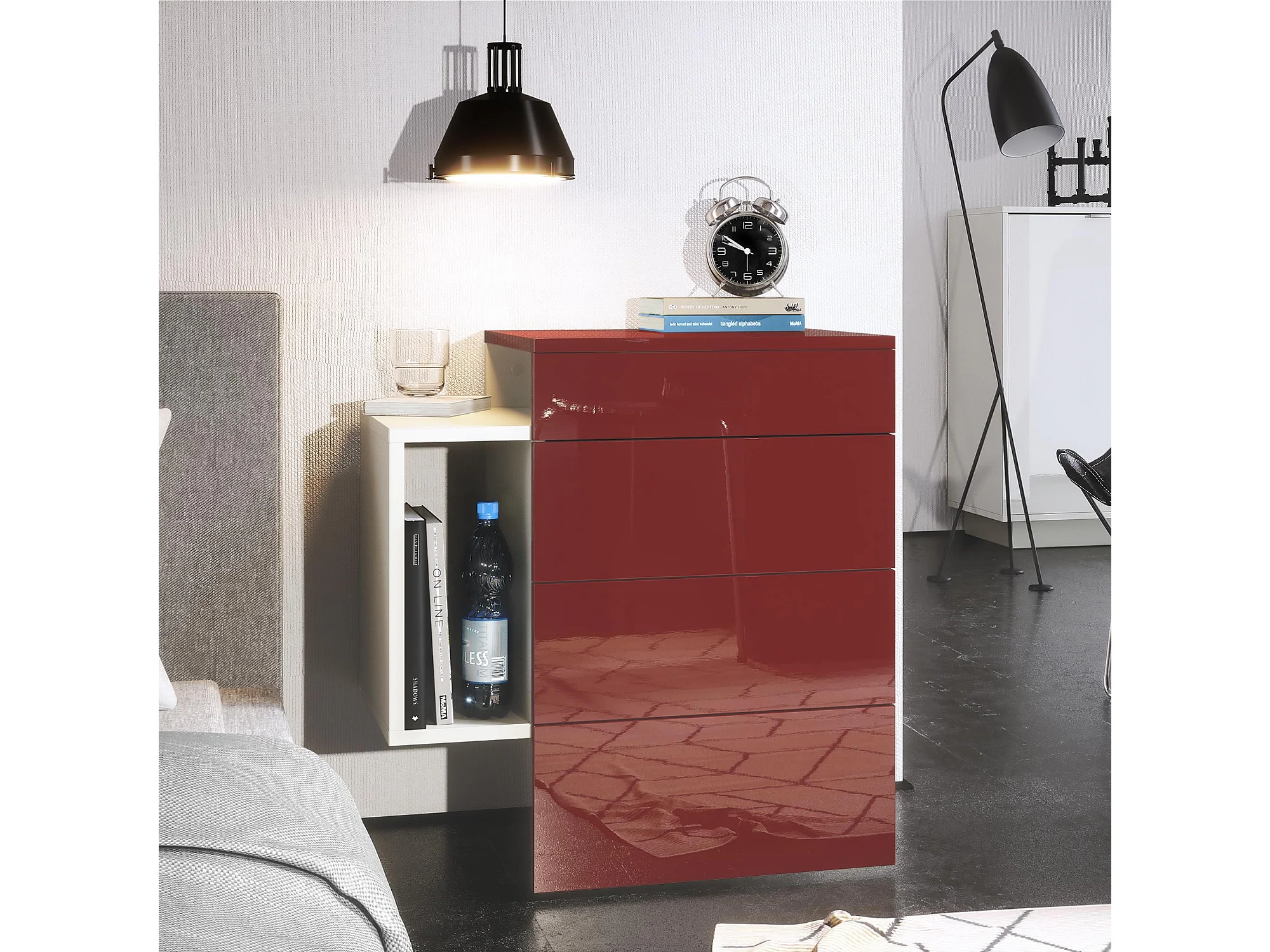 Table de chevet Queens, Table de nuit avec 2 tiroirs et 1 compartiment latéral à fixer au mur, Blanc mat/Bordeaux haute brillance (60 x 63 x 36 cm)