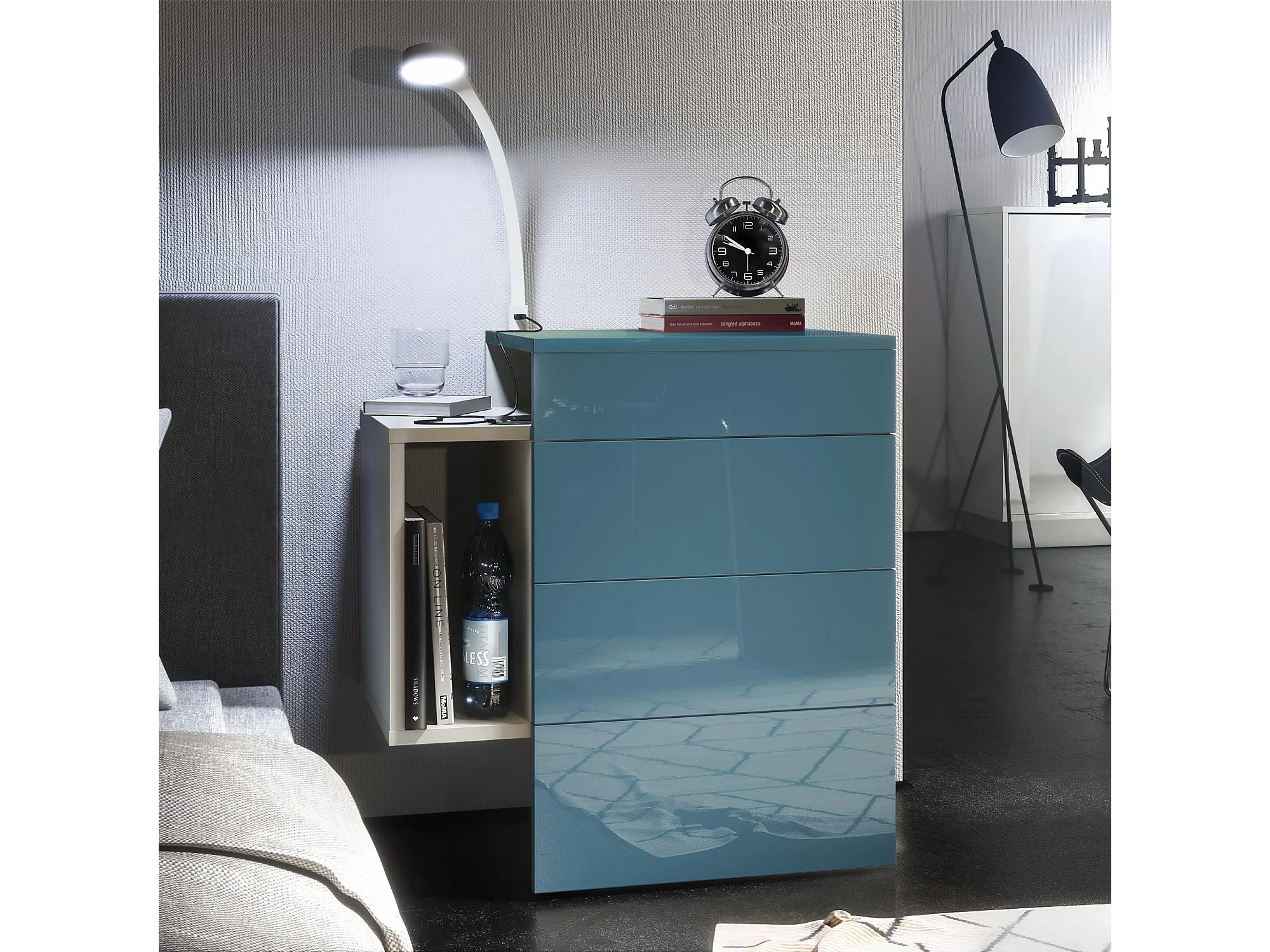 Table de chevet Queens, Table de nuit avec 2 tiroirs et 1 compartiment latéral à fixer au mur, Blanc mat/Turquoise brillant, incl. lampe LED (60x63x36 cm)