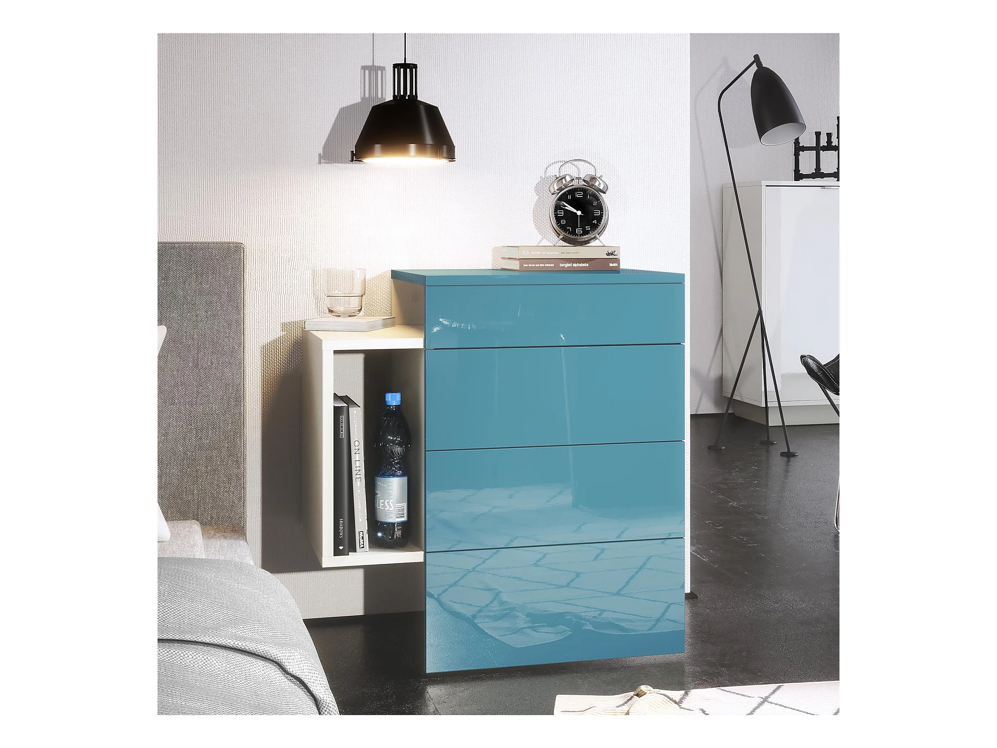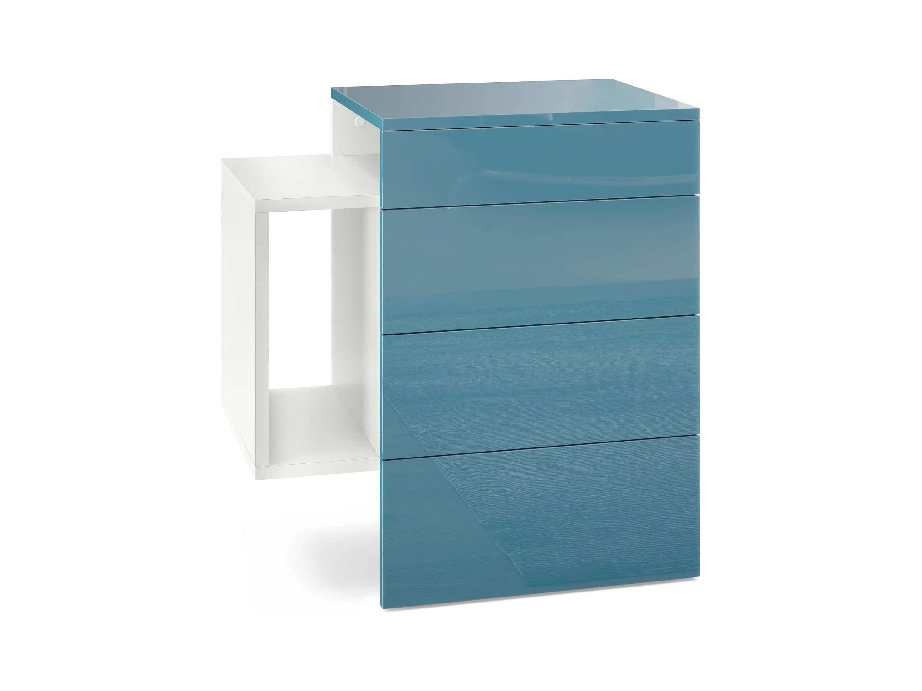 Table de chevet Queens, Table de nuit avec 2 tiroirs et 1 compartiment latéral à fixer au mur, Blanc mat/Turquoise haute brillance (60 x 63 x 36 cm)
