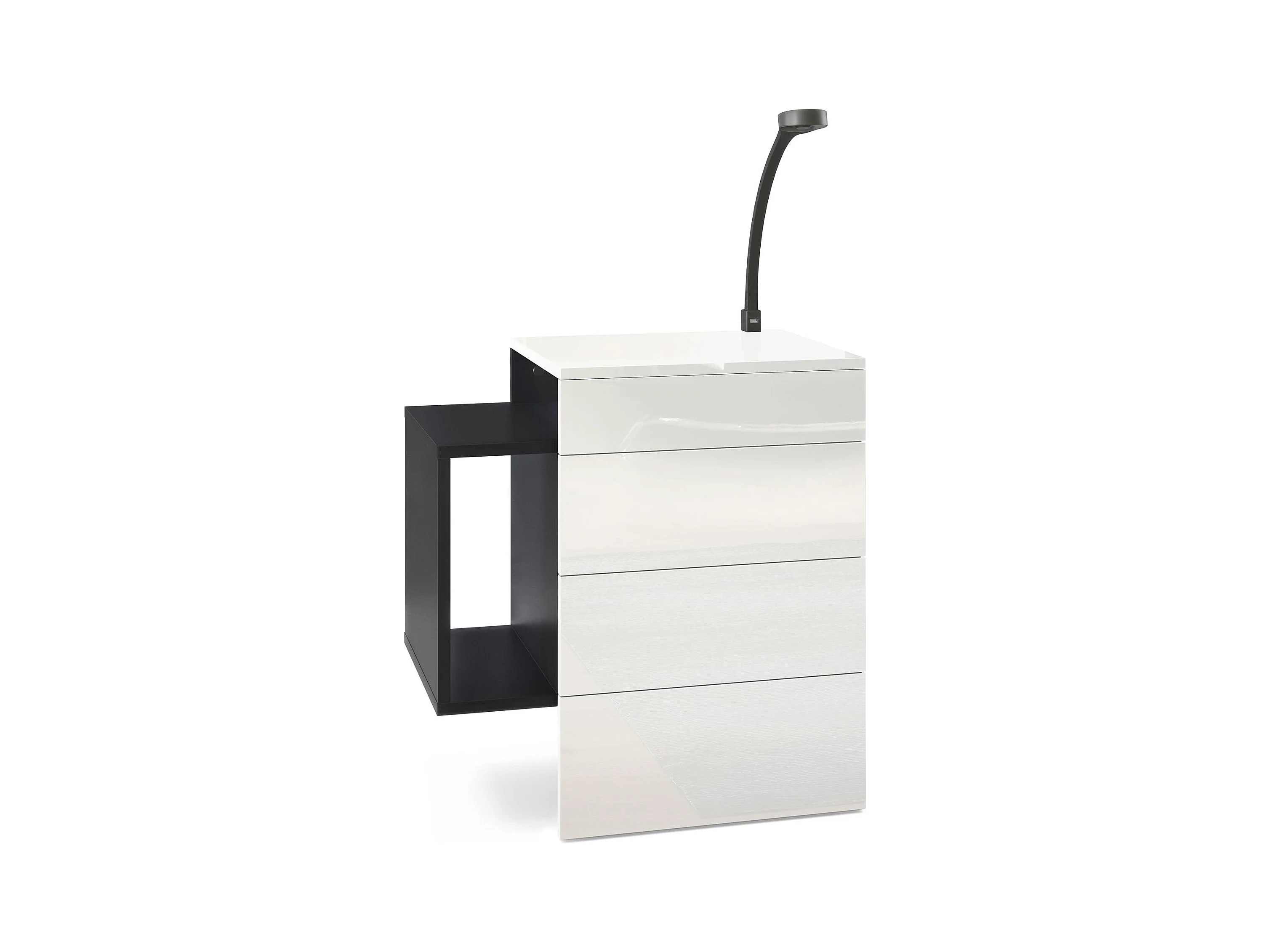 Table de chevet Queens, Table de nuit avec 2 tiroirs et 1 compartiment latéral à fixer au mur, Noir mat/Blanc brillant, incl. lampe LED Flexi (60x63x36 cm)