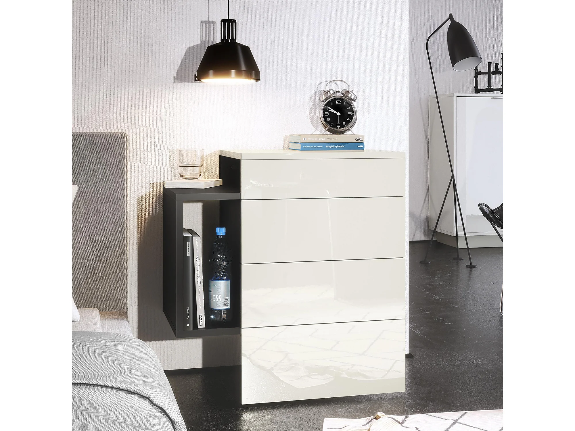Table de chevet Queens, Table de nuit avec 2 tiroirs et 1 compartiment latéral à fixer au mur, Noir mat/Blanc haute brillance (60 x 63 x 36 cm)