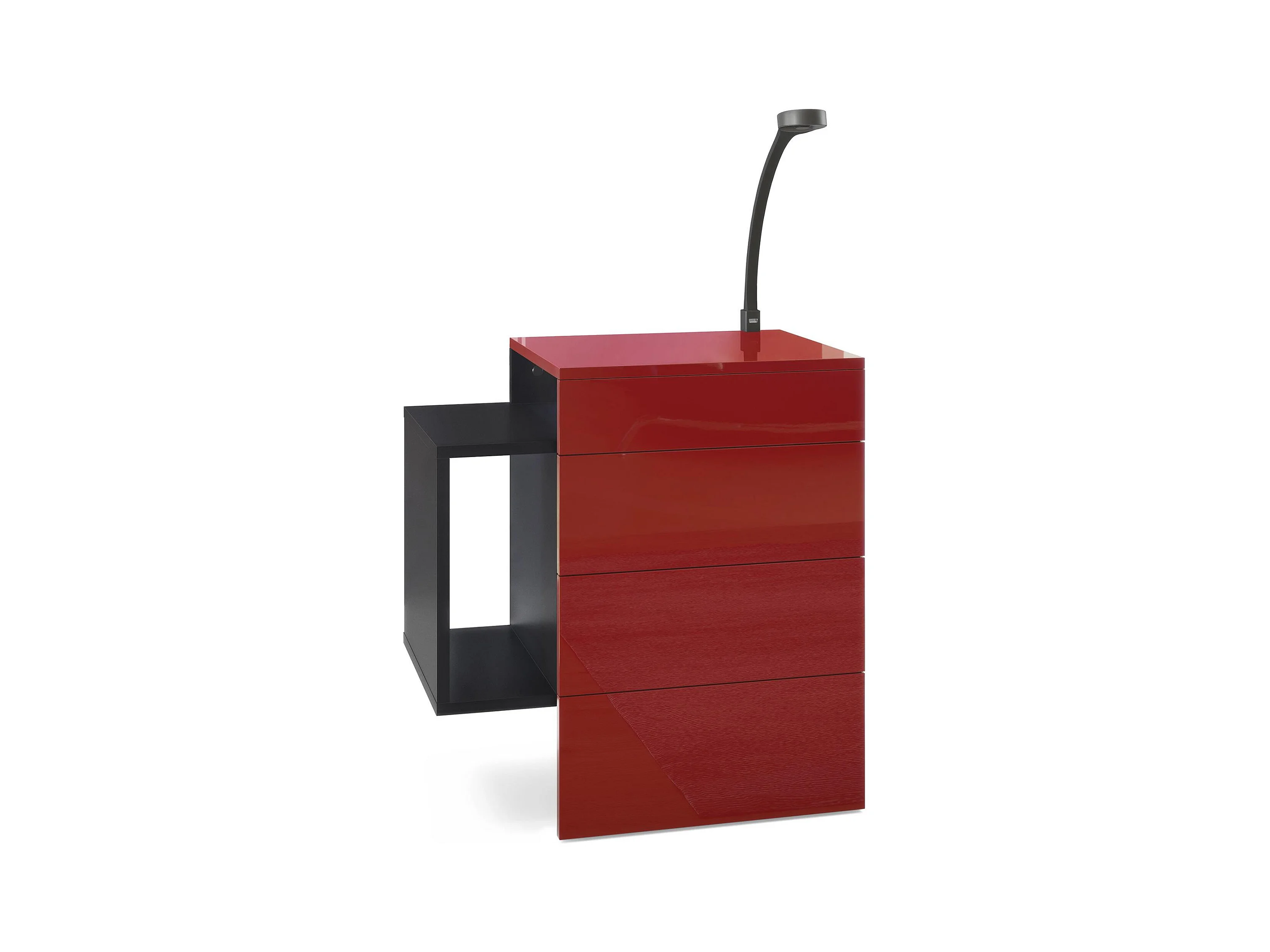 Table de chevet Queens, Table de nuit avec 2 tiroirs et 1 compartiment latéral à fixer au mur, Noir mat/Bordeaux brillant, incl. lampe LED Flexi (60x63x36 cm)