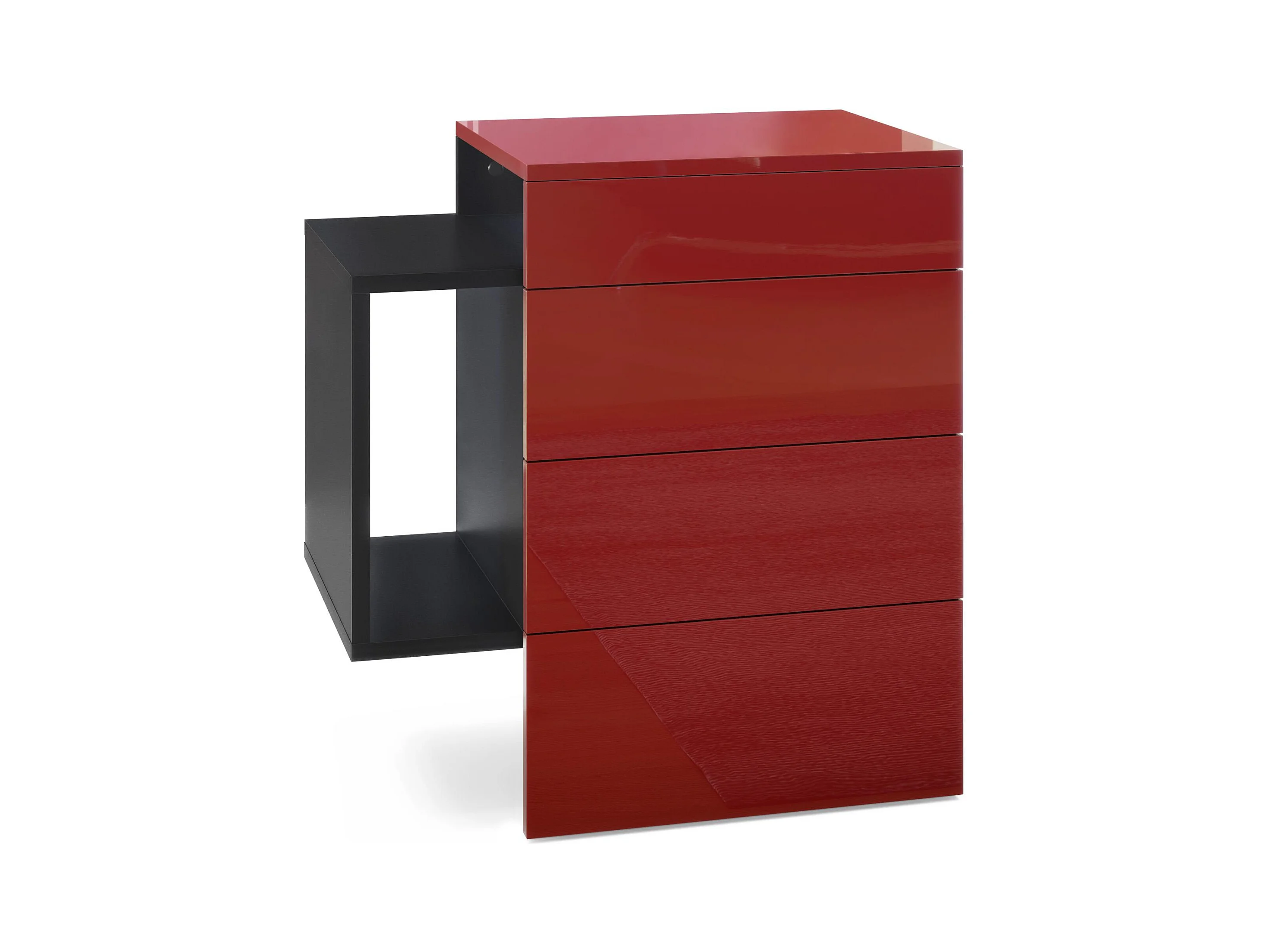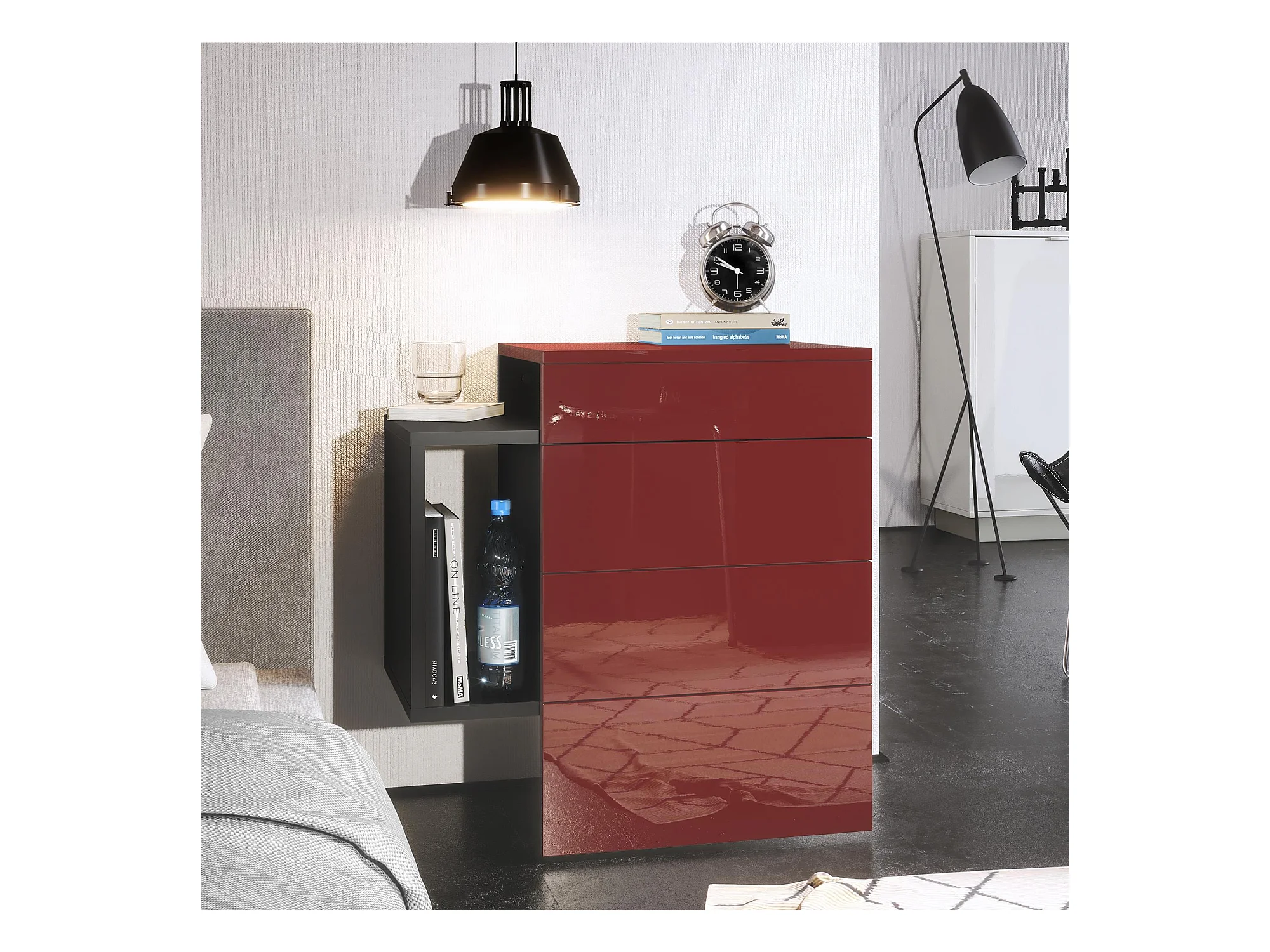 Table de chevet Queens, Table de nuit avec 2 tiroirs et 1 compartiment latéral à fixer au mur, Noir mat/Bordeaux haute brillance (60 x 63 x 36 cm)