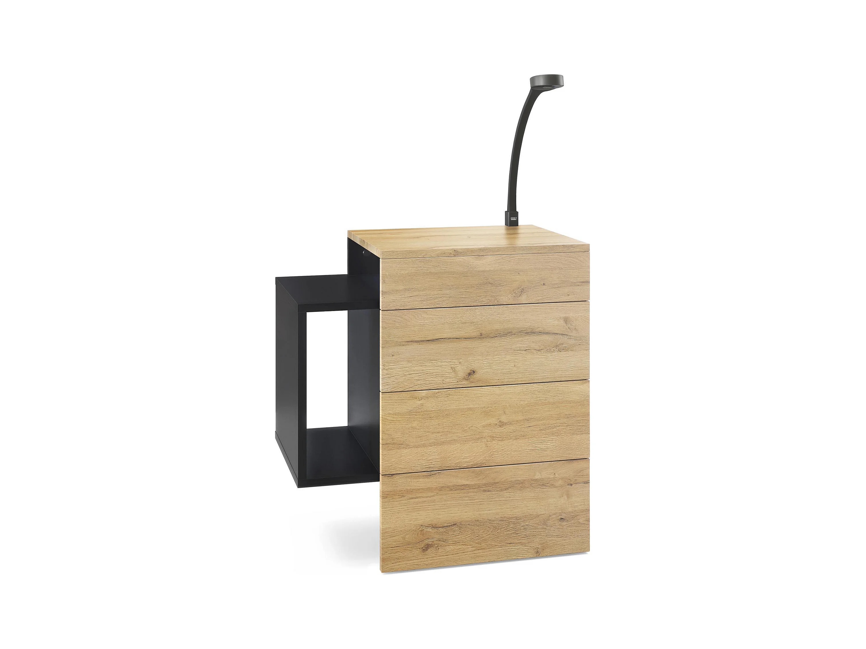 Table de chevet Queens, Table de nuit avec 2 tiroirs et 1 compartiment latéral à fixer au mur, Noir mat/Chêne Nature, incl. lampe LED Flexi (60x63x36 cm)