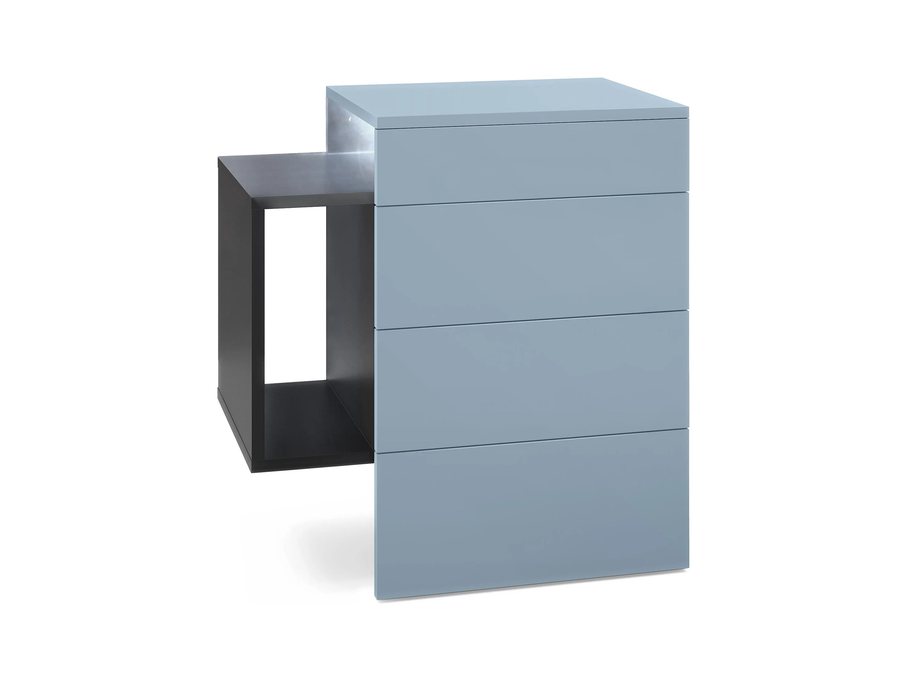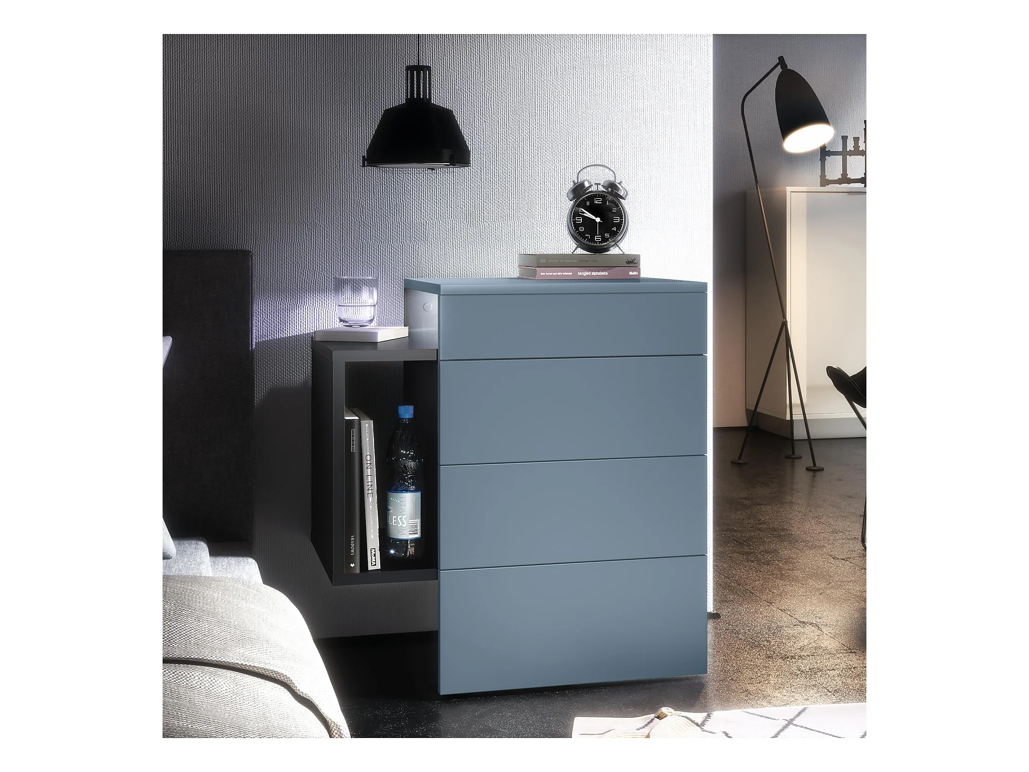 Table de chevet Queens, Table de nuit avec 2 tiroirs et 1 compartiment latéral à fixer au mur, Noir mat/Denim mat, incl. spot encastré LED blanc (60x63x36 cm)