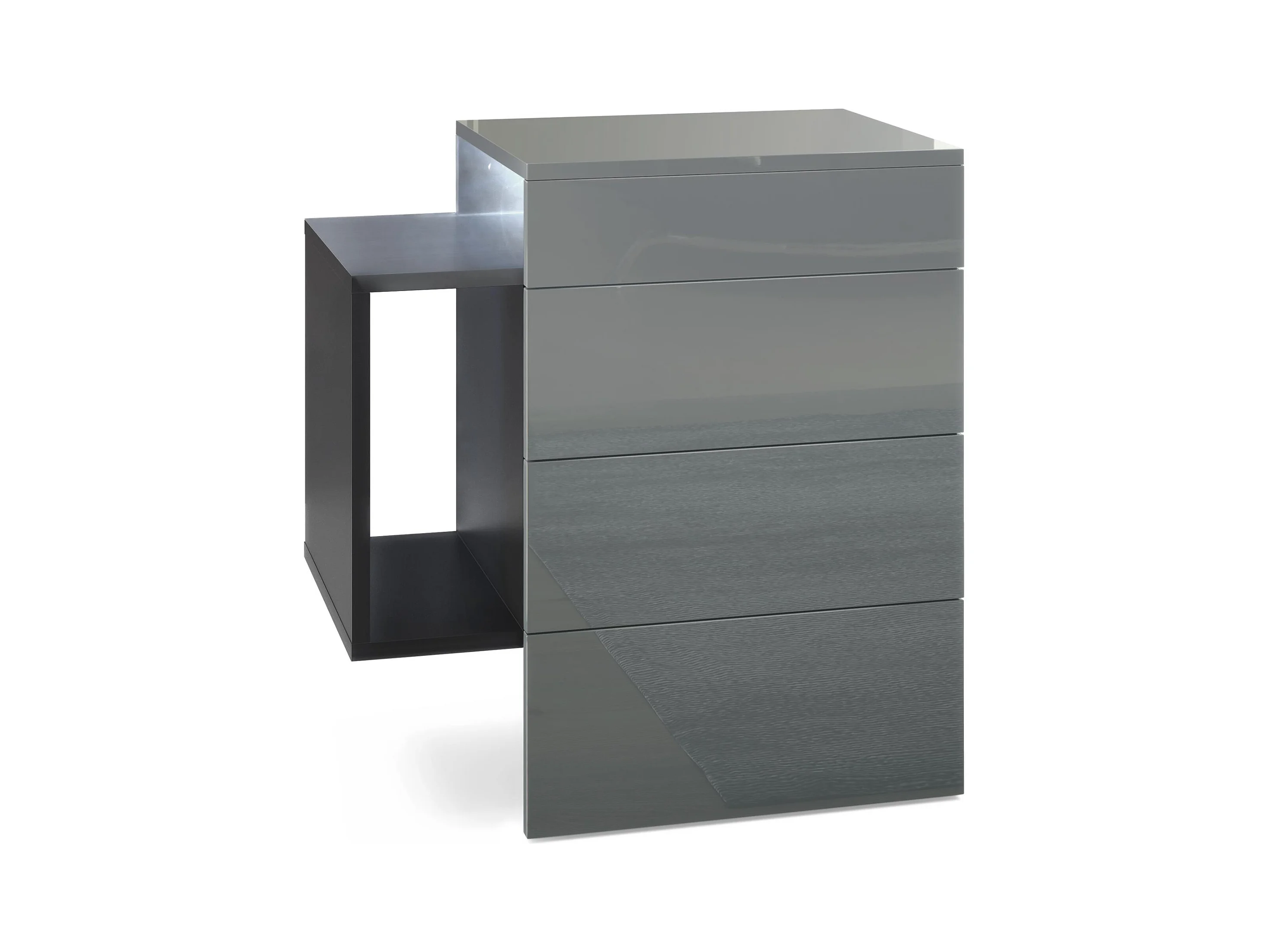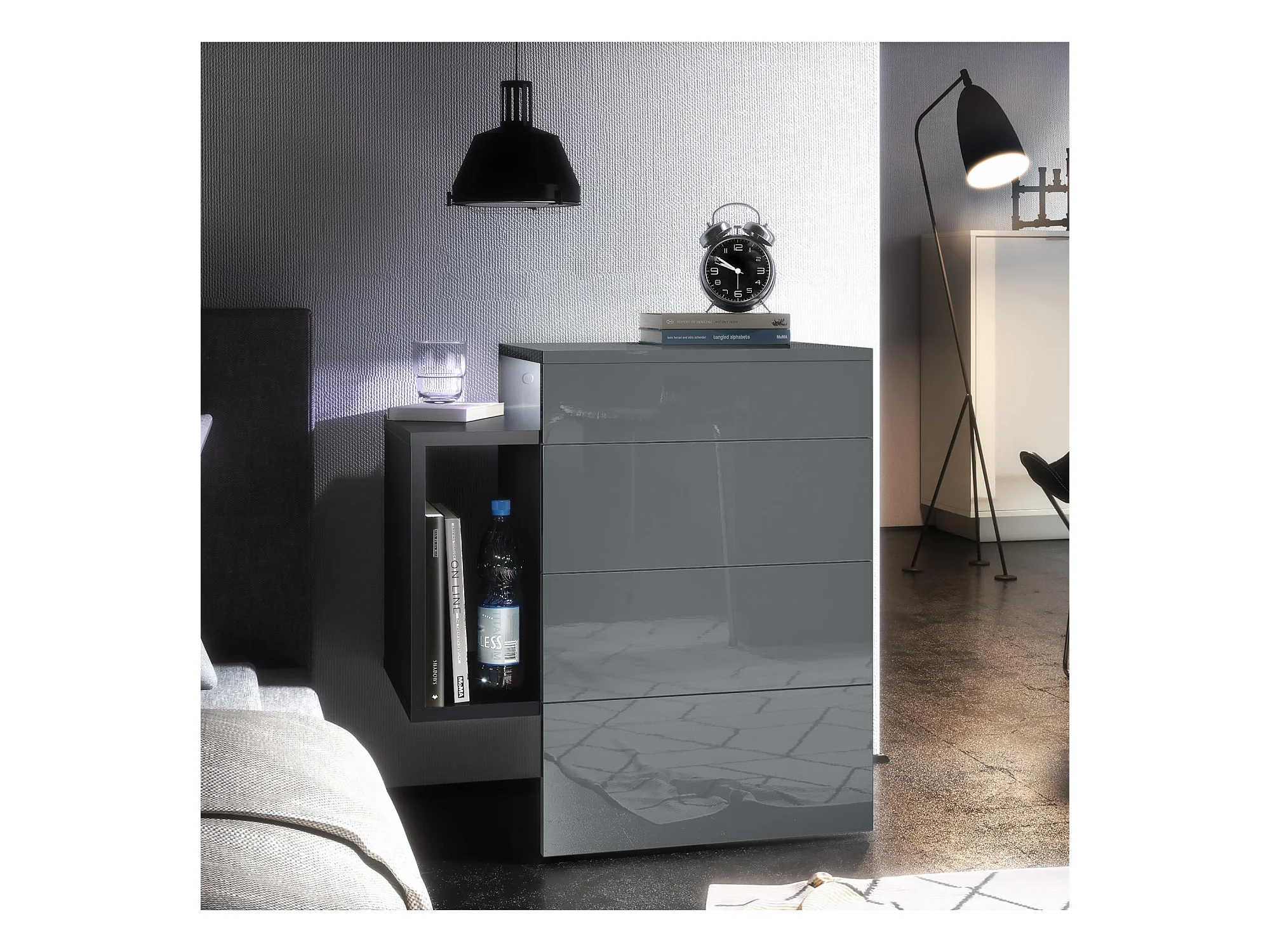 Table de chevet Queens, Table de nuit avec 2 tiroirs et 1 compartiment latéral à fixer au mur, Noir mat/Gris brillant, incl. LED blanc (60x63x36 cm)